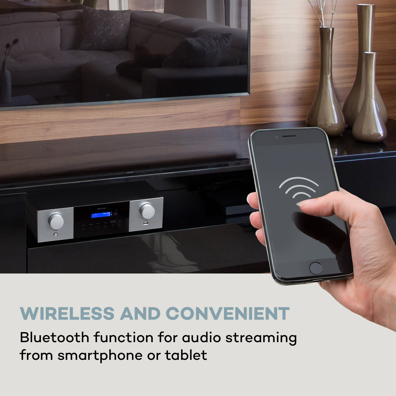 auna AMP-4000 DAB je Hi-Fi stereo zosilňovač s integrovanou funkciou rádia DAB+ pre váš domáci zvukový systém. Na zadnej strane sú 4 reproduktorové zóny, každá s výkonom 100 W RMS. Vďaka optickému vstupu, dvom koaxiálnym vstupom a možnosti pripojenia externých zariadení cez Bluetooth máte jednoduchý prístup k mnohým zdrojom zvuku. Okrem toho sa na dobre vybavenom zadnom paneli modelu AMP-4000 DAB nachádza vstup AUX, výstup line-out a 3 stereo vstupy RCA na pripojenie prehrávačov CD a DVD. Zvuková výbava je doplnená ľahko prístupným slotom USB na prednej strane. Ako je zvykom pri zosilňovačoch , hlasitosť, výšky, basy a basy si môžete nastaviť podľa vlastných preferencií. Centrálny LED displej a dodávané diaľkové ovládanie zabezpečujú jednoduchú obsluhu. Jeho dva hliníkové predné panely vytvárajú diskrétny akcent a vďaka nim vyzerá stereo zosilňovač auna AMP-4000 DAB elegantne a štýlovo.