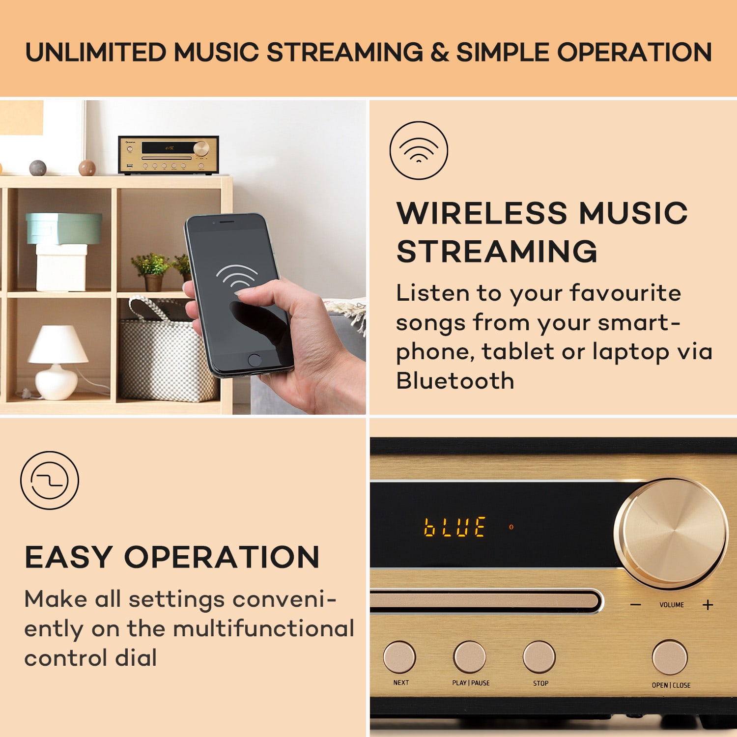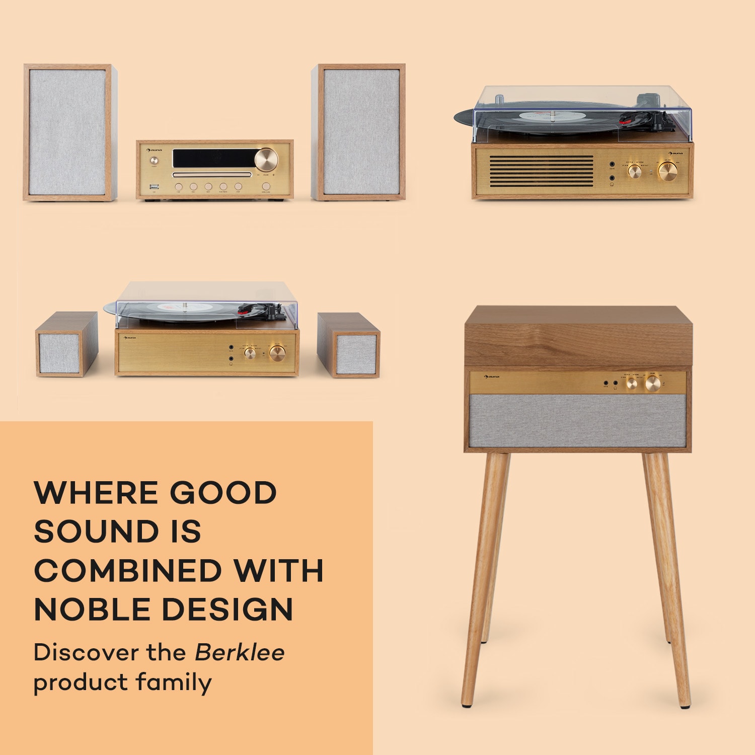 S HiFi stereo systémom Berklee od auna získate luxusný svetový prijímač a CD prehrávač zároveň. Nezáleží či rock, pop, jazz, klasika alebo napínavé správy z celého sveta – so stereo systémom Berklee ste vždy na prijme. Vďaka systému môžete prehrávať celé zbierky CD a cez Bluetooth pripojiť iné hudobné prehrávače ako počítač, laptop alebo smartfón. Tento kompaktný hudobný systém má k dispozícii aj Line-In pripojenie ako aj USB port: jednoducho pripojte iné zariadenie alebo USB kľúč a užívajte si vašu obľúbenú hudbu v MP3 formáte. Nechajte vaše obľúbené piesne zaznieť vo vysokej kvalite: HiFi stereo systém Berklee od auna môžete úplne pohodlne obsluhovať malým diaľkovým ovládačom alebo pomocou intuitívnej ovládacej plochy priamo na zariadení. Aktuálne funkcie sú zobrazené na decentnom prednom displeji – klasický dizajn a oddelené reproduktory robia zo systému skutočný dizajnérsky kúsok.Čistý zvuk v luxusnom balení: HiFi stereo systém Berklee od auna spája najnovšiu techniku s klasickou eleganciou.