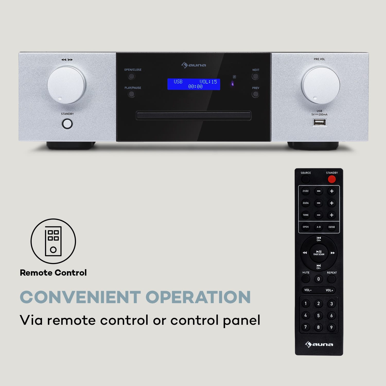 auna CD-1000 DG je klasický CD prehrávač s výsuvným slotom na CD a praktickým diaľkovým ovládaním. Okrem bežných zvukových diskov CD prehráva aj zvukové médiá vo formáte CD-R, RW a MP3. Jeho prehľadný ovládací panel zahŕňa aj LED displej. Okrem toho je na prednej strane CD-1000 DG ľahko prístupný USB slot. Na zadnej strane CD prehrávača nájdete audio výstup na jednoduché pripojenie zosilňovačov, ako aj koaxiálny a optický výstup. Jeho striedmy dizajn pôsobí vďaka hliníkovému prednému panelu stále luxusne. CD prehrávač CD-1000 DG od auna vkusne dopĺňa modernú atmosféru bývania milovníkov Hi-Fi.