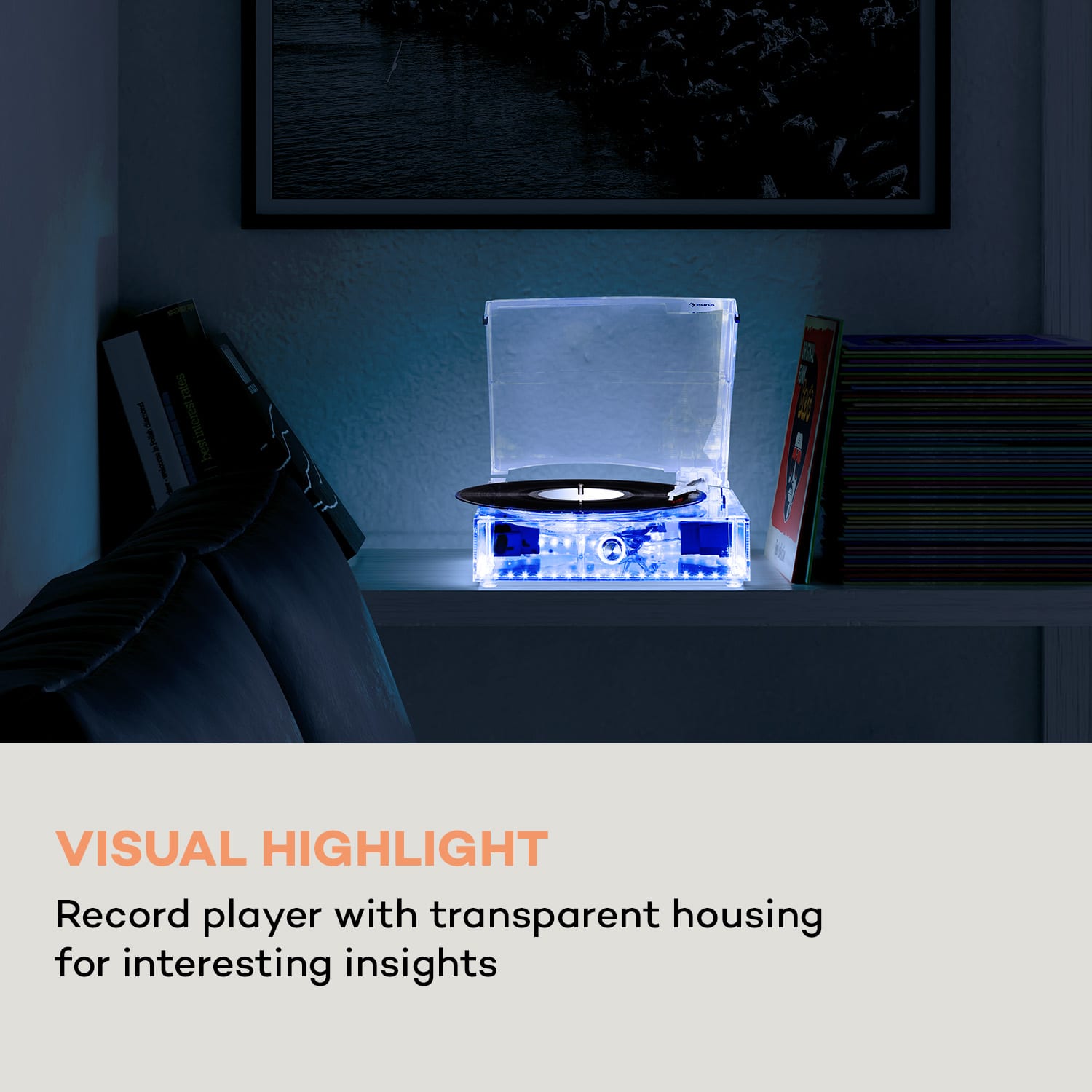 Hudobné zážitky z klasiky s fascinujúcim pohľadom: Štýlový, elegantný a s nenapodobiteľným zvukom, gramofón auna ClearTech vytiahne z vinylových platní skvelé zvuky. Zabudované stereo reproduktory umožňujú okamžité počúvanie gramofóna. Jeho tichý remeňový pohon pracuje pri 33, 45 alebo 78 otáčkach za minútu a je vhodný pre všetky štandardné platne. Okrem klasickej reprodukcie zvuku prostredníctvom ihly vám ClearTech od auna, s pripojením Bluetooth 4.2, ponúka aj možnosť spárovania a streamovania z vášho smartfónu, tabletu alebo iných Bluetooth zariadení. Na zadnej strane je k dispozícii aj vhodný RCA-Linkový výstup a vstup AUX, ktorý umožňuje zapojiť ClearTech do väčšej Hi-Fi zostavy.Gramofón ClearTech od auna je zredukovaný na to najnutnejšie a zaujme jednoduchým ovládaním a modernými komponentami. Jeho priehľadný kryt poskytuje pohľad na jeho techniku a v prípade potreby svieti modrým LED podsvietením, ktoré dotvára atmosféru.