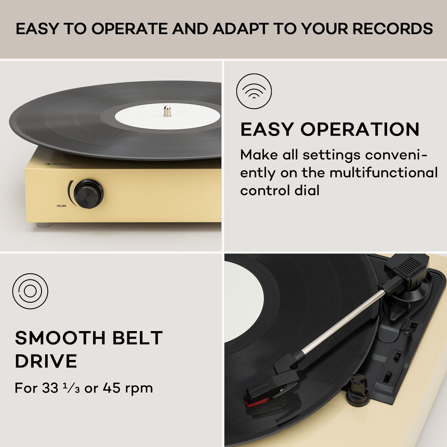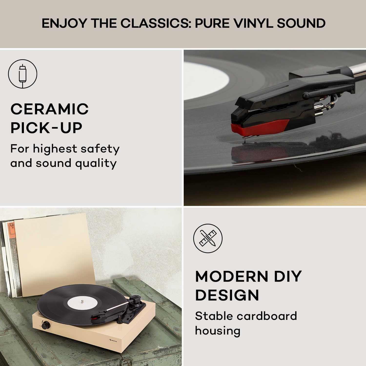 Klasický hudobný zážitok, ktorý si sami vytvoríte: Gramofón The Player od auna nielenže z vinylových platní vytiahne skvelý zvuk, ale urobí radosť aj hobby kutilom. Tento gramofón sa dodáva ako súprava pre domácich majstrov: všetky diely sú k dispozícii a zostavujú sa pomocou jednoduchých pokynov. Puzdro je vyrobené z pevného a štýlového kartónu – samozrejme, všetky potrebné otvory sú preddierované. Samozrejme, skutoční nadšenci môžu gramofón nainštalovať aj do vlastnej skrine.Zredukovaný na to najnutnejšie, gramofón The Player od auna zaujme jednoduchým ovládaním a modernými komponentmi. Jeho tichý remeňový pohon pracuje pri 33 alebo 45 otáčkach za minútu a je vhodný na všetky štandardné platne. Zabudované stereofónne reproduktory zaručujú pôžitok z hudby bez ďalších zariadení. Gramofón môžete pripojiť aj k iným zvukovým zariadeniam prostredníctvom linkového vstupu. K dispozícii je aj výstup na slúchadlá na nerušené počúvanie hudby.Klasická zábava z gramofónových platní, ktorú si môžete vytvoriť sami: Gramofón The Player od auna rozbúši srdce nadšencov.