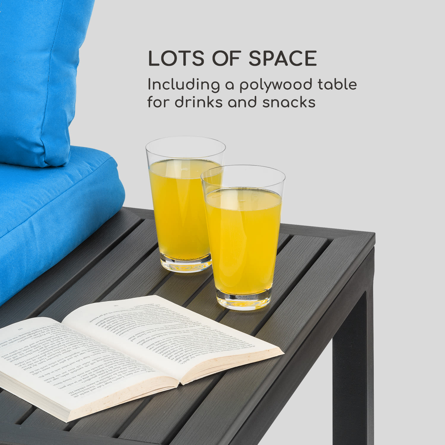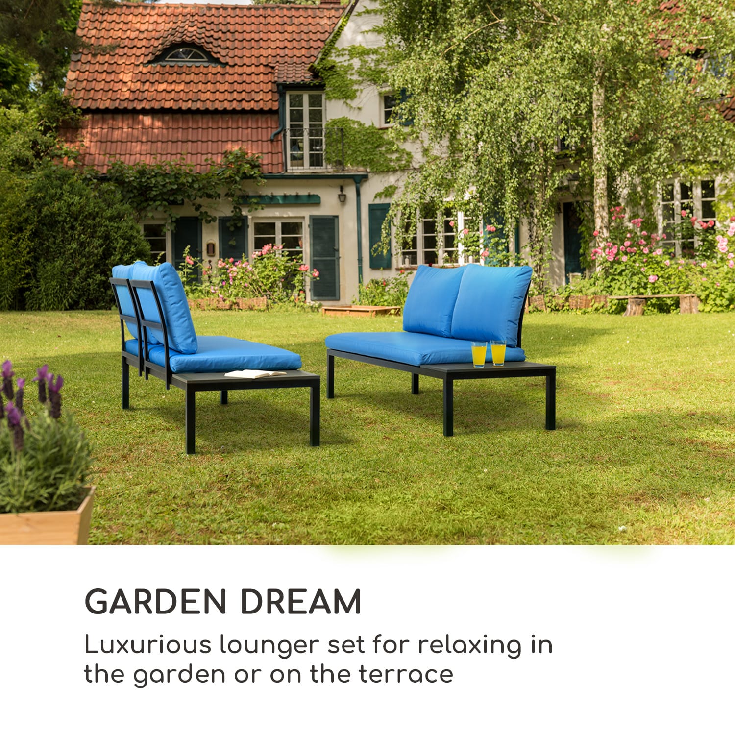 Ležadlo blumfeldt Cartagena zaručuje nielen najvyšší komfort, ale aj maximálnu flexibilitu pri jeho používaní. Ako záhradná súprava na posedenie pri káve s rodinou a priateľmi, ako útulná veľká plocha na ležanie pre romantický odpočinok vo dvojici alebo ako praktická lavica, určite nájdeš svoju kombináciu. Toto záhradné sedenie je ideálne pre každú príležitosť.Ležadlo blumfeldt Cartagena má pevný oceľový rám, ktorý bez problémov odolá hmotnosti až do 240 kg. Každé dvojsedadlo je pre pohodlné sedenie okrem toho vybavené hrubým čalúnením na sedenie a dvomi vankúšmi.Vďaka svojej mimoriadne flexibilnej možnosti montáže a nastavenia je ležadlo blumfeldt Cartagena skutočne šikovné. Dve dvojsedačky sa dajú použiť ako pohodlné dvojité ležadlo, ako záhradný nábytok alebo ako lavička. Opierky chrbta sa dajú flexibilne prispôsobiť tvojmu obľúbenému usporiadaniu. Okrem toho môžeš použiť obidve odkladacie plochy pri ležadlách z materiálu polywood ako stôl alebo podnožku celkom podľa svojich individuálnych potrieb. S dvomi čalúnenými podložkami a 4 vankúšmi môžeš pripraviť pohodlie pre seba aj svojich hostí. Rám z potiahnutých oceľových rúrok je odolný voči poveternostným vplyvom a vankúše aj poťahy sú nepremokavé.Uži si všestrannosť: so záhradným lehátkom blumfeldt Cartagena si vytvoríš svoju vonkajšiu oázu odpočinku presne tak, ako sa ti páči!