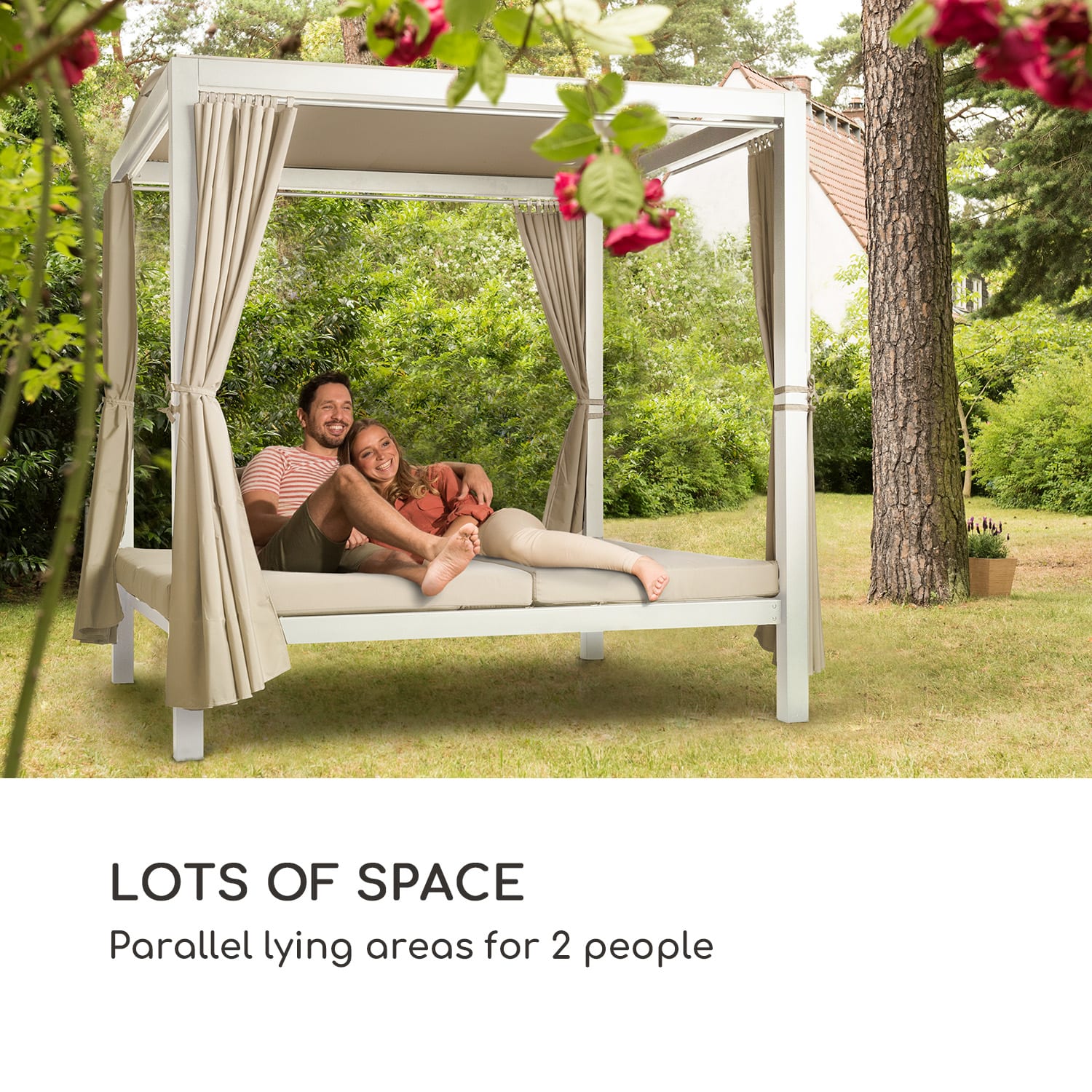 Na čas vo dvojici: záhradné lehátko Blumfeldt Eremitage Double XL sa postará o najvyšší komfort na dvoch extra širokých ložných plochách a so štyrmi bočnými závesmi vytvorí príjemnú intímnu atmosféru vo dvojici.Stabilný, práškom lakovaný oceľový rám tvorí základňu záhradného ležadla Emeritage Double XL, ktoré si bez problémov poradí až do 200 kg záťaže. Na veľkej ložnej ploche si môžete vytvoriť pohodlie a v tieni zaoblenej slnečnej strechy uvoľnene čítať knihu alebo počúvať vaše obľúbené pesničky. O viac intimity sa starajú 4 bočné závesy, ktoré vás nechránia len pred zvedavými pohľadmi susedov, ale vás aj chránia pred slnečnými lúčmi. Opierky chrbta sa dajú úplne individuálne nastaviť v 5 rôznych pozíciách. Takto vždy nájdete optimálny uhol operadla na čítanie, prácu alebo relax. Alternatívne si môžete ľahnúť do 11 cm hrubého matraca a zdriemnuť si alebo dať si krátky powernap.Čistý relax! Opustite so slnečným lehátkom Blumfeldt Eremitage Double XL každodenné rutiny a užívajte si nebeské hodiny relaxačného odlúčenia.