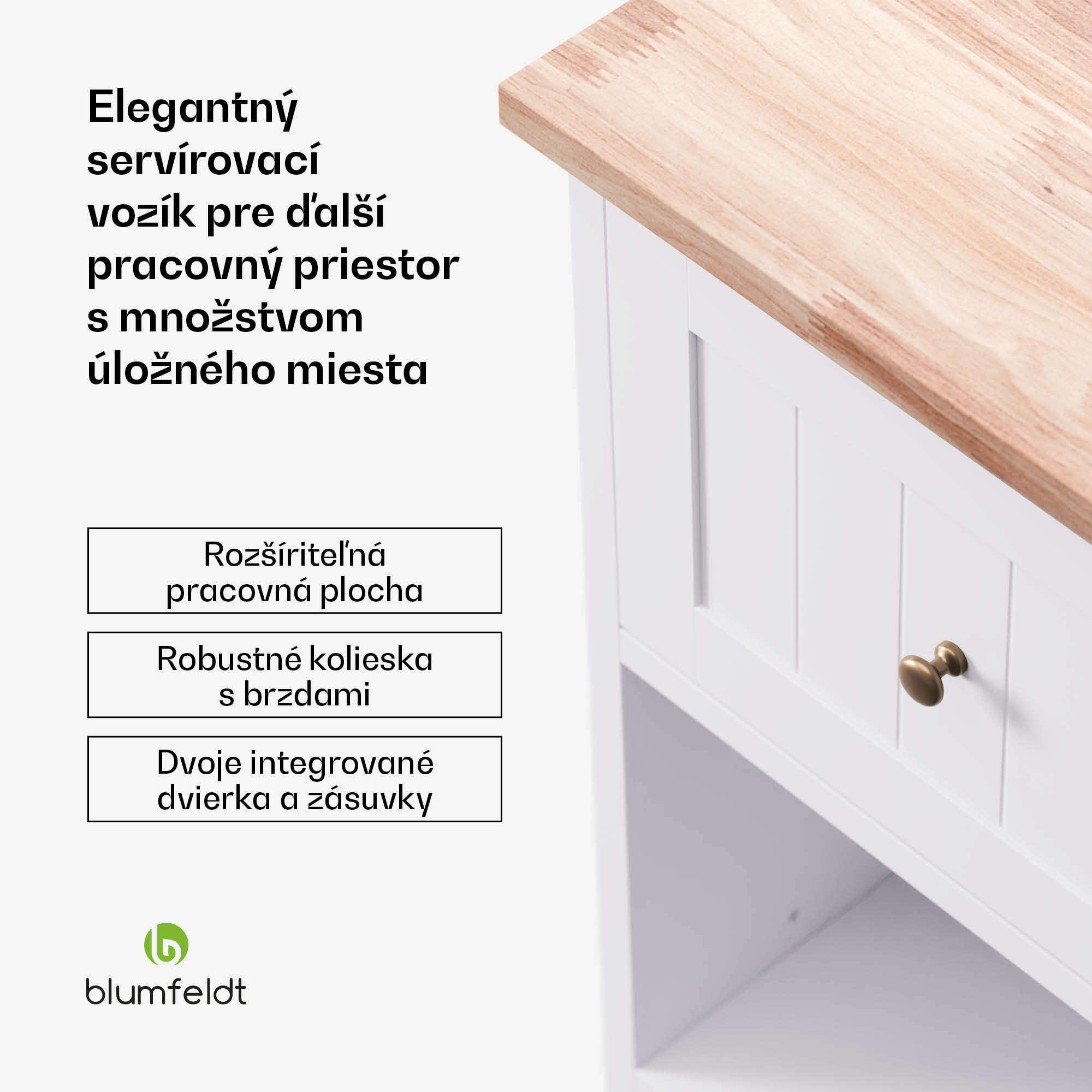 Servírovací vozík Blumfeldt Etsu je skutočným univerzálnym pomocníkom do vašej kuchyne, ktorý harmonicky spája funkčnosť a estetiku. Vďaka svojmu priestrannému dizajnu a inteligentným funkciám je varenie a servírovanie hračkou.Servírovací vozík ponúka vďaka výsuvnej pracovnej doske ďalší priestor na prípravu jedál a odkladanie kuchynského náčinia, takže je ideálny najmä do menších kuchýň. Vďaka 2 zásuvkám, 2 dvierkam a 2 policiam ponúka dostatok úložného priestoru na riad, príbory a iné kuchynské potreby.Robustné kolieska uľahčujú pohyb servírovacieho vozíka, zatiaľ čo brzdy zabezpečujú bezpečné postavenie pri príprave jedál aj pri servírovaní. Nadčasový dizajn servírovacieho vozíka dokonale zapadne do každého kuchynského interiéru a dodá vašej kuchyni moderný nádych.Servírovací vozík Blumfeldt Etsu s vysokokvalitnými materiálmi a robustnou konštrukciou je nielen mimoriadne funkčný, ale aj odolný a ľahko sa čistí. Kúpte si túto štýlovú a praktickú kuchynskú pomôcku a uľahčite si každodenný život v kuchyni!