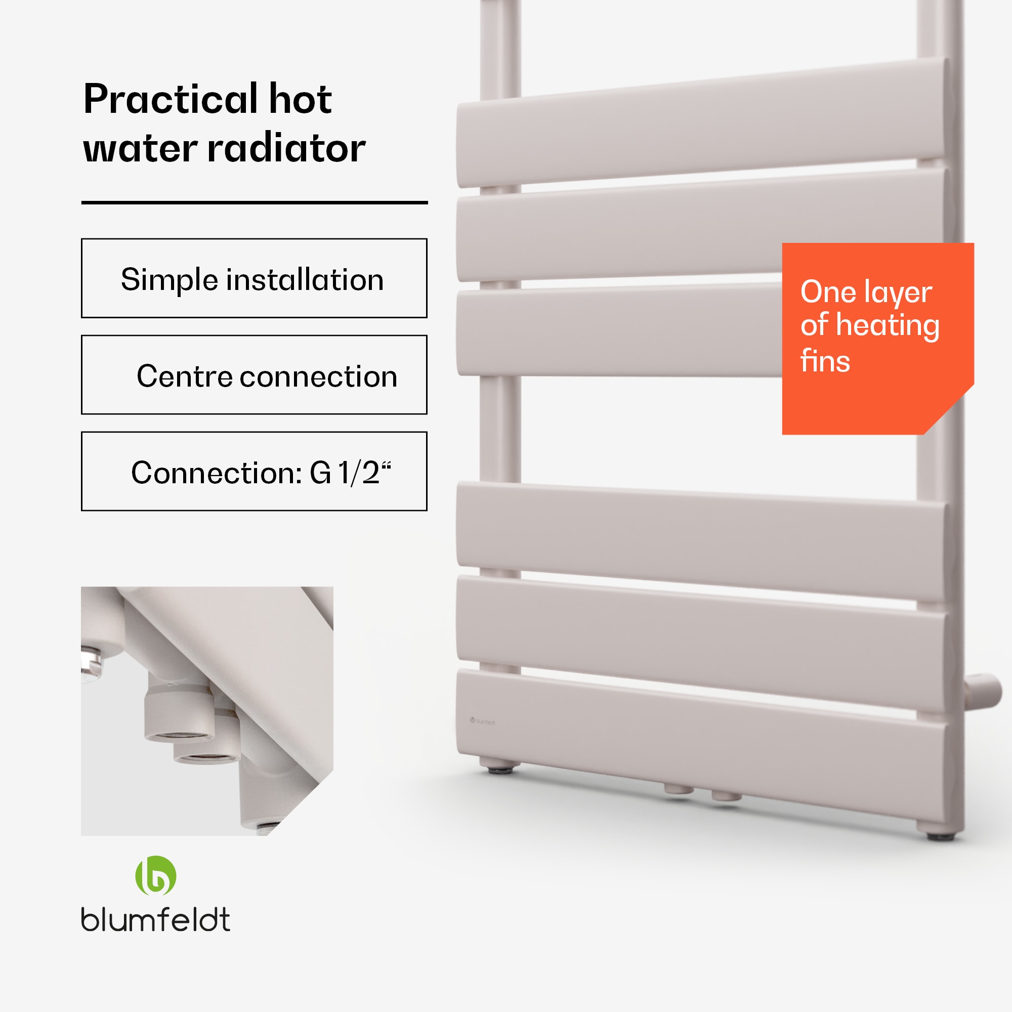 Útulné teplo pre domácnosť v modernom dizajne: radiátor Fairmont 50 x 107 od Blumfeldt nielenže prináša do kúpeľne príjemnú teplotu, ale aj atraktívne vyzerá.Rúrkový radiátor Fairmont 50 x 107 od Blumfeldt jednoducho integrujete do existujúceho teplovodného alebo diaľkového vykurovacieho systému a funguje aj s elektrickým ponorným ohrievačom alebo elektronickým termostatom. Poskytuje spoľahlivý a rovnomerný zdroj tepla v kúpeľni. Pripojenie je veľmi jednoduché: konštrukcia umožňuje pripojenie v strede aj na bočných rúrkach. Vďaka tomu dokáže Fairmont optimálne reagovať na mnohé konštrukčné podmienky. Potrebné nástenné konzoly sú tiež priamo súčasťou balenia. Robustný systém kovových rúrok optimálne vedie a rozvádza teplo až do 70 °C a generuje až 509 W vykurovacieho výkonu.Pre ešte väčšiu pohodu sú tu štyri integrované vešiaky na zavesenie a ohrievanie uterákov. Vďaka plochému dizajnu 11 vykurovacích rebier sa radiátor veľmi ľahko a rýchlo čistí. Útulné teplo priamo po sprche alebo kúpeli s radiátorom Fairmont 50 x 107 od Blumfeldt – štýlový zážitok.
