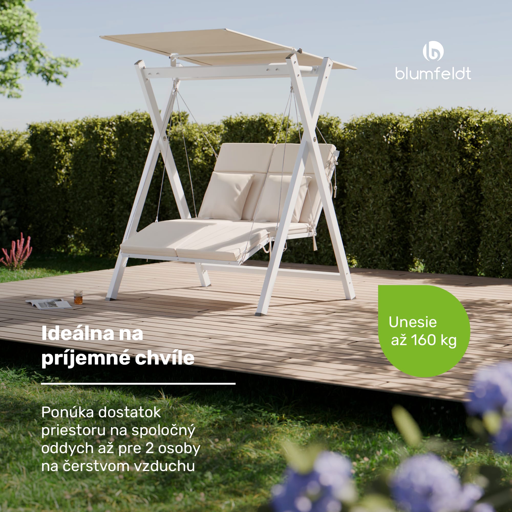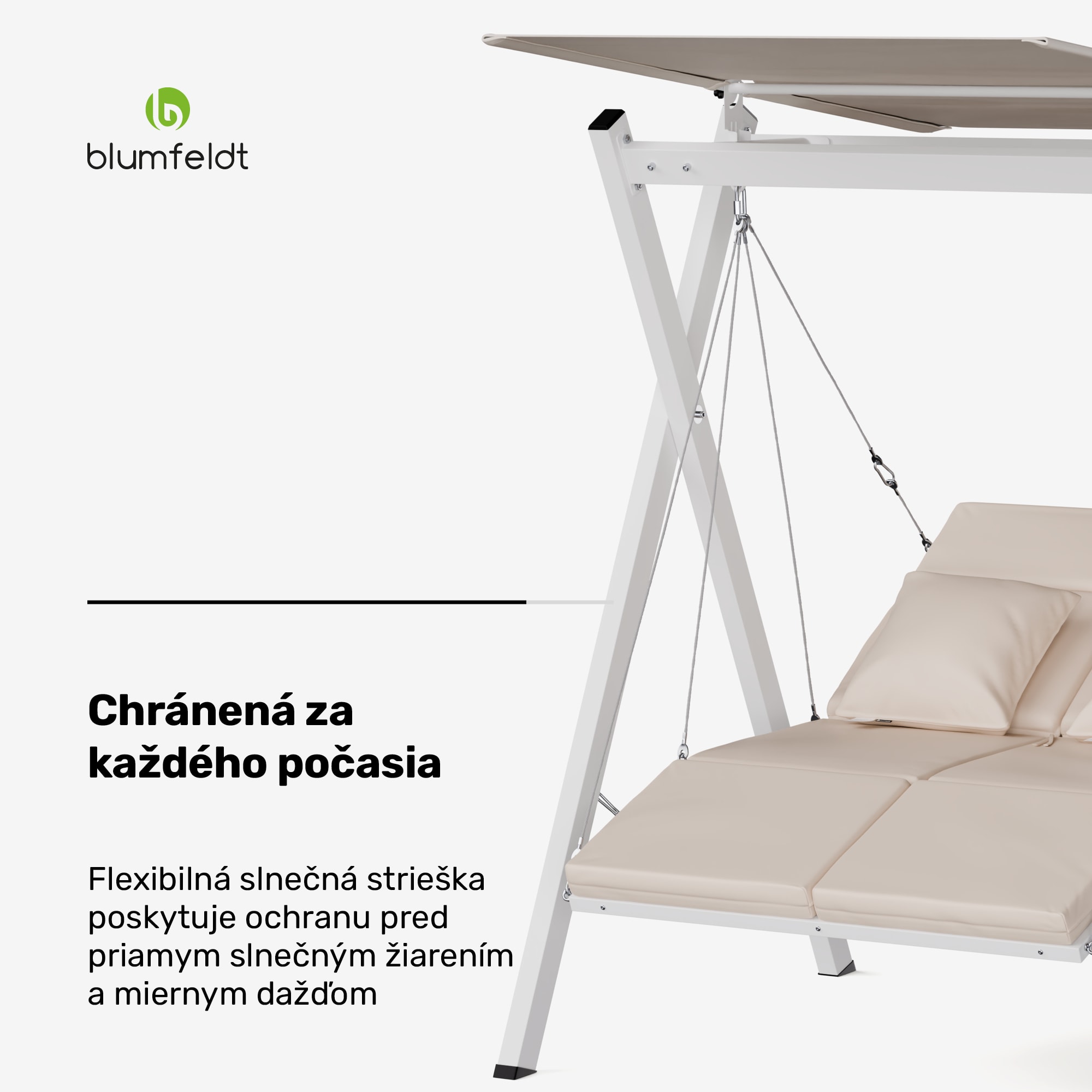 Hollywoodska hojdačka blumfeldt FlexiSwing vás pozýva na hodiny oddychu vonku, ponúka individuálny komfort a kvalitnú konštrukciu. Oceľový rám s práškovou povrchovou úpravou je pevný a stabilný, zatiaľ čo kvalitné vankúše zaisťujú príjemné pohodlie.Hollywoodska hojdačka blumfeldt FlexiSwing ponúka priestor pre dve osoby – voliteľne je k dispozícii aj ako 3- alebo 4-miestna. Je vybavená 6 cm hrubými vankúšmi, zaisťuje maximálne pohodlie a odolá záťaži až 160 kg.Nastaviteľné operadlo s dvoma polohami si môžete prispôsobiť pre ešte väčšie pohodlie. Optimálnu ochranu pred slnkom poskytuje aj nastaviteľná slnečná strieška. Táto hollywoodska hojdačka je ideálna na príjemné chvíle osamote alebo vo dvojici, ako aj na spoločenské stretnutia s rodinou a priateľmi v záhrade, na terase alebo na balkóne.Celkovo hollywoodska hojdačka blumfeldt FlexiSwing ponúka luxusný a pohodlný vonkajší zážitok pre každého, kto chce relaxovať na čerstvom vzduchu.