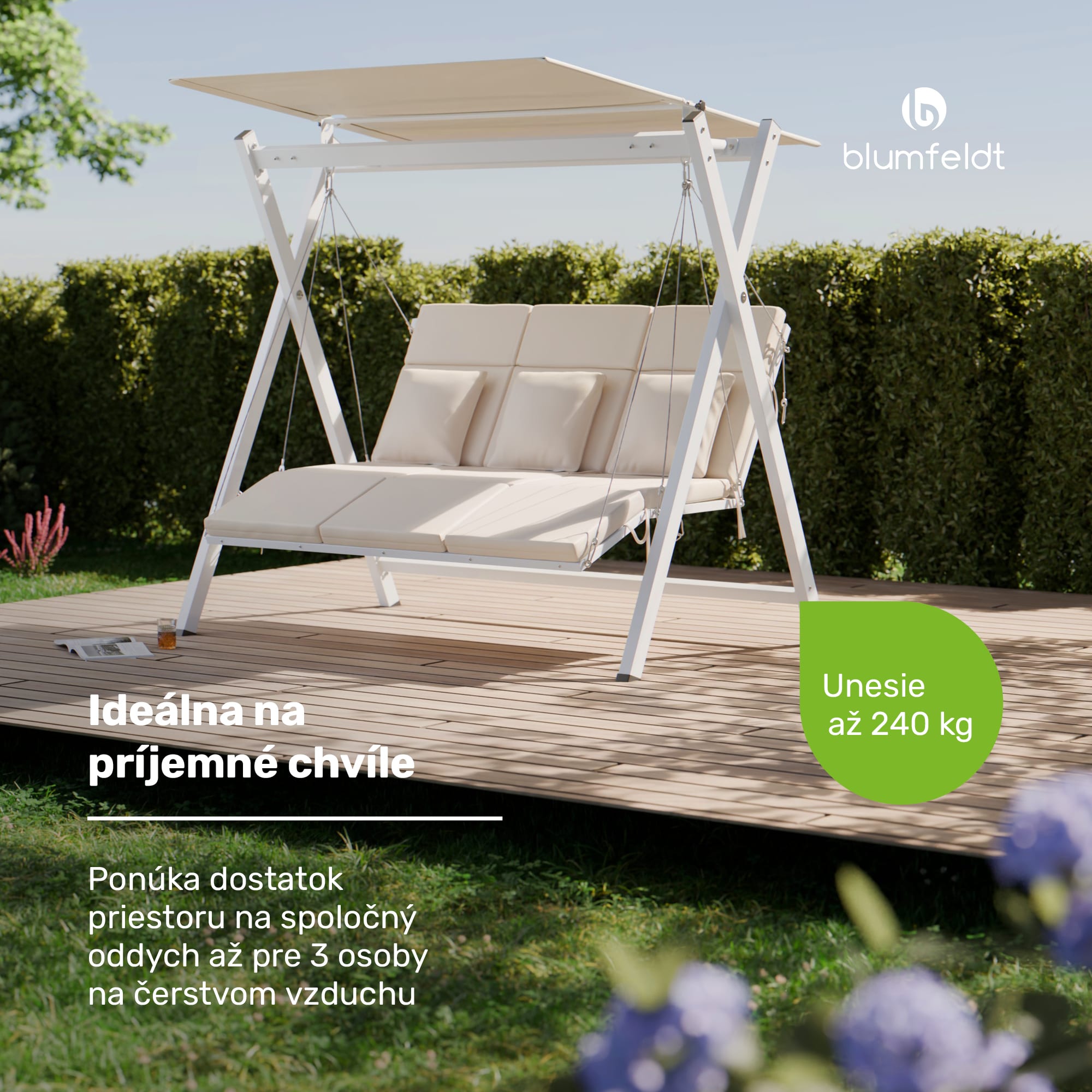Hollywoodska hojdačka blumfeldt FlexiSwing vás pozýva na hodiny oddychu vonku, ponúka individuálny komfort a kvalitnú konštrukciu. Oceľový rám s práškovou povrchovou úpravou je pevný a stabilný, zatiaľ čo kvalitné vankúše zaisťujú príjemné pohodlie.Hollywoodska hojdačka blumfeldt FlexiSwing ponúka priestor pre tri osoby – voliteľne je k dispozícii aj ako 2- alebo 4-miestna. Je vybavená vankúšmi s hrúbkou 6 cm, ktoré zaisťujú maximálne pohodlie a vydržia zaťaženie až 240 kg.Nastaviteľné operadlo s dvoma polohami si môžete prispôsobiť pre ešte väčšie pohodlie. Optimálnu ochranu pred slnkom poskytuje aj nastaviteľná slnečná strieška. Táto hollywoodska hojdačka je ideálna na príjemné chvíle osamote alebo vo dvojici, ako aj na spoločenské stretnutia s rodinou a priateľmi v záhrade, na terase alebo na balkóne.Celkovo hollywoodska hojdačka blumfeldt FlexiSwing ponúka luxusný a pohodlný vonkajší zážitok pre každého, kto chce relaxovať na čerstvom vzduchu.