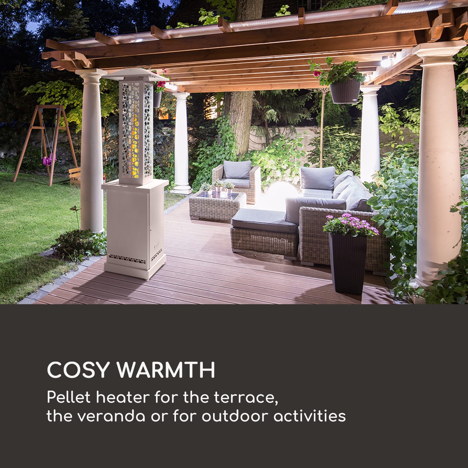 Terasový ohrievač na pelety blumfeldt Heat Hunter sa počas chladných dní postará o príjemné teploty na terase, verande alebo pri vonkajších aktivitách.Štýlový vonkajší ohrievač dokáže presvedčiť vykurovacím výkonom 12,2 kW a vďaka teplotám až do 499 °C poskytuje svojmu okoliu príjemné teplo v účinnom dosahu 12,5 metra. V závislosti od množstva náplne 3 až 9 kg dosahuje ohrievač pohodlný čas horenia 1,5 až 6 hodín; dostatok času na spoľahlivé zahriatie všetkých účastníkov rodinnej oslavy, firemného večierka alebo stretnutia priateľov. Extra veľký kryt reflektora zaisťuje, že teplo neunikne nahor, ale je distribuované do okolia. Priehľadný sklenený valec je počas prevádzky mimoriadne pôsobivý: prúdením horúceho vzduchu horí plameň ako fakľa a vďaka 360° výhľadu sa postará o pôsobivú, bezpečnú hru plameňov.Ohrievač na pelety blumfeldt Heat Hunter vytvára obzvlášť energeticky efektívne teplo a s podielom CO² iba 4,7 % je dokonca CO² neutrálny. Okrem toho sú pelety v porovnaní s inými zdrojmi energie, ako sú skvapalnený plyn a zemný plyn, cenovo efektívnejšie a vďaka PelletEnergy chránia nielen životné prostredie, ale aj peňaženku. Vďaka dvom podlahovým kolieskam s hladkým chodom sa dá zariadenie Heat Hunter tiež jednoducho prepravovať a premiestňovať, zatiaľ čo pevná bezpečnostná mriežka chráni sklenený valec pred neželaným prístupom. Nehrdzavejúca konštrukcia z ušľachtilej ocele poskytuje zariadeniu dlhú životnosť a umožňuje jeho použitie vo vonkajšom prostredí. Pre bezpečné ohrievanie je súčasťou balenia pár kľúčov na praktické uzamknutie vykurovacej klapky a ochranné rukavice na bezpečné vyprázdnenie nádoby na pelety.Výkonný, štýlový a ohľaduplný k životnému prostrediu: terasový ohrievač na pelety blumfeldt Heat Hunter predlžuje príjemnými teplotami vonkajšiu sezónu o mnoho mesiacov.Upozorňujeme, že zariadenie sa dodáva ako montážna sada.