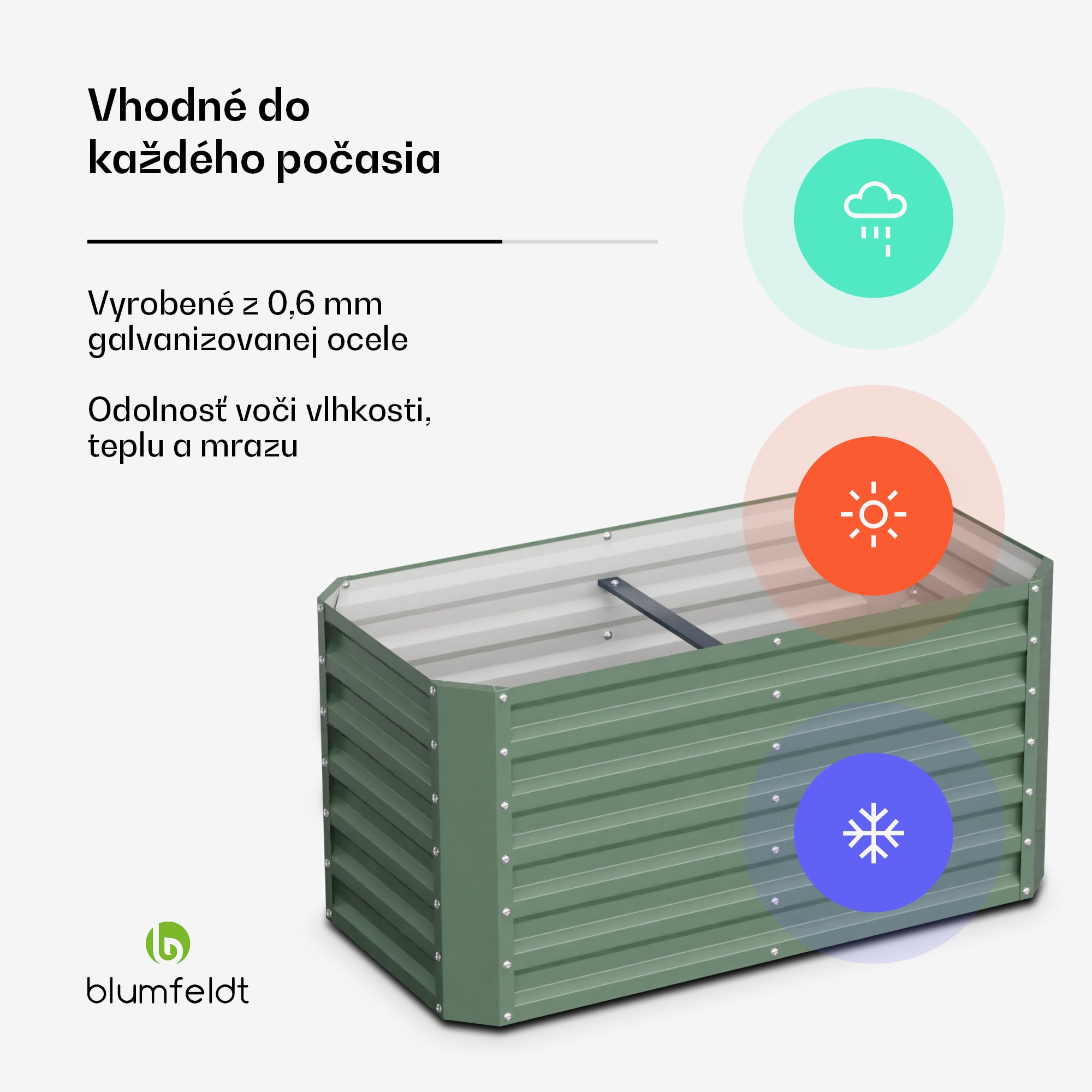 Chutné, čerstvé a z vlastného záhona: S vyvýšeným záhonom blumfeldt High Grow Straight máte ešte viac priestoru na to, aby ste si sami vypestovali svoju dennú porciu zeleniny a premenili terasy, dvory alebo predzáhradky na zelené oázy. Tento okrasný vyvýšený záhon je ideálny pre každého záhradkára.Pestovanie šťavnatých paradajok, sladkých jahôd, chrumkavých cukiet a aromatických byliniek je vďaka optimálnym pestovateľským podmienkam hračka. Jednoročné rastliny a celoročné záhradnícke pôžitky: Stabilná rámová konštrukcia záhradného záhonu blumfeldt je vyrobená z vlnitej ocele a je odolná voči hrdzi a mrazu vďaka špeciálnej zliatine zinku. High Grow odoláva vetru a počasiu po celý rok.Farebná pastva pre oči a zdravá pochúťka: Blumfeldt High Grow Straight vytvára optimálne rastové podmienky. To umožňuje relatívne vyššie výnosy ako u plochých záhonov. Pohodlie v stoji a predovšetkým šetrnosť k vášmu chrbtu robí záhradkárčenie oveľa príjemnejším. Pohodlná pracovná výška 60 cm je mimoriadne praktická aj pre deti. To znamená, že aj tí najmenší môžu pomáhať pri sadení, polievaní a zbere. Napriek tomu pre škodcov, akými sú slimáky, zostáva záhon neprekonateľnou bariérou. Do vyvýšeného záhonu s objemom 575 litrov možno pridať množstvo vrstiev humusu, takže sa dá použiť aj priamo ako kompostér: Jednoducho umiestnite zelený odpad medzi vrstvy pôdy – to nielen priláka dážďovky, ktoré pôdu kypria, ale aj trvalo zásobuje záhon čerstvými živinami.Čas urobiť niečo užitočné: S okrasným vyvýšeným záhonom blumfeldt High Grow Straight môže každý objaviť svoju zelenú záľubu.