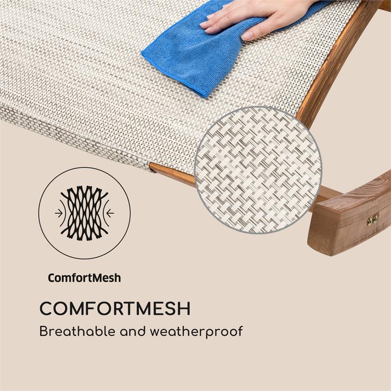 Čistá relaxácia! Či už na balkóne, na terase alebo v záhrade – užite si pocit ako na dovolenke a oddýchnite si s hojdacím ležadlom Blumfeldt Maurtitius. V horúcich letných dňoch poskytuje ľahko nastaviteľná slnečná strieška z polyesteru spoľahlivú ochranu pred UV žiarením a slnkom. Okrem toho podporuje ergonomicky tvarované ležadlo prirodzený tvar chrbtice a ponúka relaxačný priestor z príjemného materiálu ComfortMesh, ktorý je nielen priedušný, odolný voči poveternostným vplyvom, ale vďaka svojej štruktúre sa tiež mimoriadne ľahko udržiava a čistí. Pevný rám z fínskeho borovicového dreva je spoľahlivo chránený pred vonkajšími vplyvmi svojou vodovzdornou lazúrou a poskytuje maximálnu nosnosť 180 kg. Jemne sa kývajúce miesto odpočinku sa vďaka svojmu zvlnenému dizajnu perfektne začlení do každého záhradného prostredia a zaujme svojou jednoduchou eleganciou. Hojdacie ležadlo Mauritius od spoločnosti Blumfeld: ideálna komfortná zóna pre všetkých, ktorí chcú obohatiť svoj každodenný život dovolenkovými momentmi.