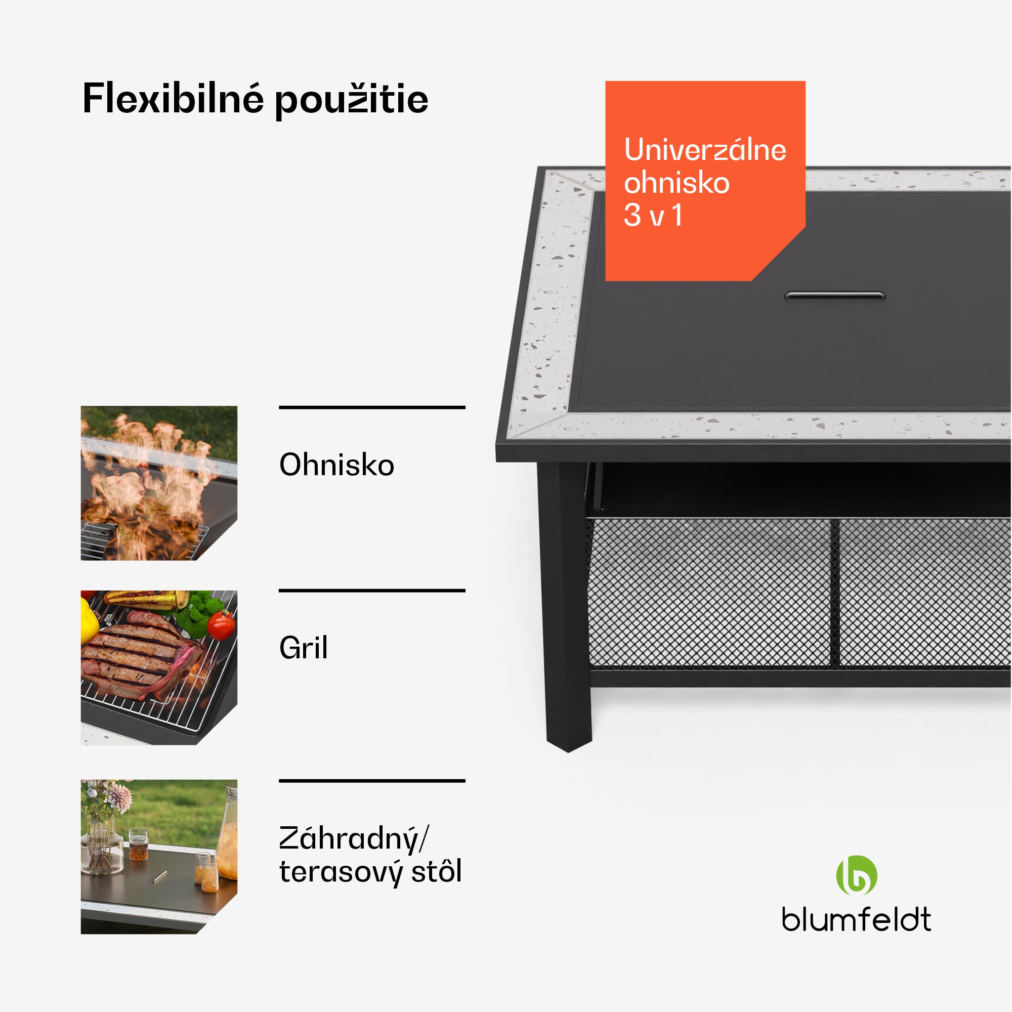 Vychutnajte si stredomorskú atmosféru, romantiku táboráku a šťavnaté pečené pochúťky s dekoratívnym ohniskom blumfeldt Merano Avanzato. Ohnisko 3 v 1 poskytuje teplo, je vhodné na grilovanie a dá sa použiť aj ako plnohodnotný stôl.Kvalitná terazzová stolová doska dodá záhrade alebo terase očarujúci šmrnc. Robustný oceľový rám zároveň zaisťuje bezpečné postavenie. Úložný priestor pod stolom je mimoriadne praktický. To znamená, že si môžete pripraviť drevo na oheň a v pokoji si vychutnať plamene. Pripojiteľný ochranný kryt proti iskrám a tepelný štít pod ohniskom vždy zabezpečujú potrebnú bezpečnosť pri stretnutiach okolo praskajúceho ohňa.Môžete tiež grilovať nad plápolajúcim ohňom tak, že naň položíte grilovací rošt z nehrdzavejúcej ocele. Či už ide o klobásy, zeleninové špízy, steaky alebo syr – údená chuť je zárukou čistého pôžitku. Súčasťou dodávky je aj praktický pohrabáč a poklop na uzavretie ohniska. Ohnisko 3 v 1 od blumfeldt sa dá kedykoľvek a v priebehu niekoľkých sekúnd premeniť na dekoratívny stolík.Ohnisko blumfeldt Merano Avanzato s grilom: praskajúca záhradná atmosféra spojená s lahodným pôžitkom!