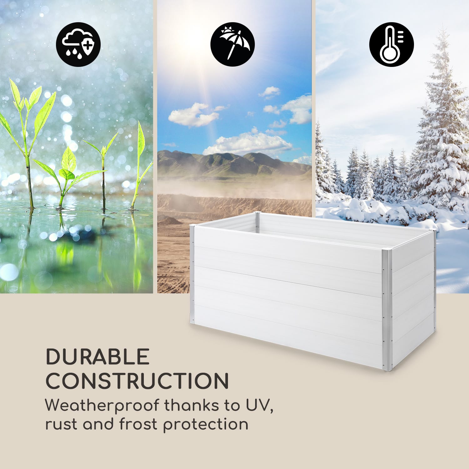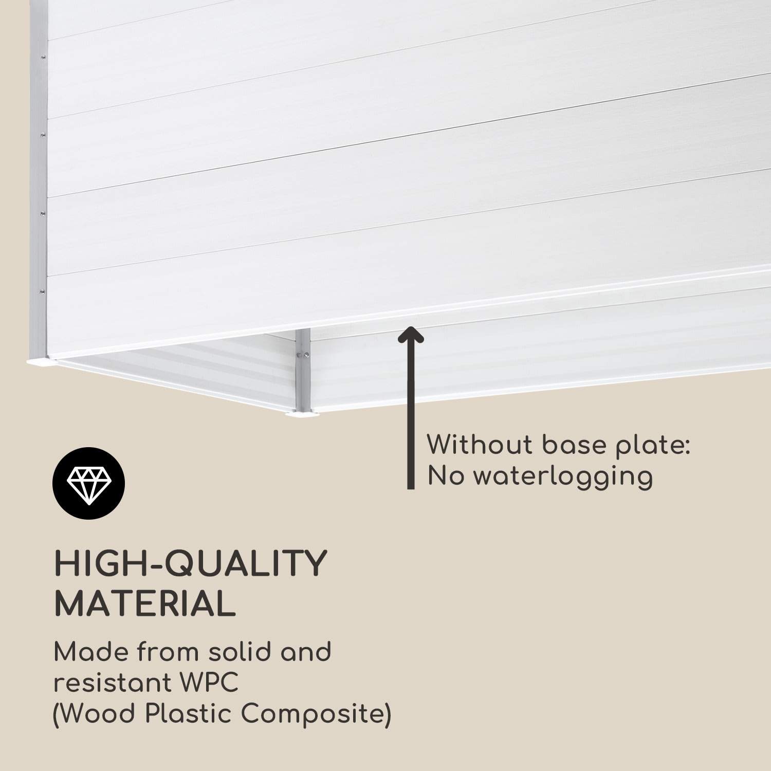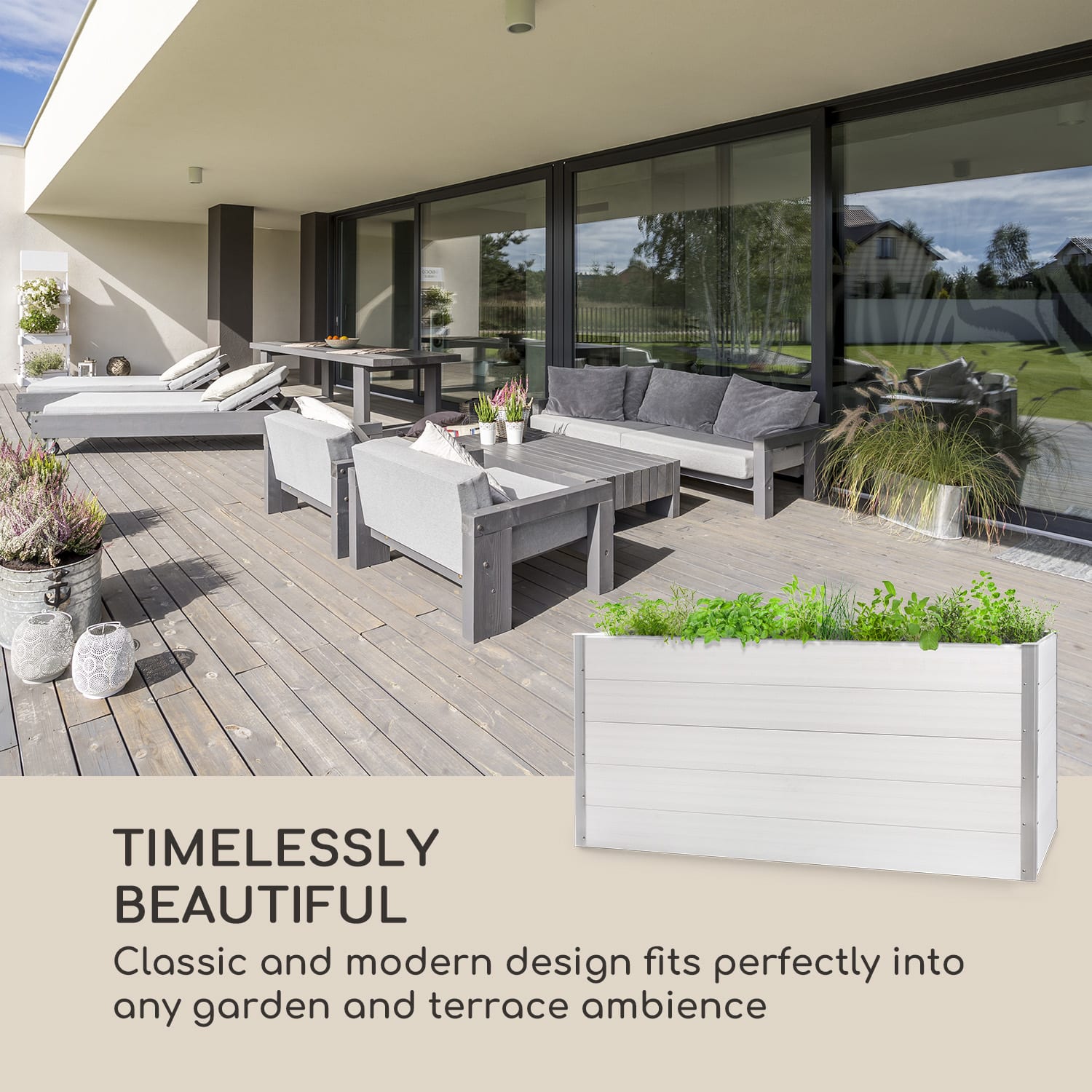 Vypestujte si vlastné: Teraz s okrasným vyvýšeným záhonom Blumfelfd Nova Grow Vysaďte ovocie, zeleninu, bylinky a kvety v pohodlnej pracovnej výške a premeňte záhrady alebo terasy na živé oázy sviežosti._x000D_ Stabilný záhradný záhon je vyrobený z WPC kompozitu (Wood Plastic Composite) odolného voči poveternostným vplyvom a vďaka ochrane proti UV žiareniu, korózii a mrazu je ideálny na trvalé použitie v exteriéri. Vďaka svojmu prírodnému drevenému vzhľadu sa konštrukcia ideálne hodí do každej záhrady a terasy a pôsobivo zvýrazní svoje okolie vďaka farebnému prevedeniu v jednoduchej bielej farbe. Pri výške 91 cm má Nova Grow mimoriadne pohodlnú výšku, ktorá pri sadení a zbere šetrí chrbticu, pretože sa nemusíte toľko ohýbať. Okrasný vyvýšený záhon sa dá zostaviť za krátky čas a vďaka hliníkovým výstuhám na všetkých 4 rohových častiach sľubuje mimoriadne vysokú robustnosť a stabilitu._x000D_ Čas na sviežu zeleň a osviežujúce farby: Vysaďte si vlastný záhon s Blumfelfd Nova Grow a vychutnajte si domáce bylinky a kvety, ako aj chutné ovocie a zeleninu. Tento okrasný vyvýšený záhon dodá vašej záhrade nový rozmer._x000D_ _x000D_ Upozorňujeme, že vyvýšený záhon sa dodáva bez základovej dosky.