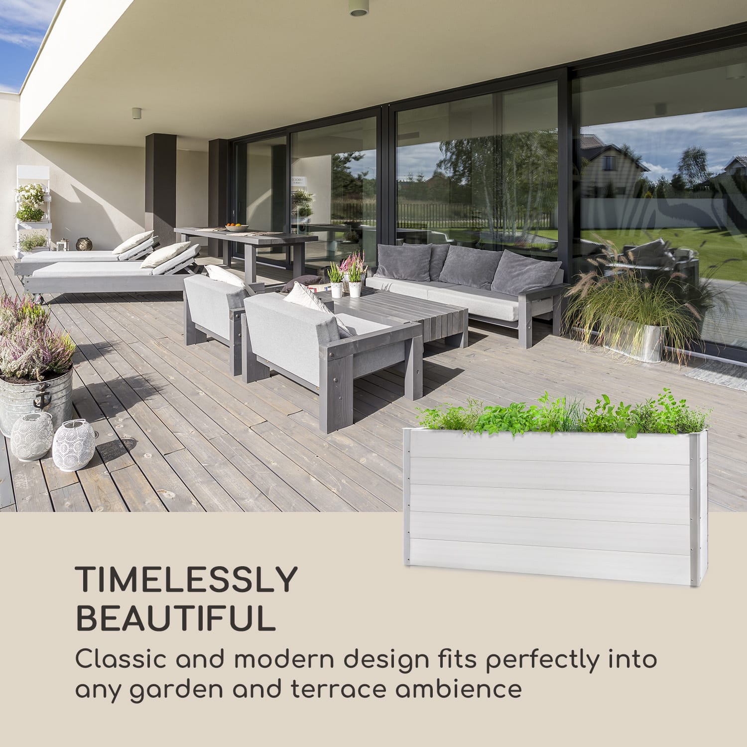 Vypestujte si vlastné: Teraz so záhradným záhonom Blumfelfd Nova Grow Vysaďte ovocie, zeleninu, bylinky a kvety v pohodlnej pracovnej výške a premeňte záhrady alebo terasy na živé oázy sviežosti._x000D_Stabilný záhradný záhon je vyrobený z WPC kompozitu (Wood Plastic Composite) odolného voči poveternostným vplyvom a vďaka ochrane proti UV žiareniu, korózii a mrazu je ideálny na trvalé použitie v exteriéri. Vďaka svojmu prírodnému drevenému vzhľadu sa konštrukcia ideálne hodí do každej záhrady a terasy a pôsobivo zvýrazní svoje okolie vďaka farebnému prevedeniu v jednoduchej bielej farbe. Pri výške 91 cm má Nova Grow mimoriadne pohodlnú výšku, ktorá pri sadení a zbere šetrí chrbticu, pretože sa nemusíte toľko ohýbať. Okrasný vyvýšený záhon sa dá zostaviť za krátky čas a vďaka hliníkovým výstuhám na všetkých 4 rohových častiach sľubuje mimoriadne vysokú robustnosť a stabilitu._x000D_Čas na sviežu zeleň a osviežujúce farby: Vysaďte si vlastný okrasný vyvýšený záhon s Blumfelfd Nova Grow a vychutnajte si domáce bylinky a kvety, ako aj chutné ovocie a zeleninu._x000D__x000D_Upozorňujeme, že vyvýšený záhon sa dodáva bez základovej dosky.