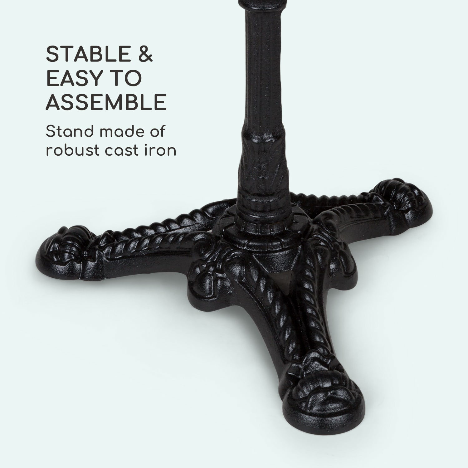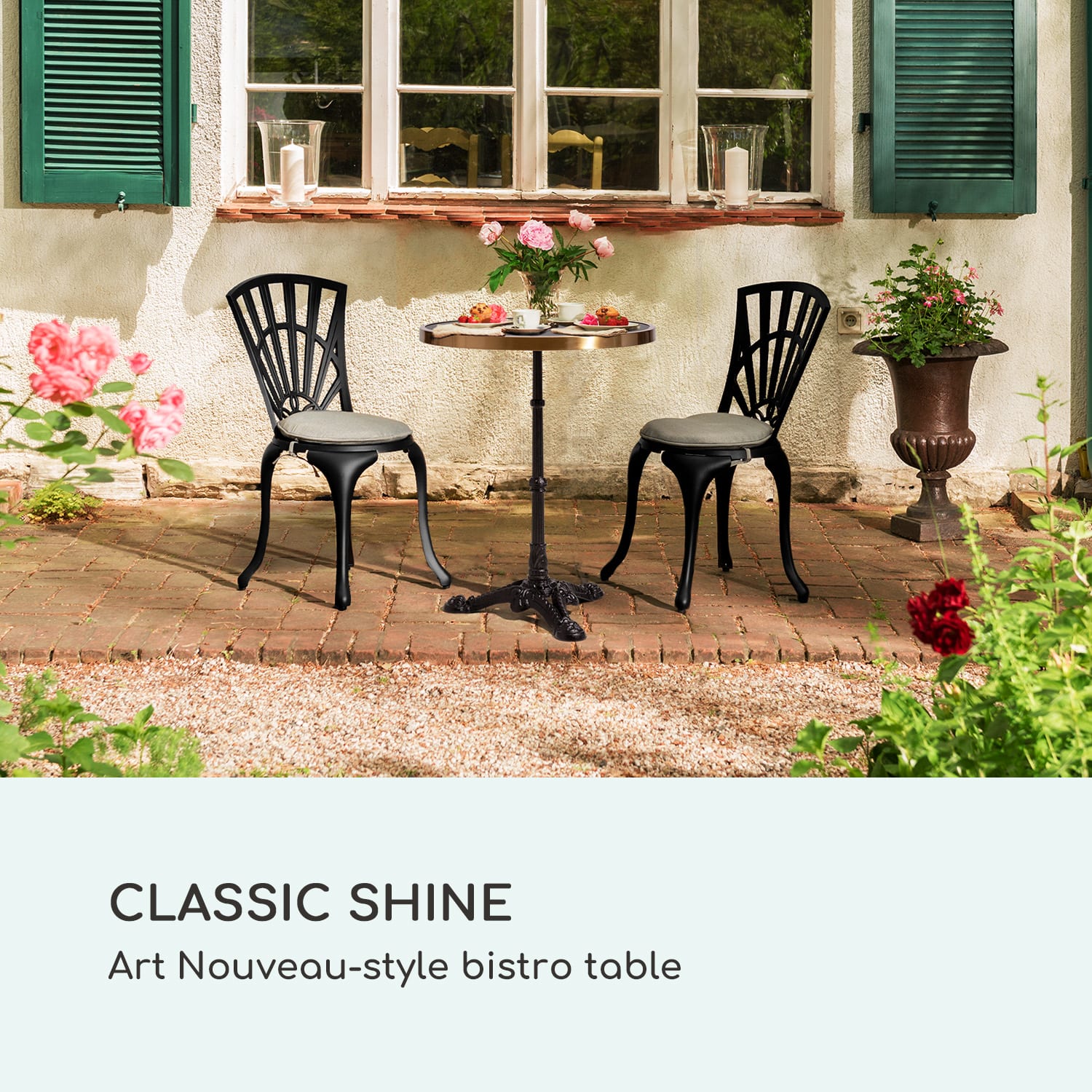 S bistro stolíkom blumfeldt Patras Lux znovu ožívajú zlaté dvadsiate roky.Luxusný pôžitok so secesnou atmosférou – presne to sľubuje záhradný stôl blumfeldt Patras Lux. Okrúhla doska stola je vyrobená zo starostlivo lešteného pravého mramoru. Tento stolík je teda unikát – vzor a farba horniny vždy prinášajú celkom jedinečný charakter. Ten vynikajúco zdôrazňuje zlatý lem dosky stola a luxusný vzhľad ešte umocňuje liatinový, umelecky zrobený trojnohý podstavec stola. Raňajky na balkóne, príjemná káva na terase alebo romantická večera pri sviečkach pod hviezdami: mramorový stôl blumfeldt Patras Lux sa postará o výnimočné prostredie.Bistro stolík blumfeldt Patras Lux šíri luxus a pozýva pobudnúť v špeciálnej secesnej atmosfére!