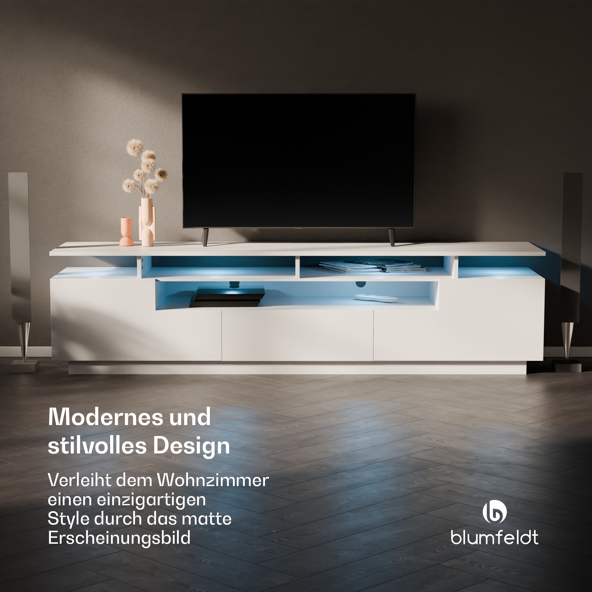 S TV skrinkou blumfeldt Perth  Lowboard nedostanete len kus nábytku, ale aj vyjadrenie moderného štýlu a funkčnosti vášho domova. Lowboard blumfeldt Perth zaujme moderným dizajnom s matnou doskou a laminátom, ktorý je nielen štýlový, ale aj robustný. Tento kus nábytku upúta pozornosť vo vašej obývačke a dodá miestnosti jedinečnú estetiku.Integrované LED osvetlenie vám umožní upraviť atmosféru podľa vašich preferencií. Variabilný výber farieb a štyri rôzne režimy osvetlenia vytvárajú individuálnu svetelnú náladu pre každú príležitosť TV skrinka blumfeldt Perth s tromi veľkorysými úložnými úrovňami ponúka dostatok miesta na multimediálne zariadenia, knihy a dekorácie.Montáž je jednoduchá a nekomplikovaná. Vďaka jasnému návodu a premyslenej konštrukcii je váš lowboard pripravený na použitie už za 20 minút. S rozmermi 195 x 50 x 33 cm sa perfektne hodí do vašej obývačky a ponúka maximálnu nosnosť 30 kg pre váš televízor.