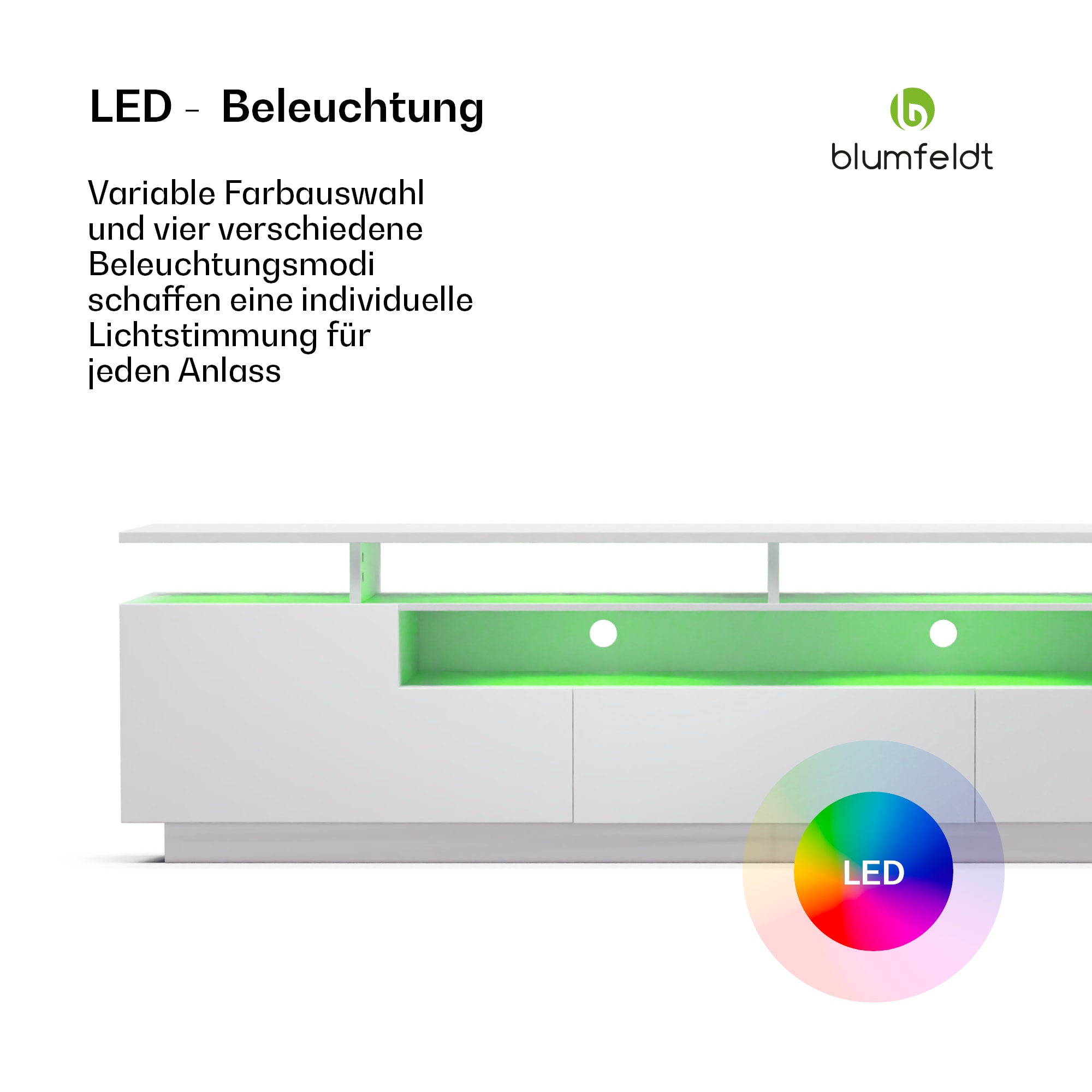 blumfeldt Perth Lowboard , TV skrinka, LED, 3 police, biela, 195 x 33 x 50 cm
