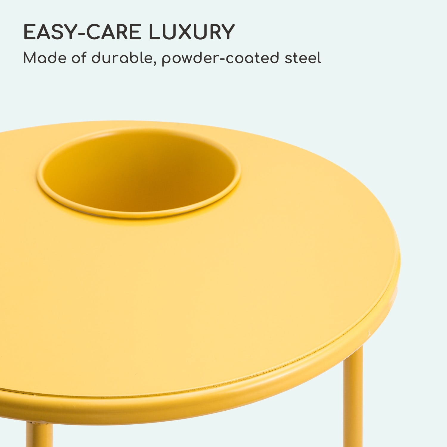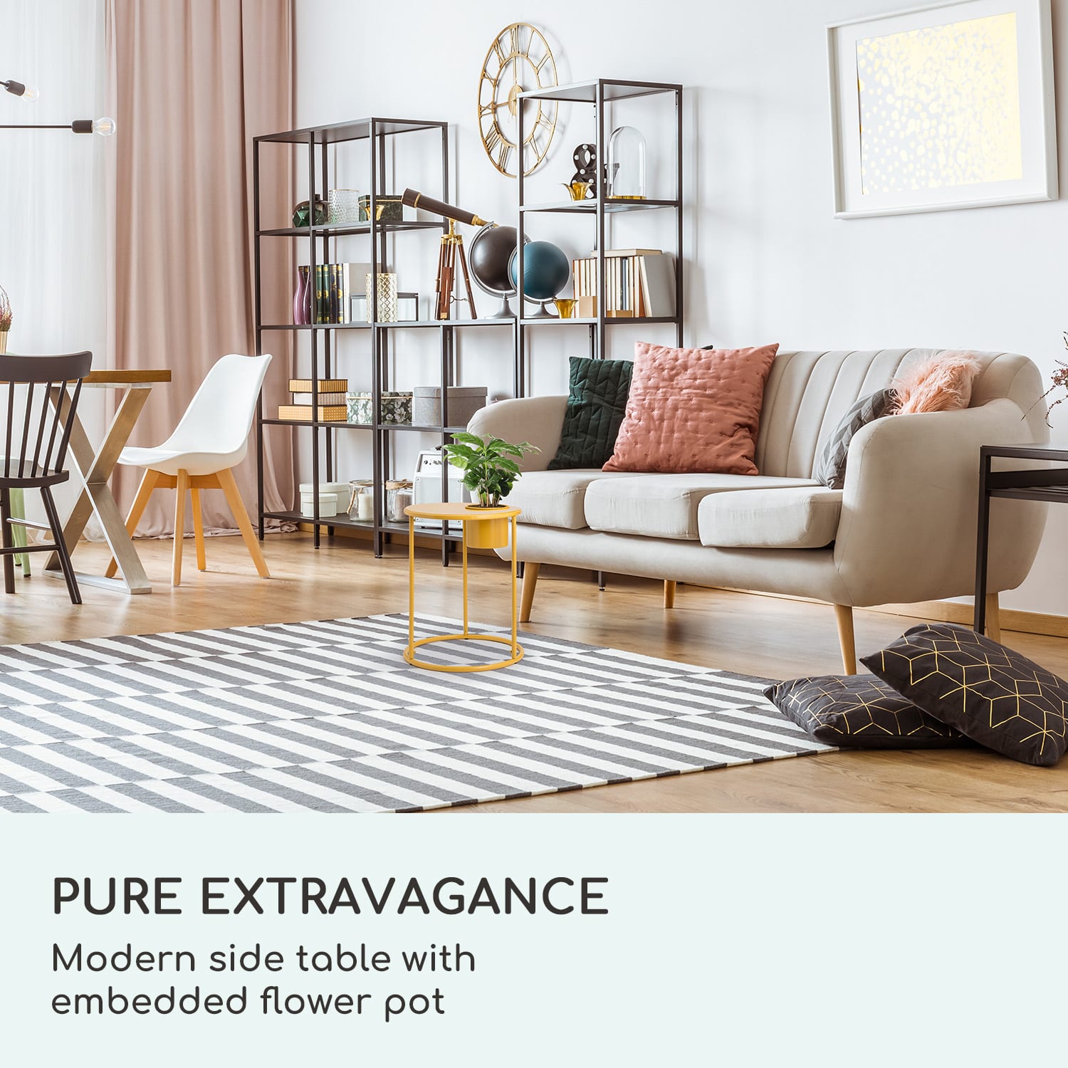 Klasicky moderný: Blumfeldt Irvine príručný stolík kombinuje robustný materiál s minimalistickým dizajnom. Určite bude zaujímavým doplnkom v každej miestnosti, keďže má zabudovaný kvetináč. Jednoducho doň zasaďte svoje obľúbené rastliny a váš nový stolíkožije kvetinovou výzdobou. Okrem možnosti zasadenia rastliny, má stolík aj priestorovo úsporné línie: okrúhla stolová doska je umiestnená na troch jemných tyčiach, ktoré prechádzajú do rovnako okrúhlej základne. Vďaka kvalitnému spracovaniu a robustnému materiálu vám poskytuje stolík maximálnu stabilitu Prášková povrchová úprava ocele tiež zaisťuje, že sa mimoriadne ľahko čistí a je odolný. Ako malý všestranný doplnok vytvorí osobitý akcent v celej vašej domácnosti a zároveň vám ponúkne praktickú odkladaciu plochu: ako telefónny stolík , nočný stolík , stolík do šatne alebo dokonca ako malý konferenčný stolík na terase či balkóne.Extravagancia do každej miestnosti: Moderný Blumfeldt Irvine príručný stolík prekvapí vstavaným kvetináčom v doske stola.