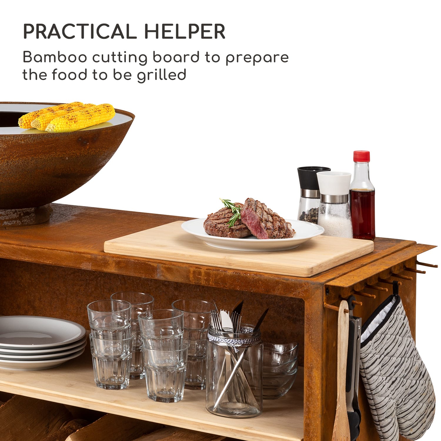 So širokým ohniskom s grilom blumfeldt Savage 2.0 Wide môžeš zažiť neobyčajnú atmosféru otvoreného ohňa pod holým nebom a užívať si šťavnato upečené pochúťky v kruhu priateľov a rodiny. Pekné ohnisko s priemerom cca 59 cm je vyrobené celé z ocele, je chránené pred vodou a hrdzou a vďaka hrúbke materiálu 2 mm je relatívne ľahké. Stabilná základňa sa vďaka bambusovému regálu perfektné hodí na pohodlné uloženie uhlia alebo dreva na grilovanie. Na pevno zabudovanú dosku na krájanie môžete použiť na prípravu grilovacích pochutín ako je zelenina a mäso. Položením grilovacieho kruhu zo smaltovanej ocele sa síce obmedzí plápolanie ohňa, ale teplo pahreby ako aj chutné klobásky, steaky alebo zeleninové špízy túto stratu ľahko vynahradia. V balení sú okrem toho aj 4 posuvné kolieska s brzdou na jednoduchý prenos ako aj odolná ochranu proti poveternostným podmienkam, ktorá toto zariadenie 2-v-1 chráni pred vetrom a počasím.Ohnisko s grilom blumfeldt Savage 2.0 Wide sa s veľkým úložným priestorom a na pevno zabudovanou bambusovou doskou na krájanie postará o praskajúcu záhradnú atmosféru a príjemné grilovacie večery pod holým nebom.