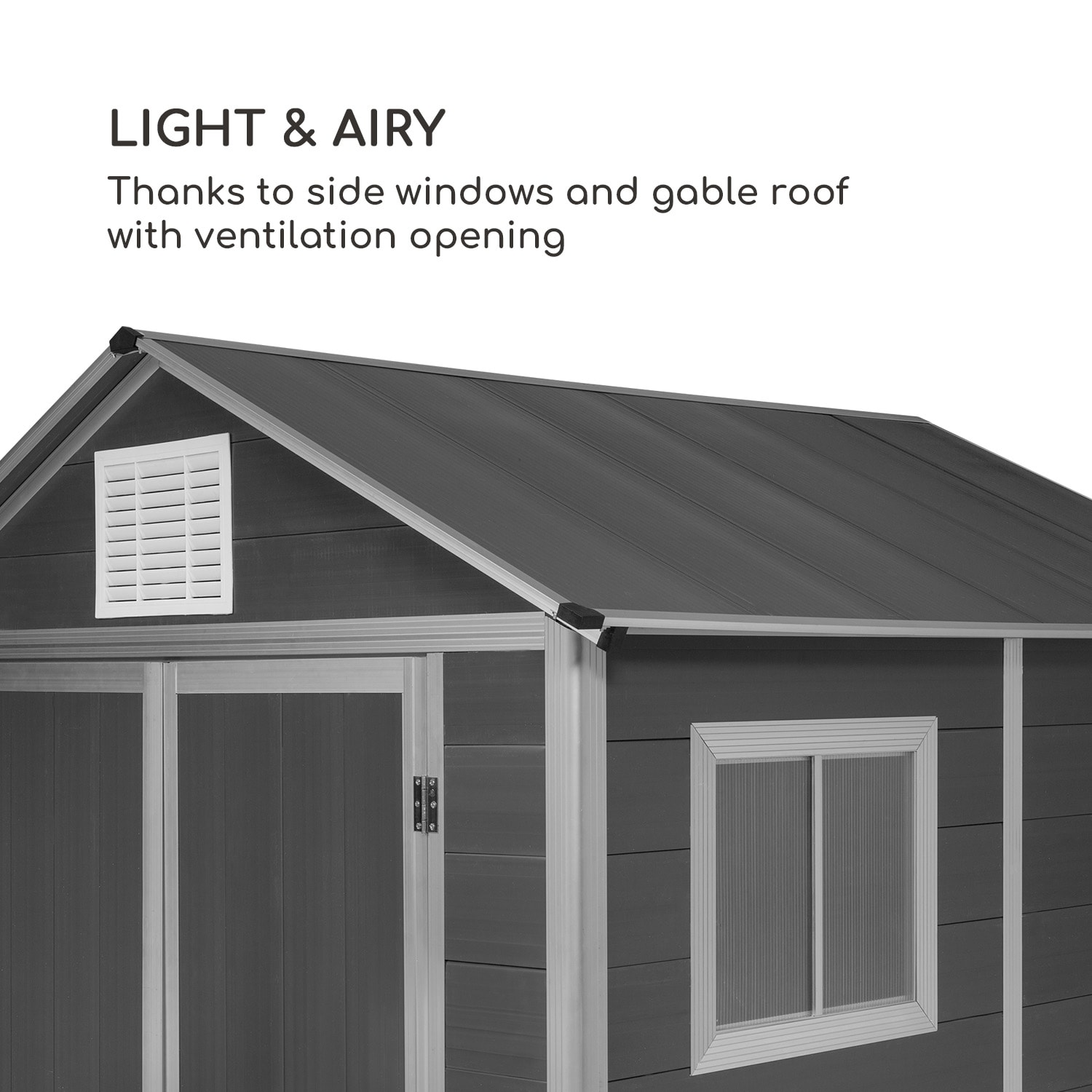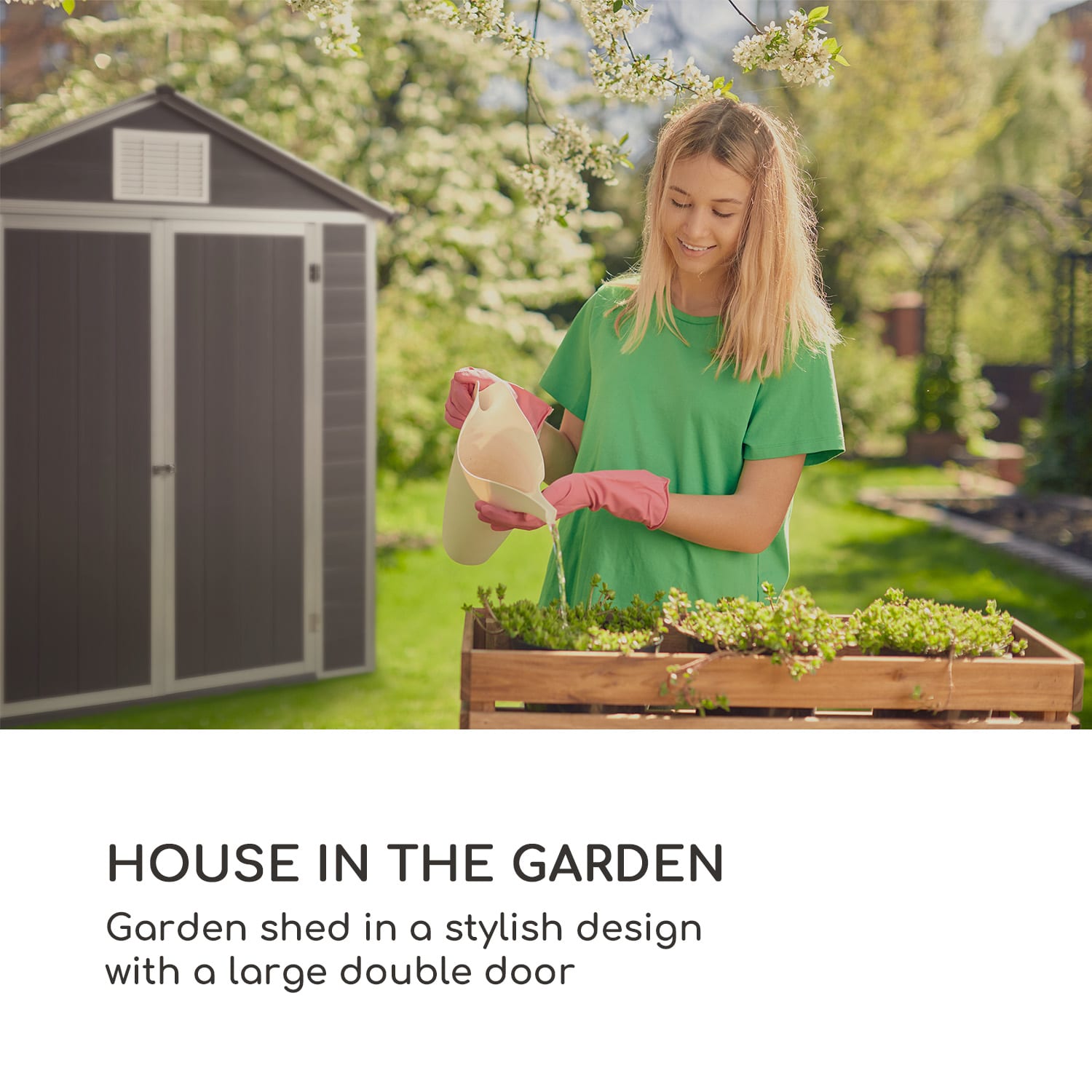 Záhradná šopa blumfeldt Schatzkammer presviedča svojou vizuálnou stránkou a svojim robustným vyhotovením a je ideálna na uskladnenie záhradného nábytku, náradia a záhradných zariadení. Po skončení prác v záhrade sa blumfeldt Schatzkammer zodpovedne stará o poriadok a ponúka perfektnú ochranu pred slnečným žiarením, hrdzou a tvorbou plesní, pre náradie, záhradné prístroje a záhradný nábytok. Šikovný domček s odolného PVC nedisponuje so svojimi rozmermi 170 x 218 x 170 cm len dostatkom priestoru, ale chráni, vďaka ochrane pred poveternostnými podmienkami a UV- žiarením, všetky zariadenia a nábytok a to po celý rok. Zatiaľ čo sa bočné okno stará o dostatok svetla vo vnútri, stará sa ventilačný otvor o neustále vetranie. Uzamykateľné dvojité dvere odrádzajú všetkých neželaných návštevníkom pred vstupom do záhradnej šopy. Pre ešte viac bezpečnosti môžete použiť aj visiaci zámok. Svojim štýlovým zovňajškom pasuje Schatzkammer do každého záhradného prostredia. ,Záhradná šopa Schatzkammer od blumfleldt: stará sa o poriadok v záhrade, ponúka ochranu pred poveternostnými podmienkami a vďaka štýlovému dizajnu pôsobí vždy dobre.