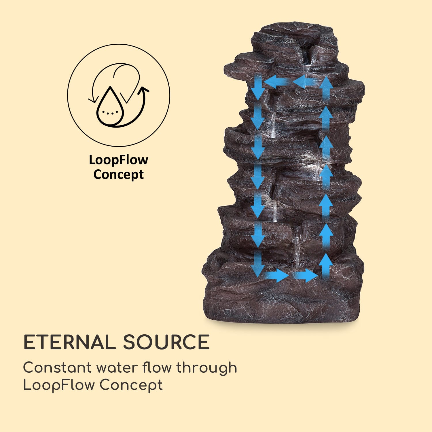 Zažite čistú relaxáciu ako v prírode so solárnou fontánou Stonehenge XL od blumfeldt: harmonický vodný prvok s pôsobivým osvetlením do záhrady, na terasu alebo do obývačky.Vďaka zakrivenému dizajnu v sofistikovanom kamennom vzhľade je solárna fontána Stonehenge XL od blumfeldt krásnym bytovým doplnkom a vytvorí všade uvoľnenú atmosféru. Sledujte trblietavú hru svetla prostredníctvom podvodného LED osvetlenia a nechajte sa zviesť do snov jemným šumením. Čistá relaxácia je tu na dennom poriadku a fontána zároveň poskytuje príjemne sviežu a zdravú klímu. V uzavretom vodnom okruhu nepretržite prúdi chladná voda z jednej úrovne do druhej. To znamená, že nie je potrebné pripojenie k externému zdroju vody. Najmä vo večerných hodinách vytvára solárna fontána Stonehenge XL od blumfeldt útulnú idylku. Pomáha tomu LED osvetlenie v každej nádrži. Pohyby vody tak vytvárajú nádherné, živé efekty. Šetrná k životnému prostrediu a úsporná: na zásobovanie fontány energiou stačí čistá solárna energia. K tomu má externý solárny panel, ktorý môžete optimálne umiestniť na slnko vďaka dlhému káblu. Či už je deň alebo noc, vďaka 7,4 V iónovej batérii je možná prevádzka až 5 hodín aj bez priameho slnečného svetla.Vytvorte si doma súkromné miesto pohody s úspornou solárnou fontánou. Stonehenge XL od blumfeldt. Trvalá udržateľnosť sa tu spája s elegantným dizajnom a relaxačná vodná hra sa postará o úplný oddych.