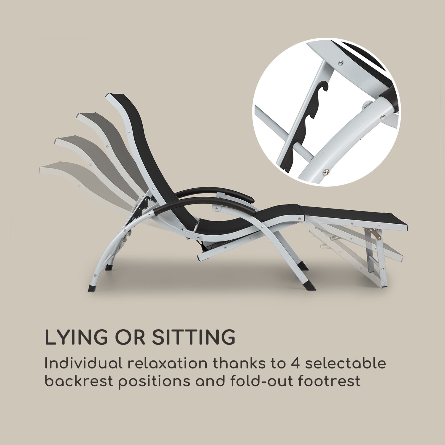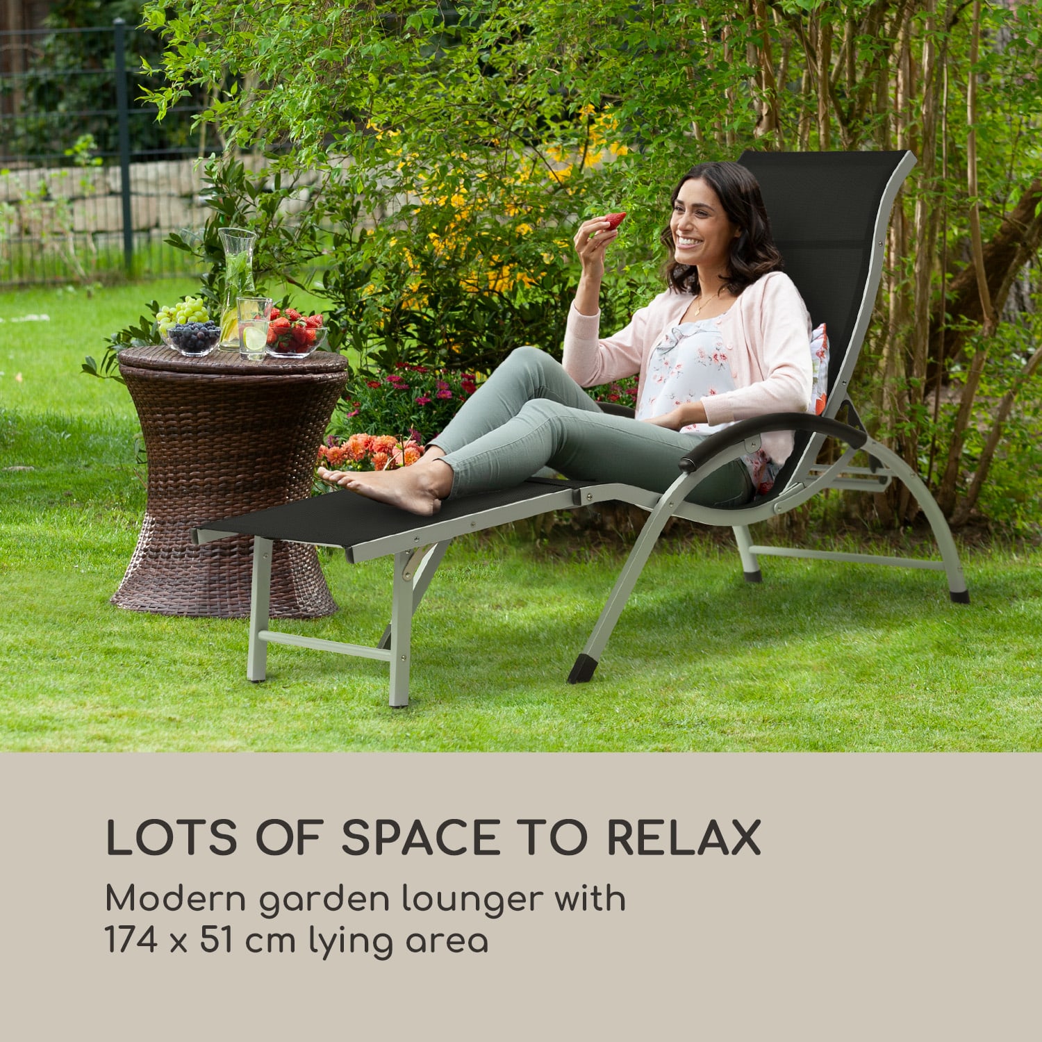 Čas leta je čas slnka: s lehátkom Blumfeldt Sunnyvale si môžeš vychutnávať v sede alebo po ležiačky blahodarné lúče slnka na záhrade, terase alebo balkóne.Záhradná stolička Blumfeldt Sunnyvale je tvojou osobnou čerpacou stanicou vitamínu D. Operadlo ležadla Sunnyvale môžeš nastaviť v 4 úrovniach – od sedenia po ležanie – podľa svojej momentálnej osobnej preferencie. Záhradné lehátko Sunnyvale sa dá vďaka vyklápacej podnožke premeniť na pohodlné lehátko. Jednoducho si vylož nohy a oddychuj. Vďaka pevnej polyesterovej sieťovine môžeš odpočívať na 174 cm dlhom, ergonomicky tvarovanom sedadle a ležadle ako na obláčiku. Sieťová tkanina je odolná voči poveternostným vplyvom, mimoriadne rýchlo schne a dá sa veľmi ľahko vyčistiť vlhkou utierkou. Lehátko je preto vždy pripravené na ďalšie opaľovanie. Konštrukcia je vyrobená z robustných hliníkových rúrok, takže celé lehátko váži iba 6 kg. Presun lehátka je naozaj hračka. Vďaka funkcii sklápania je možné lehátko zložiť do príručných rozmerov v niekoľkých jednoduchých krokoch na uskladnenie alebo na prepravu k jazeru.Vyjdi na slnko a získaj krásne opálenie a extra dávku vitamínu D! Letný relax na lehátku Blumfeldt Sunnyvale.