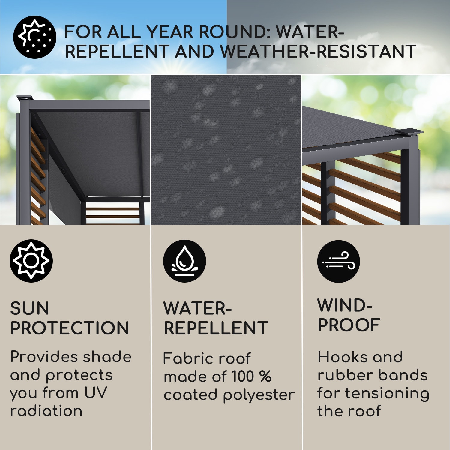 Blumfeldt Valence, altánok, 3 x 3 m, UV50+, vodoodpudivý, solárne LED osvetlenie, solárny panel –Kúpiť