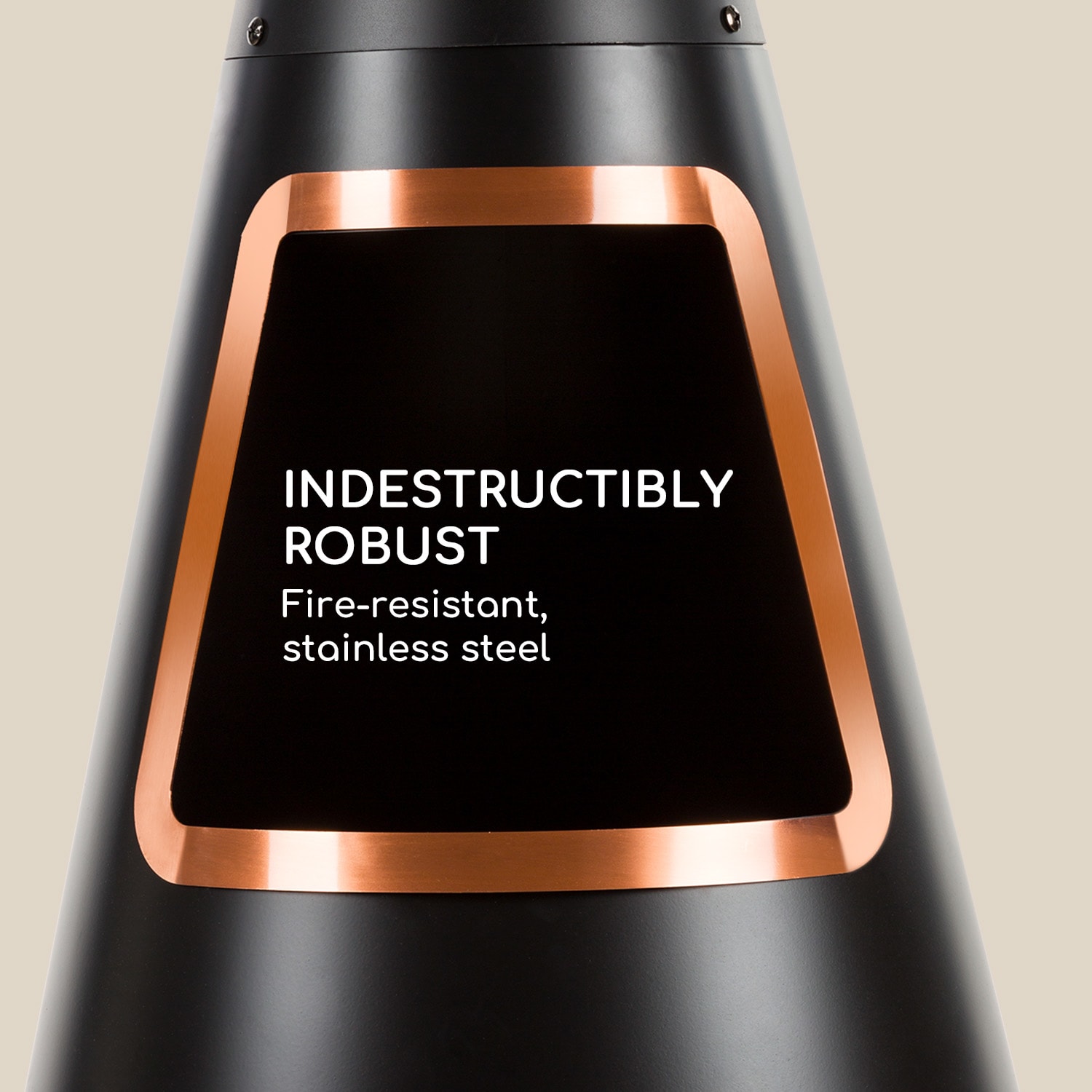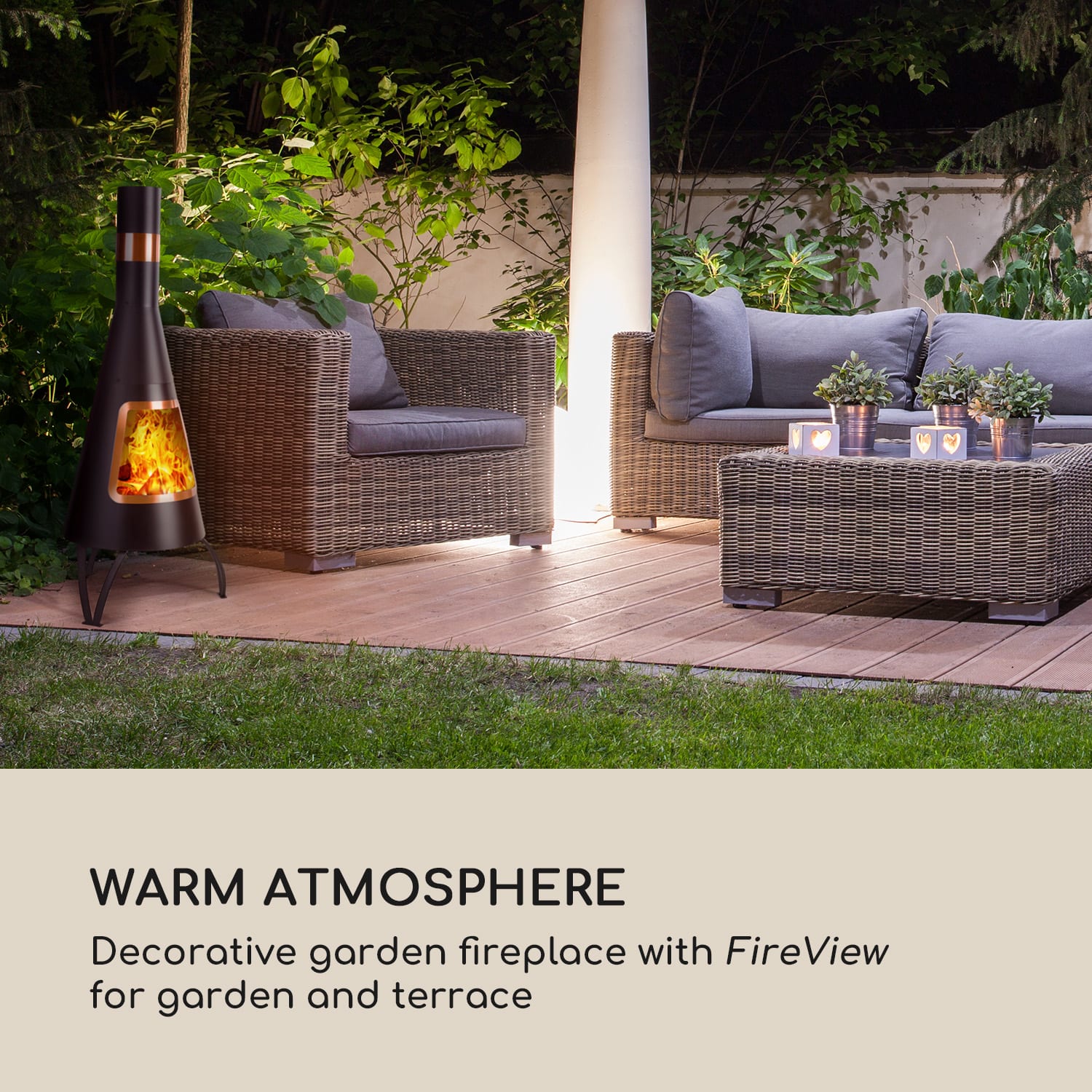 Keď sa na terase alebo v záhrade ochladí, záhradný krb Blumfeldt Volantis Cupric prináša príjemné teplo do chladných hodín a očarí svojím otvoreným ohňom. Uvoľnená atmosféra táboráku s plápolajúcim ohňom: žiadny problém so záhradným krbom Volantis Cupric. Stabilné terasové kachle sú vyrobené kompletne z ohňuvzdornej ocele. Vyžarujú v priebehu niekoľkých minút príjemné teplo a ponúkajú krásny plameň vďaka funkcii FireView: jednoducho vnútri zapáľte uhlie, drevo alebo drevené uhlie a užívajte si teplo a oheň po celé hodiny. Tri robustné nožičky poskytujú po celú dobu stabilitu a bezpečnosť proti prevráteniu na zvolenom mieste. Vďaka svojmu elegantnému dizajnu s medenými prvkami terasové kachle Volantis Cupric terasu nielen silno vyhrievajú, ale jej tiež poskytujú počas hodín vonku jedinečnú atmosféru a na každom mieste sa stanú moderným stredobodom pozornosti. Bezpečný táborák pre príjemné teplo a plápolajúce plamene: útulnosť v štýlovej konštrukcii so záhradným krbom Volantis Cupric.