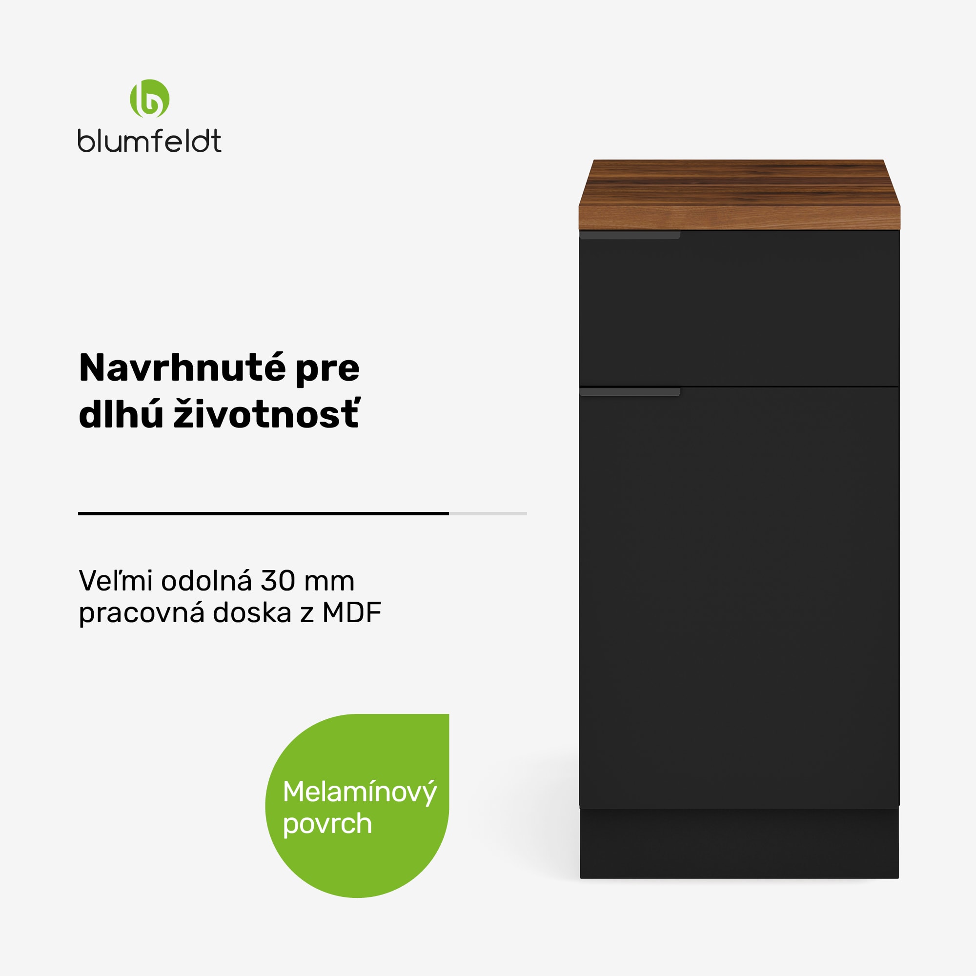Zásuvková skriňa Blumfeldt WoodVista ohromuje kvalitnými materiálmi, precíznym spracovaním a moderným dizajnom. Ideálna pre kuchyne, ktoré spájajú štýl a funkčnosť.Blumfeldt WoodVista je ideálnym doplnkom pre každú kuchyňu. Robustná pracovná doska z 30 mm MDF poskytuje trvanlivý a stabilný povrch, ktorý je ideálny na každodenné používanie. Hliníkové úchyty v matnej čiernej farbe zabezpečujú moderný a elegantný dizajn. Pánty Soft-close umožňujú tiché a jemné zatváranie dverí, čo uľahčuje každodenný život a predlžuje životnosť skrine. Obsahuje nastaviteľné nohy z ABS a zodpovedajúcu soklovú lištu, čo robí montáž flexibilnou a jednoduchou. Praktické: Všetky dodávané škatule vážia menej ako 30 kg, čo uľahčuje transport a manipuláciu.Navrhnite si kuchyňu svojich snov – so zásuvkovou skriňou Blumfeldt WoodVista ako štýlovým a funkčným riešením!