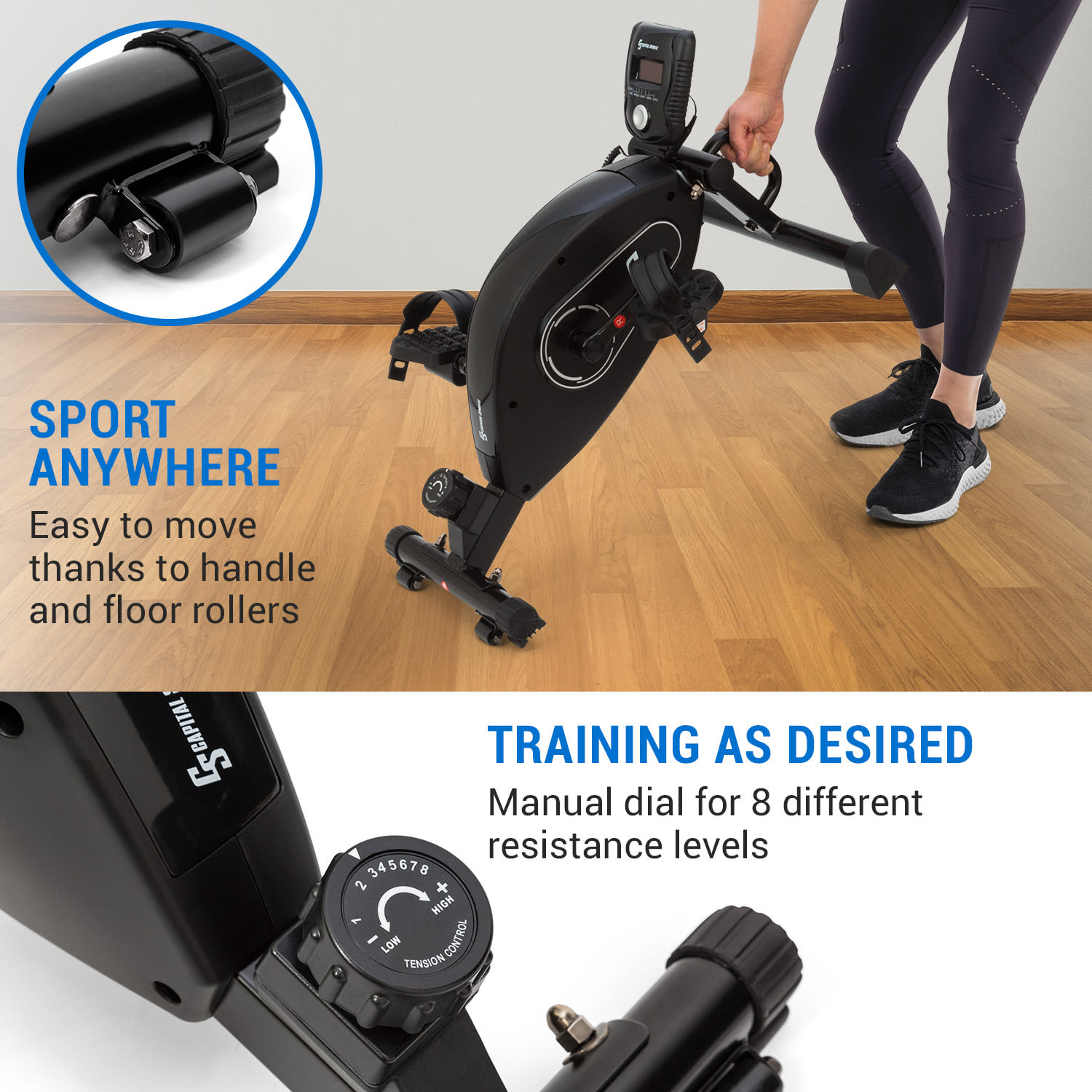 Cvičenie počas voľnej chvílky: s minibicyklom Crius od Capital Sports môžete ľahko športovať pri stole, v kancelárii alebo pred televízorom. Vďaka svojmu mimoriadne kompaktnému formátu sa minibicykel dokonale zmestí pod akýkoľvek stôl bez toho, aby zaberal veľa miesta. Ďalšia výhoda: tréningový počítač môžete odpojiť od zariadenia a vďaka dlhému káblovému pripojeniu ho môžete mať stále pod dohľadom. Mini bike s ôsmimi voliteľnými odpormi je vhodný pre každú tréningovú požiadavku: pre motivovaných nováčikov, ako aj pre športových nadšencov, ktorí potrebujú akciu aj vtedy, keď v telocvični zhasnú svetlá. Vďaka pripojeniu Bluetooth vám Mini Bike ponúka multimediálne tréningové zážitky, napr. pripojením k aplikácii Kinomap. Mesačné predplatné ponúka prístup k viac ako 100 000 km peších trás a je priamo prepojené s eliptickým trenažérom. Údaje o vašom výkone, ako je rýchlosť, srdcová frekvencia alebo prejdená vzdialenosť, sa prenášajú do aplikácie a priamo sa vyhodnocujú. Môžete napríklad objavovať diaľkové turistické trasy alebo cudzie mestá bez toho, aby ste museli opustiť svoj byt. Vďaka nízkej hmotnosti, praktickým rukovätiam a podlahovým kolieskam si môžete vziať minibicykel so sebou kamkoľvek.Mobilný tréning 21. storočia: kompaktný bicykel na cvičenie od Capital Sports umožňuje multimediálny tréning počas voľných chvíľ.Upozornenie: prístup do aplikácie Kinomap je možný len prostredníctvom online registrácie a je spoplatnený.