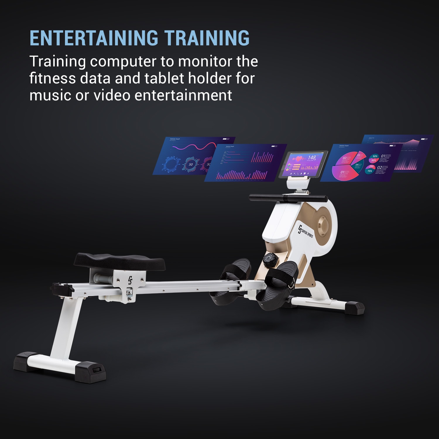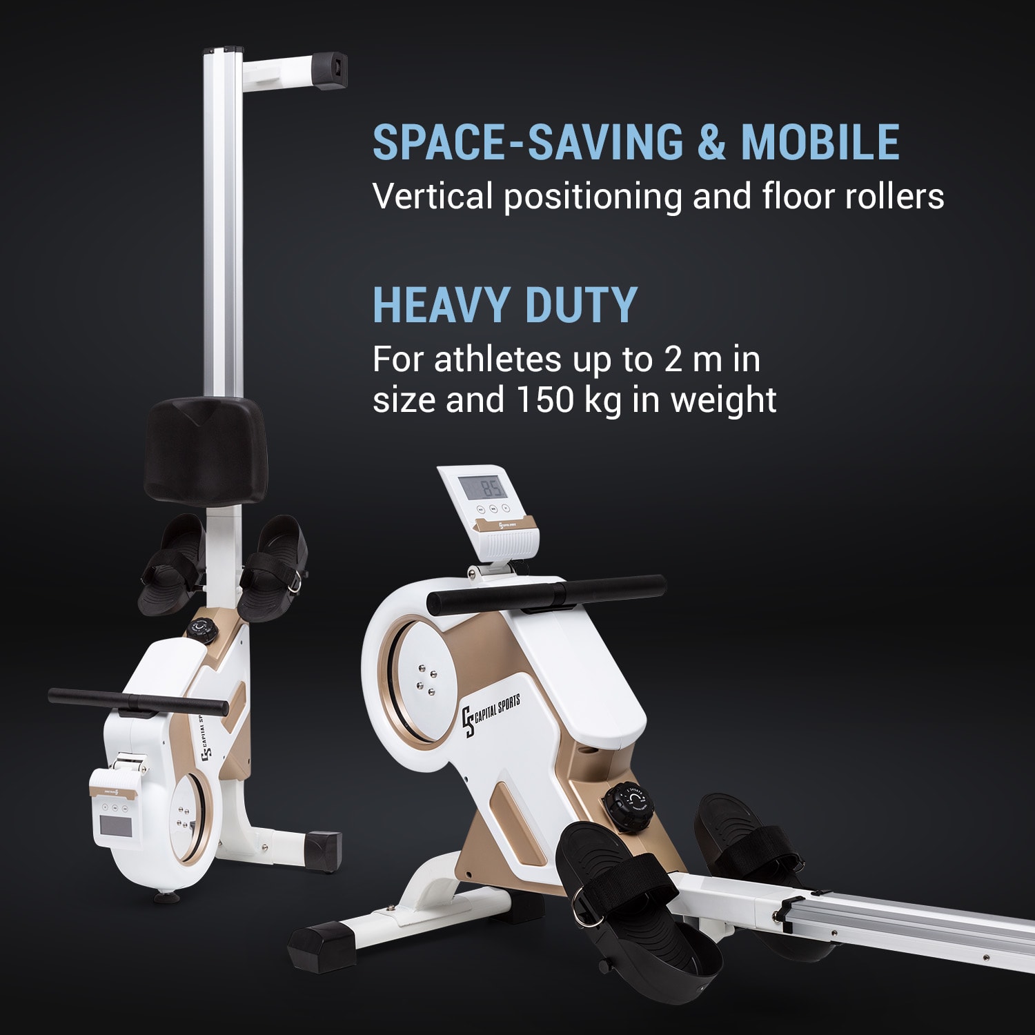 Tréning celého tela Veslovací trenažér Stream M1 od CAPITAL SPORTS umožňuje vysoko efektívny a na kĺby šetrný tréning celého tela pre športovcov do výšky 200 cm a hmotnosťou 150 kg. Takto budete od teraz trénovať vašu kondíciu a svaly!Veslovacia lavica Stream M1 od CAPITAL SPORTS vám sľubuje jedinečný zážitok z domáceho cvičenia. Srdcom vyváženého a kĺby šetriaceho tréningu je kvalitný, precízny hliníkový zotrvačník, ktorý pomocou nášho oceneného systému magnetického odporu MagResist odporuje vášmu veslovaniu vďaka 8 stupňom magnetického odporu. Vďaka hladkému chodu 105 cm dlhej hliníkovej posuvnej lišty je tréning takmer bezhlučný a bezproblémový a možný takmer v ktorúkoľvek dennú alebo nočnú hodinu. Na sledovanie vášho tréningu má veslovací trenažér Stream M1 od CAPITAL SPORTS k dispozícii mini počítač s LCD displejom, na ktorom nielenže môžete sledovať pádlovanie, prejdenú vzdialenosť alebo spálené kalórie. Na príjem údajov z impulzného pásma je k dispozícii integrovaný prijímač. Displej má aj držiak na tablet, takže si počas veslovania môžete vychutnať obľúbené relácie alebo hudbu. Opierky nôh so suchými zipsami zaisťujú bezpečné držanie. Po tréningu sa dá veslovací trenažér jednoducho a priestorovo úsporne uskladniť: Pomocou integrovaných podlahových koliesok ho premiestnite podľa potreby a posuvnú lištu nastavte vertikálne.Nie je to stroj ako každý iný: veslovací trenažér Stream M1 od CAPITAL SPORTS spája tichý, prirodzený a kĺby šetriaci tréning s kvalitným spracovaním a štýlovým dizajnom.
