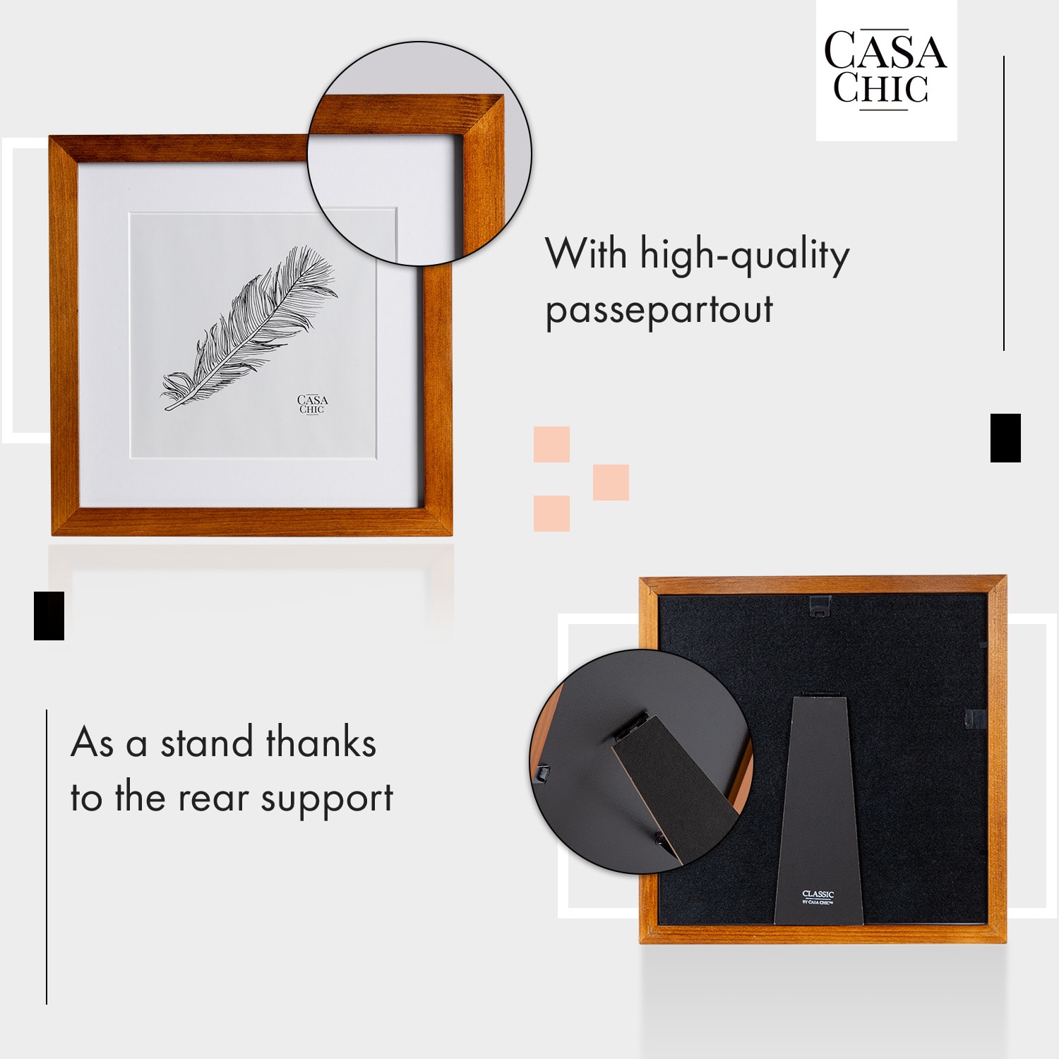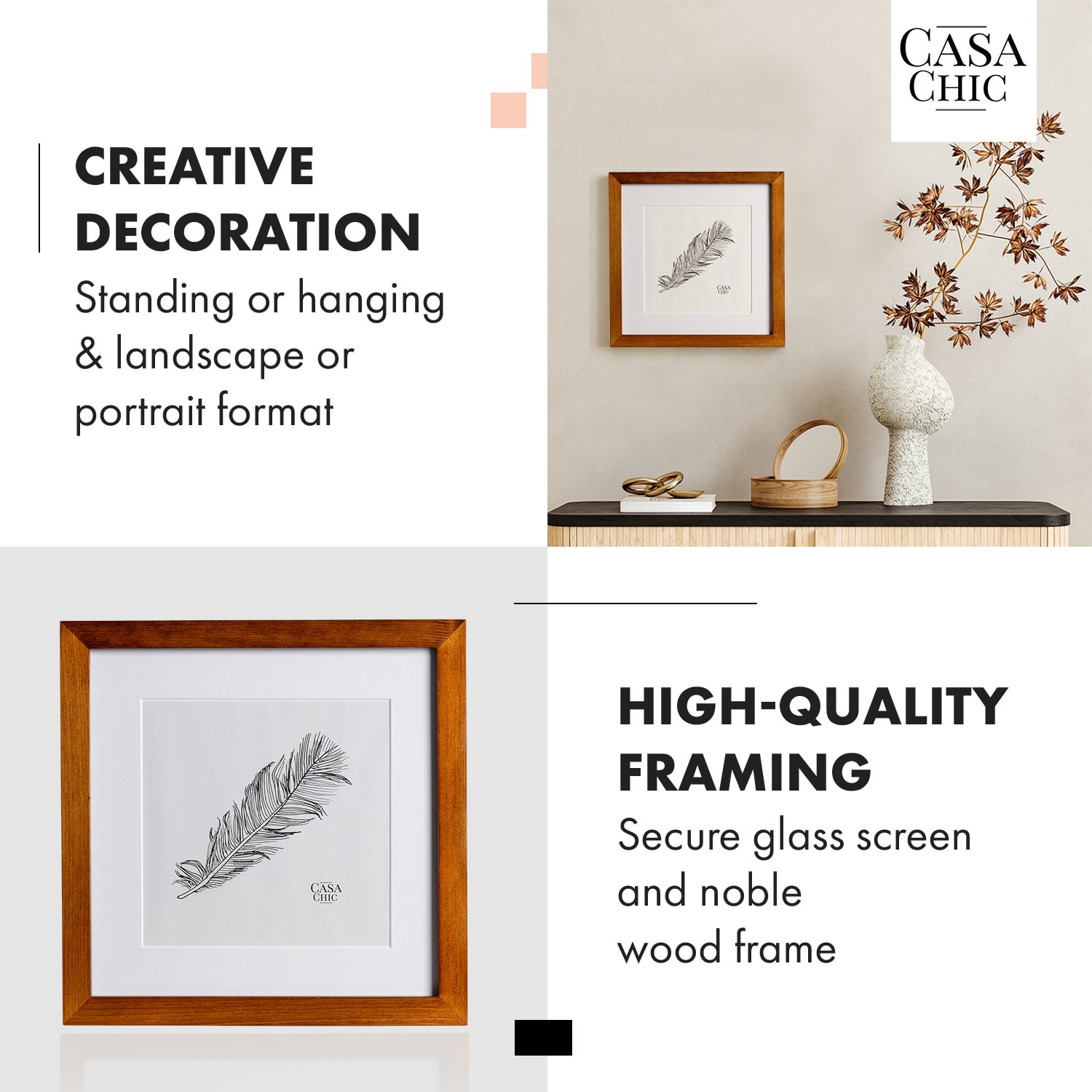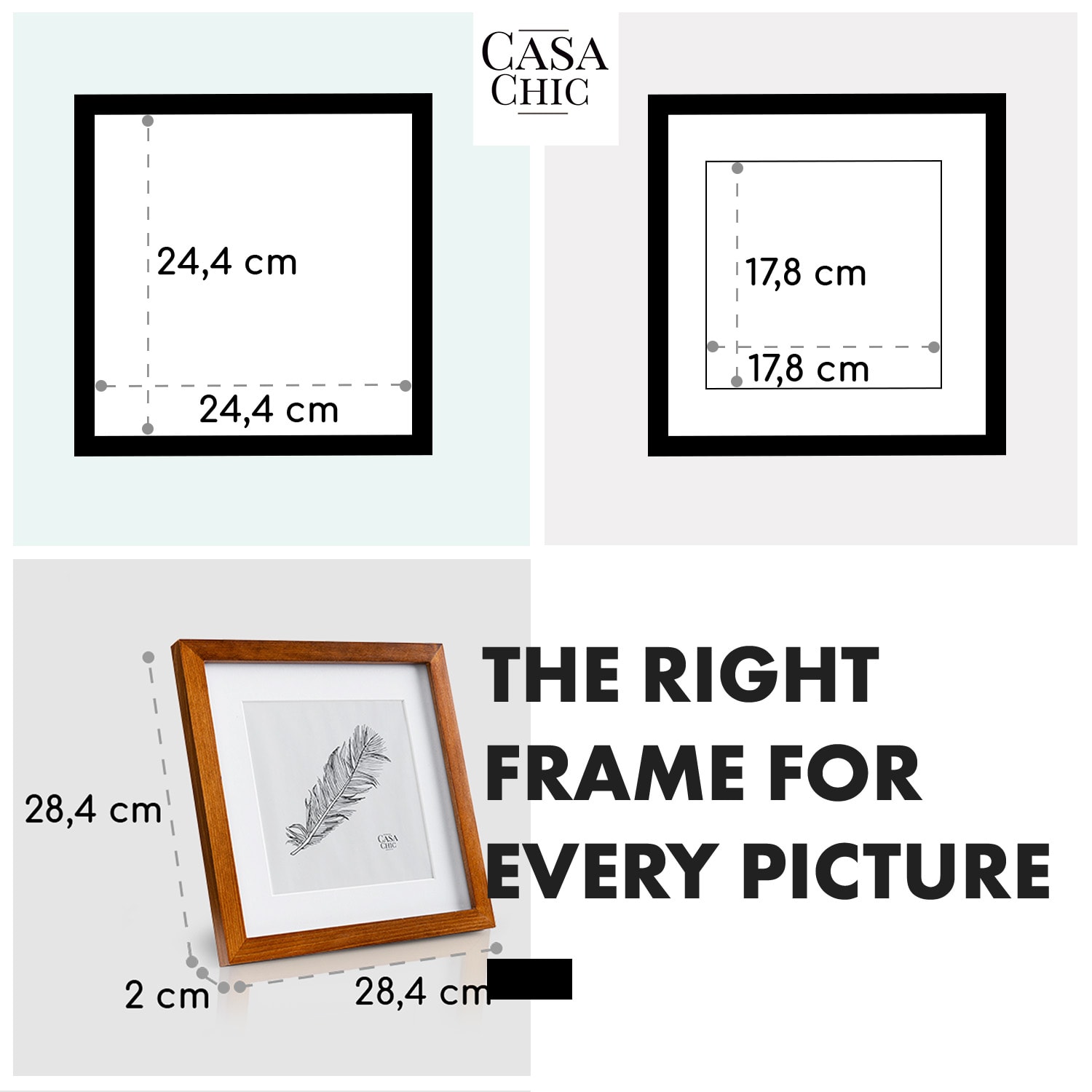 Exkluzívny obrazový rám Bristol od Casa Chic by blumfeldt dodá každej fotografii dokonalý rám. Vysokokvalitné ručné spracovanie sa tu spája s mimoriadne štýlovým dizajnom. Za nerozbitným bezpečnostným sklom nájdu umelecké predmety, výtlačky alebo fotografie optimálnu ochranu pred prachom, vlhkosťou a svetlom. Hĺbka obrazového rámu Bristol krásne zvýrazní vaše fotografie v každej miestnosti a široký profil rámu bude elegantným kontrastom. Vysokokvalitný fotorámik môžete používať na šírku aj na výšku a je vybavený stojanom a závesom na zadnej strane. Bez pasparty je vhodný pre formát obrazu 25 x 25 cm. Za vhodnou paspartou môžete umelecky prezentovať fotografie a obrázky vo formáte 17,5 x 17,5 cm.Samostatne alebo na stenu, na výšku alebo na šírku: fotorám Bristol od Casa Chic by blumfeldt vystaví vaše fotografie do centra pozornosti.