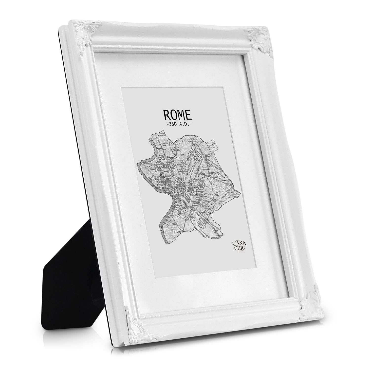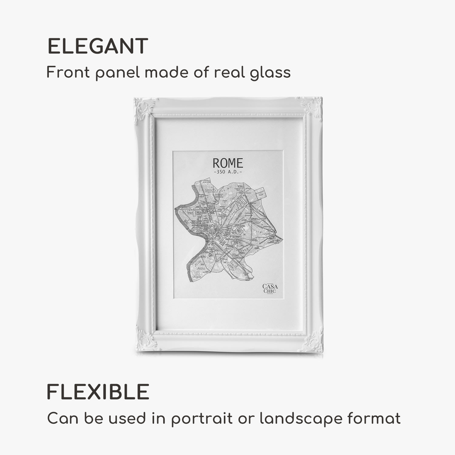 Rámy na obrazy Regent od Casa Chic by blumfeldt sú vyrobené z pravého dreva a zdobené ornamentmi zo syntetickej živice. Dokonale prezentujú tvoje fotografie a obrazy vo formáte na výšku aj na šírku. Dômyselne navrhnutý profil rámu v rokokovom dizajne tvorí nádherný kontrast k modernému zariadeniu. Vytvor nástenné koláže alebo rozmiestni svoje obľúbené fotografie na príborník či na poličku. Priložená pasparta ponecháva výber vhodnej časti obrázku na teba. Sklenená tabuľa chráni pred prachom aj nečistotami a zároveň dotvára elegantný vzhľad rámov Regent.Vždy stredobodom pozornosti: fotorámčeky Regent od Casa Chic by blumfeldt.