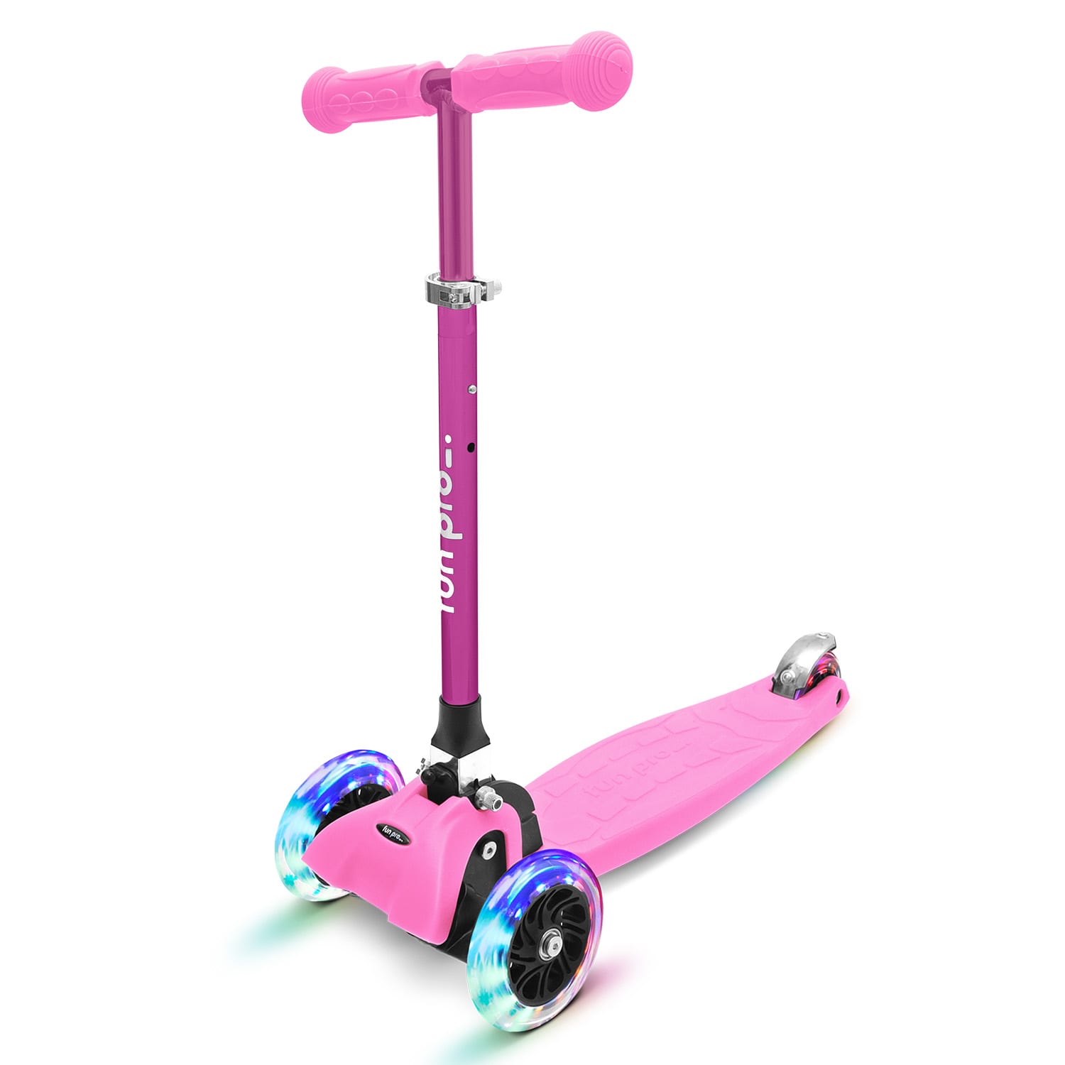 Kolobežka fun pro ONE Deluxe ponúka veľa zábavy pre deti vo veku 3-6 rokov vďaka stabilnej prednej náprave s dvoma kolesami. Verzia Deluxe je vizuálne pôsobivá s eloxovanou rukoväťou s bielymi nápismi. Vďaka príjemnému gravitačnému riadeniu sa detská kolobežka riadi celkom pohodlne prenášaním hmotnosti tela. Tento princíp riadenia je založený na cyklistike a precvičuje sa tak rovnováha. Ďalšou zaujímavosťou tejto štýlovej kolobežky sú jasne svietiace LED kolesá, ktoré vďaka dynamu nevyžadujú výmenu batérie. Bezpečnosť zaisťujú kovové výstuhy na podvozku a spoľahlivá trecia brzda na zadnom kolese. Vďaka skladaciemu a výškovo nastaviteľnému riadidlu sa dá kolobežka tiež ľahko zložiť a uložiť.