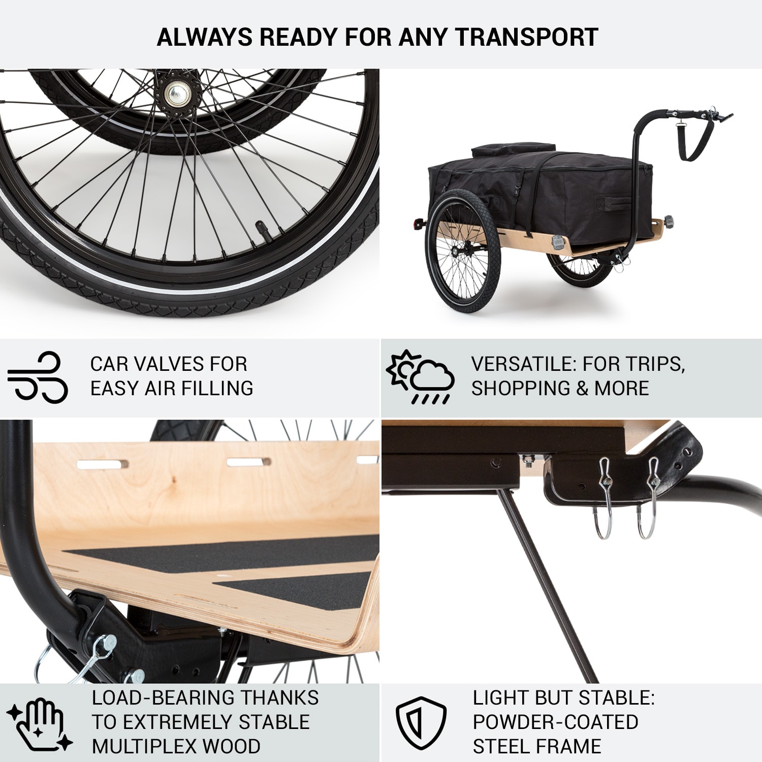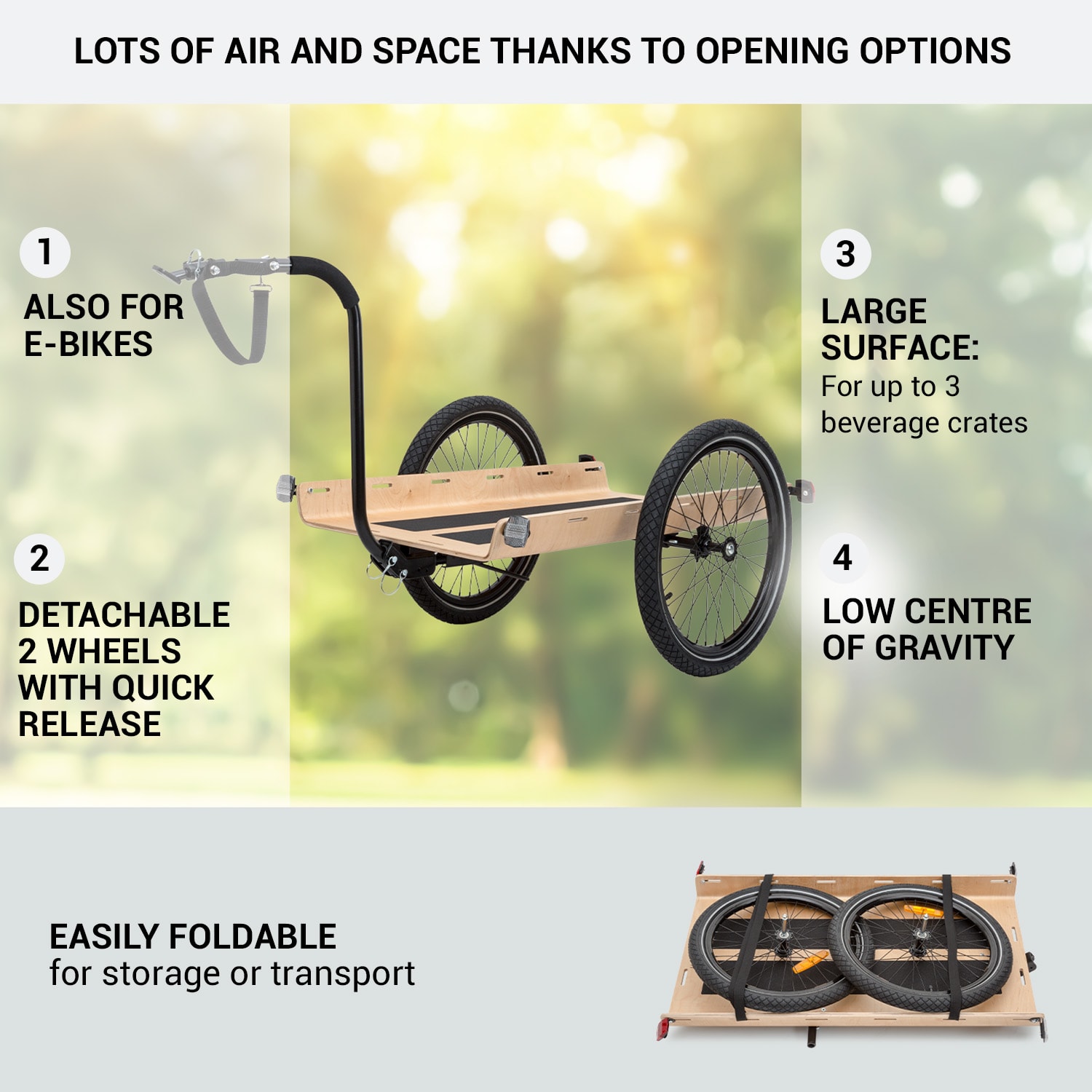 Dobíjajte a prepravujte ekologicky! Nákladný príves Companion Travel L od Klarstein je špecialistom, pokiaľ ide o jednoduchú prepravu na bicykli alebo pešo – na nákupy, záhradkárčenie, pikniky, športové vybavenie na tréning v prírode alebo dokonca na trekingové túry na bicykli. Do veľkého nákladného priestoru prívesu na bicykel Companion Travel L od Klarfit sa ľahko zmestí batožina, ako aj tri prepravky na nápoje, vrecia so zeminou alebo kompletné kempingové vybavenie. Príves so stabilnou konštrukciou z 1 cm hrubého multiplexového dreva má nosnosť až 40 kg. Dodávané napínacie popruhy odolné proti roztrhnutiu sú upevnené na oboch stranách v piatich úchytoch a istia náklad. Používanie ručne alebo na bicykli je určené výlučne upevnením oje. S dvoma bezpečnostnými čapmi ju môžete umiestniť ako vysoko alebo nízke oje. Rozkladací stojan zabezpečuje pevné postavenie vozíka s jednou nápravou. Vysoký komfort pri rolovaní zabezpečujú 16″ pneumatiky s bezskrutkovým zásuvným systémom a hrubými 1,95″ dušami. Dve biele a dve červené odrazové sklíčka sú už namontované pre dobrú viditeľnosť v cestnej premávke.Na dlhšie trekingové túry alebo na všeobecnú ochranu pred poveternostnými vplyvmi a nečistotami sú k dispozícii objednateľné nepremokavé prepravné tašky.Zdravé, ekologické a veľmi jednoduché: s prívesom na bicykel a ručným vozíkom Companion Travel L od Klarfit sa môžete vydať na trekking alebo dokonca na ťažkú prepravu bez auta.Upozorňujeme, že sa pre úplnú bezpečnosť prívesu na ceste vyžaduje červené zadné svetlo.