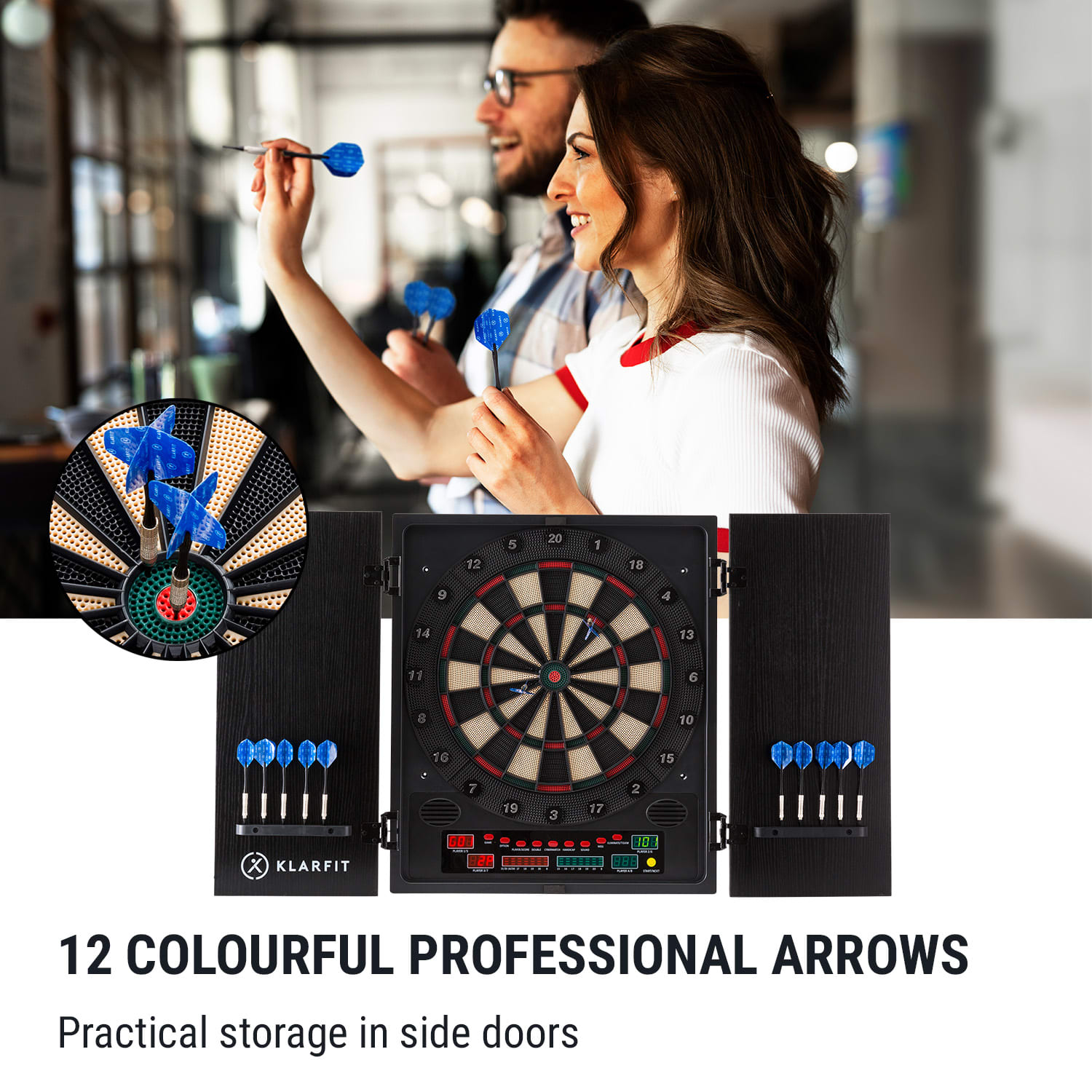 Trefa priamo do čierneho! So šípkami Klarfit Dartmaster 180 môžete do svojej obývačky alebo párty miestnosti priniesť čistú zábavu pri hraní šípok. Súprava šípok od spoločnosti Klarfit pozostáva z profesionálneho šípkového terča s elektronickým LED displejom, ako aj z dvanástich šípok, 24 šípkových hrotov a napájacieho zdroja. Elegantný terč na šípky možno v niekoľkých krokoch nastaviť a namontovať na stenu – a cielené hádzanie šípok sa môže začať. Špeciálna funkcia: Počas prestávok v hre môžete jednoducho zatvoriť predné dvierka, aby váš hrací disk zostal dobre chránený a skrytý. Začiatočníci môžu trénovať vo voľnom čase s Dartmaster 180, zatiaľ čo skutoční profesionáli môžu súťažiť s počítačovým súperom, ktorému možno nastaviť rôzne úrovne obtiažnosti. Vysokokvalitný LED displej je mimoriadne praktický, pretože zobrazuje skóre všetkých hráčov. Papier, ceruzka a ťažkopádne mentálne aritmetické cvičenia sú už minulosťou. Šípkový počítač vykonáva výpočty i zapamätanie. Klarfit Dartmaster 180 skryté šípky sú hitom pre začiatočníkov aj profesionálov: Original English pub feeling pre váš domov!