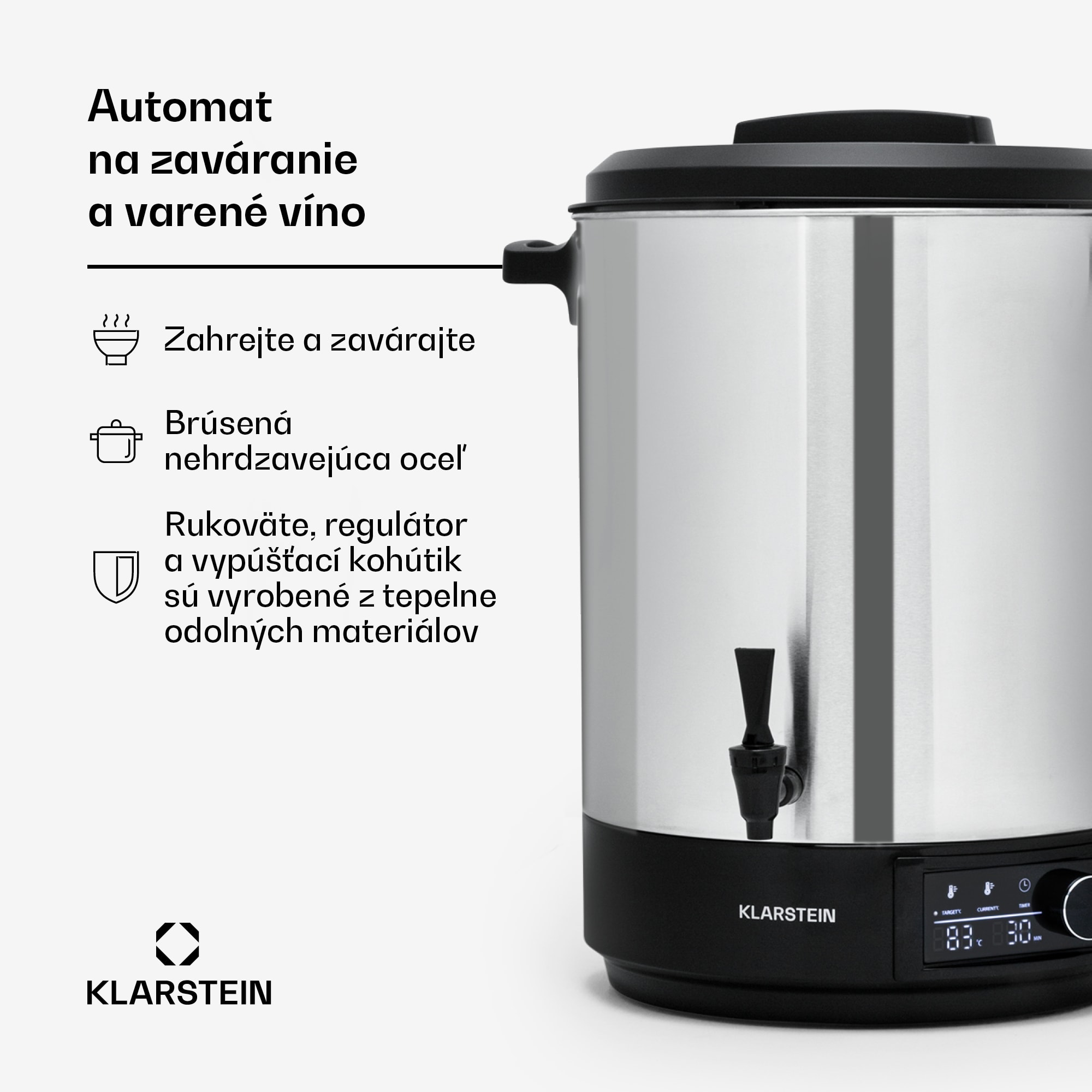 Lahôdky zo zaváraninových pohárov: Zavárací automat Abbey 40 od Klarstein je naša hviezda, pokiaľ ide o konzervovanie domácich džemov a vašich vlastných ovocných a zeleninových výtvorov.Dnes varíme, zavárame! Hrniec na konzervovanie Abbey 40 od Klarsteinprináša do jedálneho lístka rozmanitosť – dlhodobo. 40 litrový hrniec na konzervovanie ponúka dostatok priestoru na to, aby sa obsah vašich zaváracích pohárov teplom premenil na trvácne zaváraniny. Či už ide o úrodu ovocia alebo zeleniny, sladké džemové výtvory, slané klobásové zmesi alebo hotové guláše, pečienky či rolády – vďaka voliteľným teplotám 30 – 100 °C a dobe varenia do 180 minút sú v Abbey 40 spoľahlivo zachované.Vďaka chuťovo neutrálnemu a hygienickému interiéru z nehrdzavejúcej ocele, výpustnému kohútiku s Cool-Touch povrchom a integrovanej funkcii udržiavania teploty je ideálny aj ako dávkovač horúcich nápojov na čaj, punč alebo varené víno.