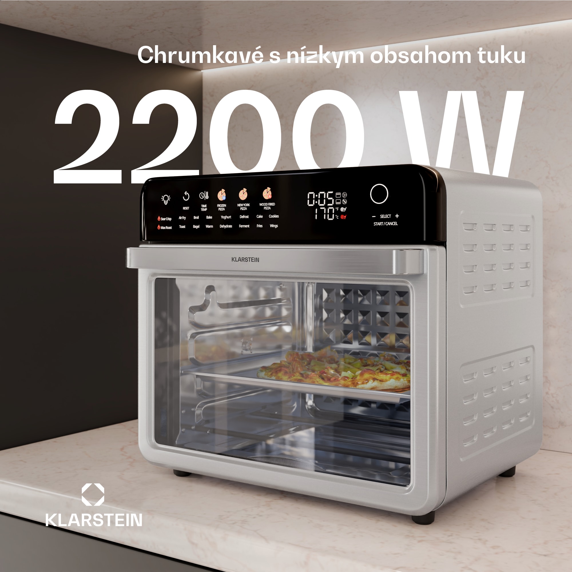 Teplovzdušná fritéza Klarstein AirGlaze Digital je ideálnym kuchynským zariadením pre gurmánov, ktorí dbajú o svoje zdravie. Vďaka inovatívnej teplovzdušnej technológii si môžete vychutnať chrumkavé pokrmy s nízkym obsahom tuku, ktoré sú rovnako chutné ako vyprážané jedlá – ale bez zbytočných kalórií.Teplovzdušná fritéza AirGlaze Digital s veľkým objemom 34 litrov a 19 prednastavenými programami vrátane špeciálnych funkcií na prípravu pizze ponúka flexibilitu a pohodlie pri príprave každého jedla. Integrovaná funkcia rotisserie zabezpečuje rovnomerné prepečenie mäsa s menším množstvom tuku a moderný dizajn s farebným digitálnym displejom a dotykovým ovládaním umožňuje presnú reguláciu teploty. Šesť robustných výhrevných telies z nehrdzavejúcej ocele a dvojité sklo dvierok zaručujú odolnosť a dokonalé výsledky varenia. Okrem toho vám čistenie uľahčí odnímateľné príslušenstvo, ktoré možno umývať v umývačke riadu, ako napríklad kameň na pizzu a grilovacie rošty.Vyskúšajte všestrannosť a pohodlie teplovzdušnej fritézy Klarstein AirGlaze Digital a urobte revolúciu vo svojej kuchyni už teraz!