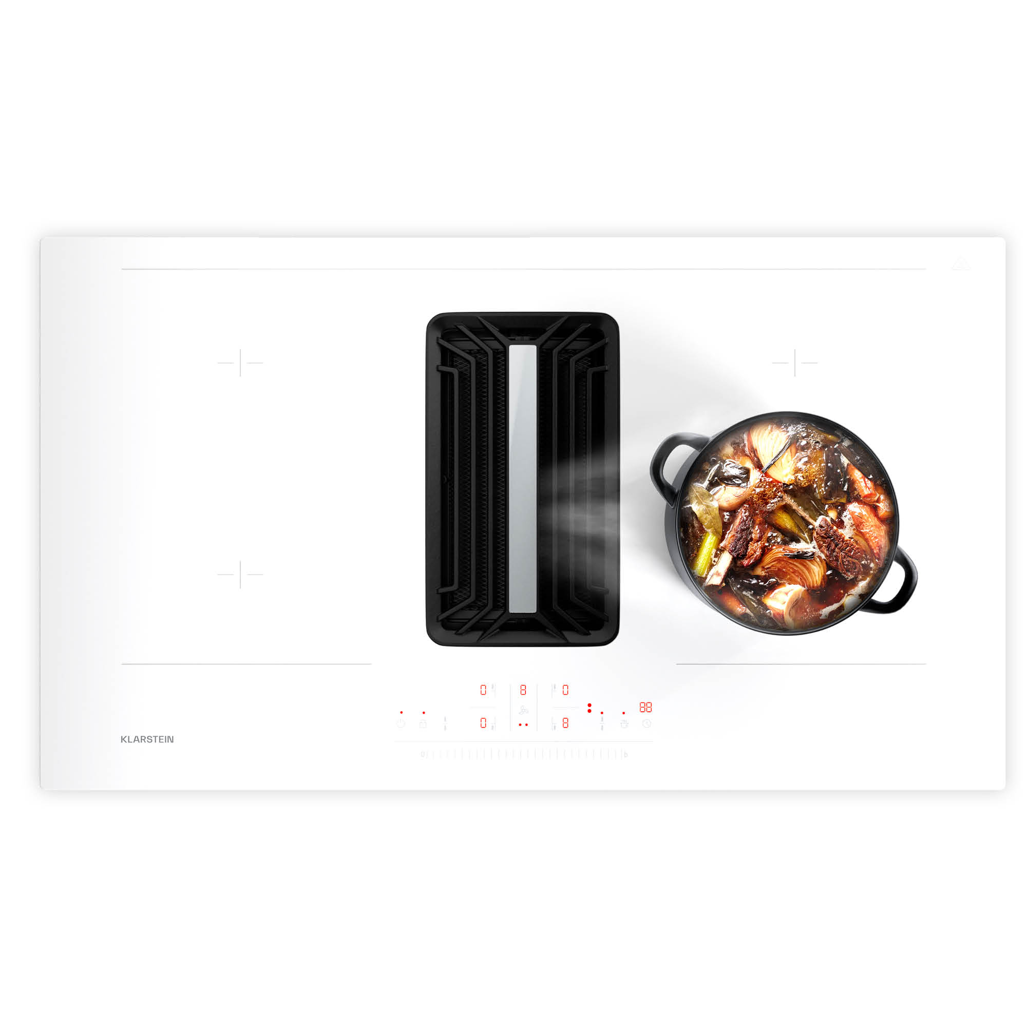 Priamo v strede, ako len popri tom: DownAir systém AirJet 90 od Klarstein prináša revolúciu do kuchyne tak, že priamo kombinuje svoju indukčnú varnú dosku s DownAir digestorom. Vyžaduje si len minimálny priestor 20 cm a je výkonnejší ako takmer všetky ostatné systémy. Indukčná varná doska DownAir Systému AirJet 90 od Klarstein prináša do vašej kuchyne štyri výkonné varné plochy. Vďaka systému VarioHeating možno dve varné zóny prakticky spojiť a vytvoriť tak jednu veľkú flexibilnú zónu, napríklad pre rajnice alebo veľké hrnce a panvice. Každú jednotlivú zónu možno tiež vďaka funkcii Booster zosilniť, aby sa zvýšil jej výkon.V strede vašej novej kuchyne bije silné odsávacie srdce: digestor DownAir pre prevádzku s recirkuláciou alebo odsávaním vzduchu. Ako súčasť varnej dosky nikdy nezakrýva výhľad a nevyžaduje ani priestor nad ňou. Preto sa perfektne hodí do kuchýň s centrálnym ostrovčekom ako aj do úzkych kuchynských liniek. S vysokým recirkulačným prietokom až 750 m³/h je mimoriadne účinný.Výkon varných zón ako aj DownAir systému ovládate pomocou dotykovej plochy. Všetky ovládacie prvky sú priamo zabudované do sklenenej plochy, tak aby žiadne gombíky nerušili bezchybný vzhľad. Detekcia hrnca, funkcia časovača a detská poistka dokonale dopĺňajú rozsah použitia varnej dosky.Kúpte si teraz Klarstein AirJet 90 DownAir System a prineste do svojej kuchyne revolučnú účinnosť a dizajn!Upozornenie: Odporúčame, aby montáž systému Klarstein Full House Down Air System vykonával kvalifikovaný personál v súlade s návodom na obsluhu.Upozornenie: Farba produktu sa môže mierne líšiť od zobrazenia na fotografii.