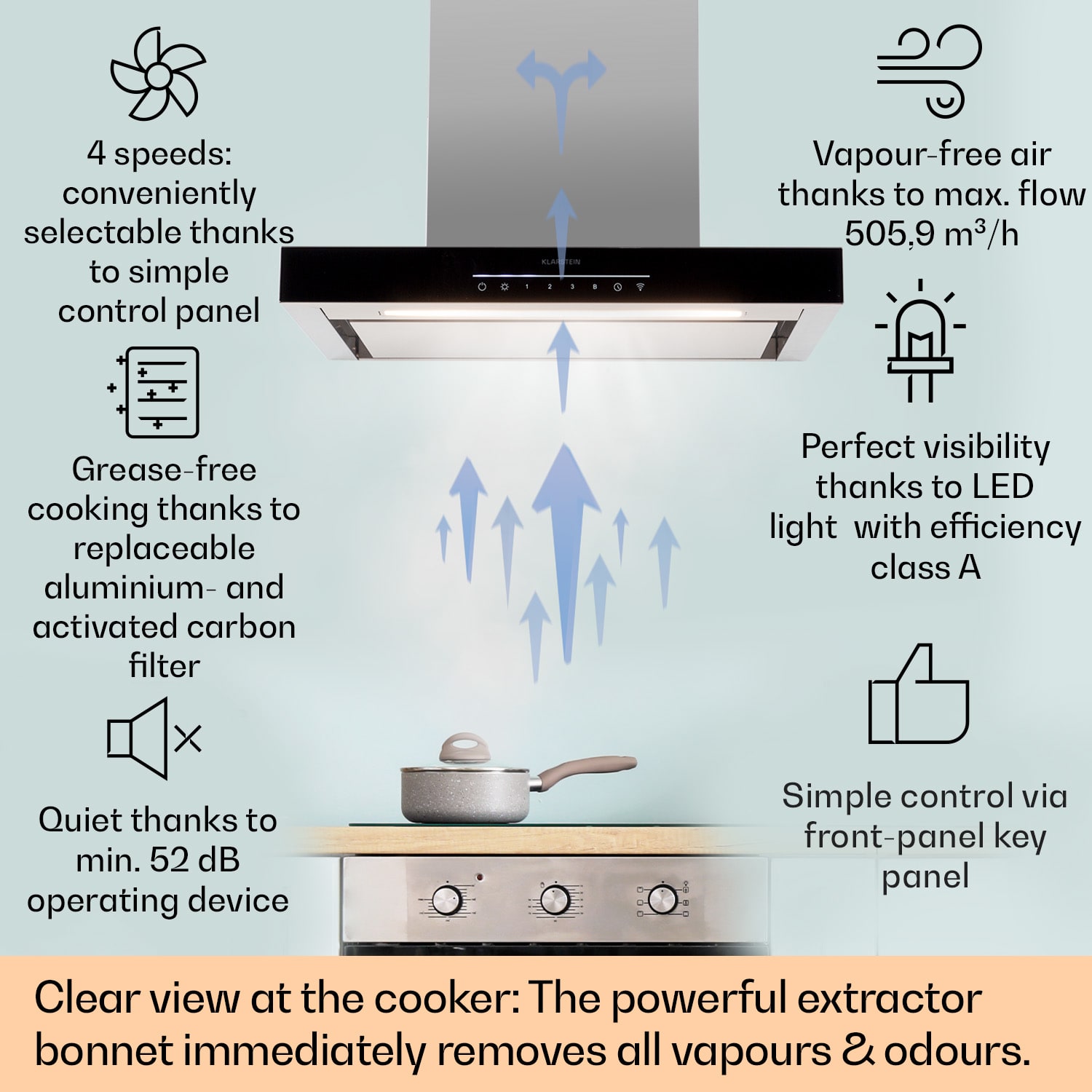 Vitajte v novej generácii digestorov. Digestor Alinea od Klarstein obohatí každú kuchyňu o ochotného pomocníka pri odstraňovaní pary, dymu a pachov z jedla.So šírkou 60 cm sadigestor Alinea od Klarstein ideálne hodí nad malé až stredne veľké varné plochy a kuchynské linky. Z technického hľadiska presvedčí nielen prietokom odsávaného vzduchu až 500 m³/h, ale aj mimoriadne jednoduchou obsluhou. Funguje to jednoducho buď cez WiFi s aplikáciou Klarstein, alebo priamo cez dotykovú časť Red Line Touch na prednej strane. Tu si môžete vybrať nielen tri úrovne odsávania, funkciu vysokého výkonu alebo časovač po vetraní. Umožňuje tiež regulovať jas a teplotu integrovaného LED osvetlenia varnej dosky.Digestor Alinea je určený na nástennú montáž; potrebný montážny materiál a lišty pre hadicu odsávaného vzduchu sú súčasťou balenia. Digestor môžete jednoducho prestavať na prevádzku s recirkuláciou vzduchu. Dva filtre s aktívnym uhlím na filtrovanie zápachu sú priamo súčasťou balenia.Jasný výhľad v kuchyni: S nástenným digestorom Alinea od Klarstein rýchlo zmiznú pachy jedla, pary a zvyšky mastnoty.