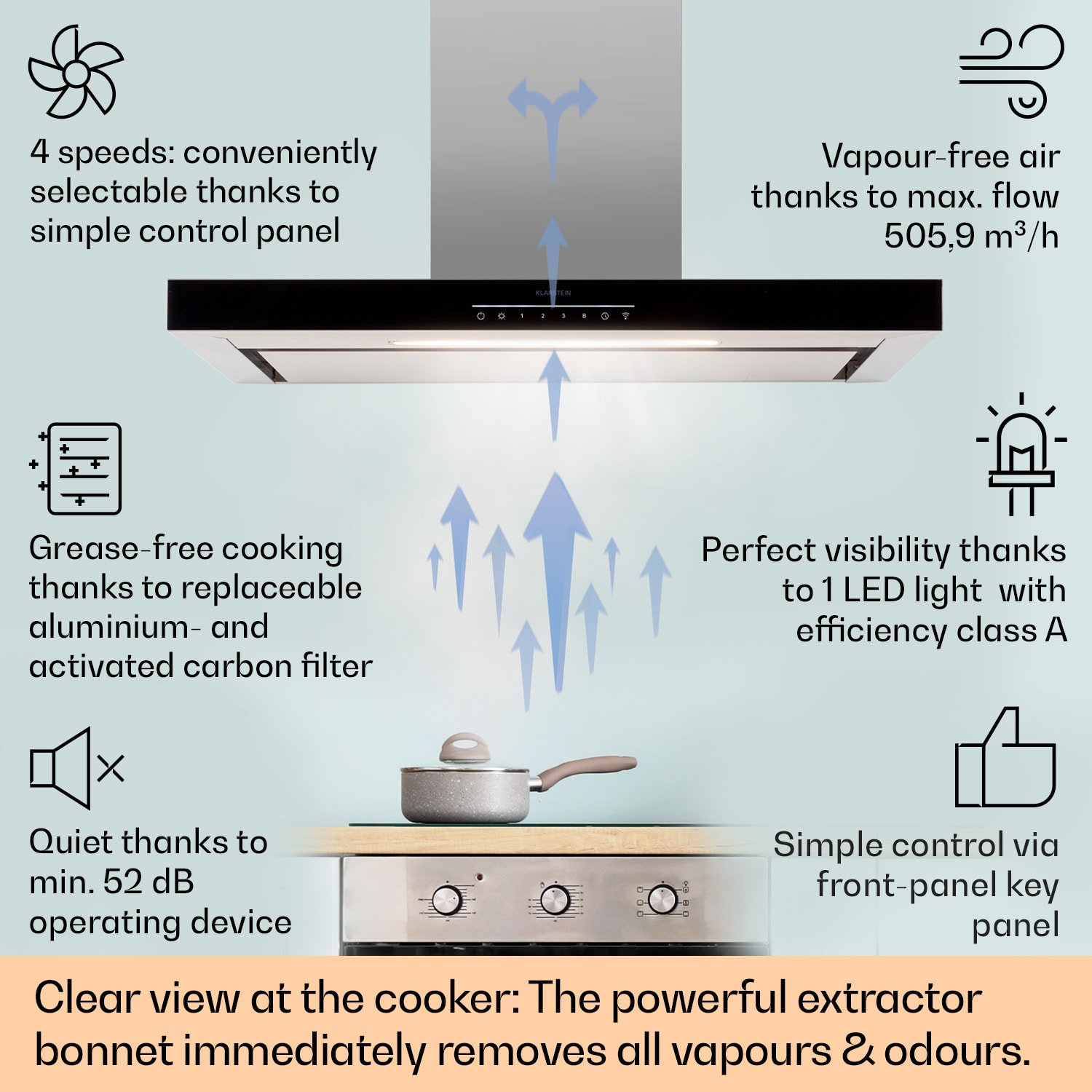 Vitajte v novej generácii digestorov. Digestor Alinea od Klarstein obohatí každú kuchyňu o ochotného pomocníka pri odstraňovaní pary, dymu a pachov z jedla.So šírkou 90 cm sadigestor Alinea od Klarstein ideálne hodí nad stredne veľké až veľké varné plochy a kuchynské linky. Z technického hľadiska presvedčí nielen prietokom odsávaného vzduchu až 500 m³/h, ale aj mimoriadne jednoduchou obsluhou. Funguje to jednoducho buď cez WiFi s aplikáciou Klarstein, alebo priamo cez dotykovú časť Red Line Touch na prednej strane. Tu si môžete vybrať nielen tri úrovne odsávania, funkciu vysokého výkonu alebo časovač po vetraní. Umožňuje tiež regulovať jas a teplotu integrovaného osvetlenia varnej dosky LED.Digestor Alinea je určený na nástennú montáž; potrebný montážny materiál a lišty pre hadicu odsávaného vzduchu sú súčasťou balenia. Digestor môžete jednoducho prestavať na prevádzku s recirkuláciou vzduchu. Dva filtre s aktívnym uhlím na filtrovanie zápachu sú priamo súčasťou balenia.Jasný výhľad v kuchyni: S nástenným digestorom Alinea od Klarstein rýchlo zmiznú pachy jedla, pary a zvyšky mastnoty.