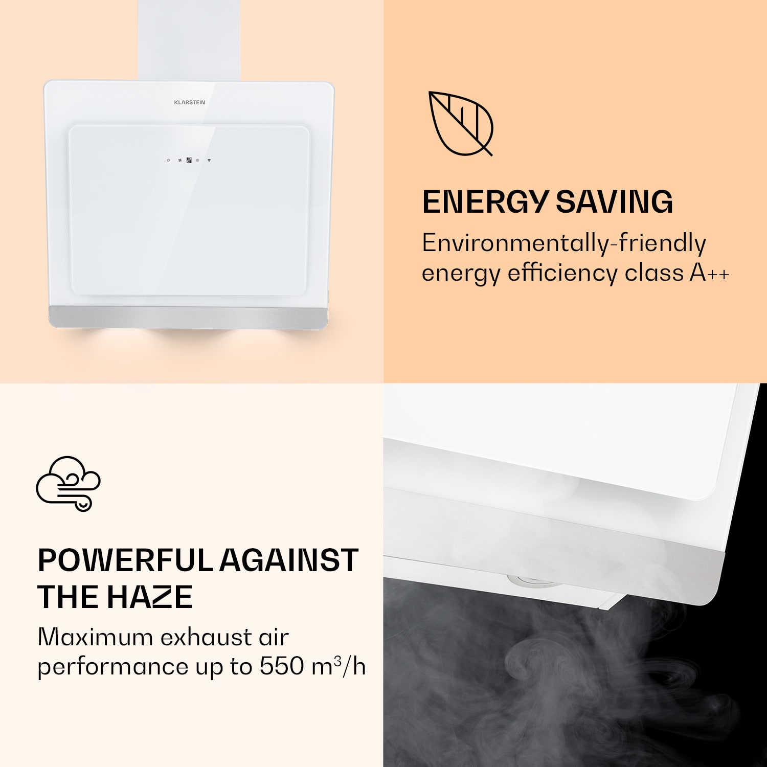 Klarstein Aurora 60 Smart, digestor, 60 cm, komínový, 550 m³/h, LED podsvietenie, A++, biely –Kúpiť