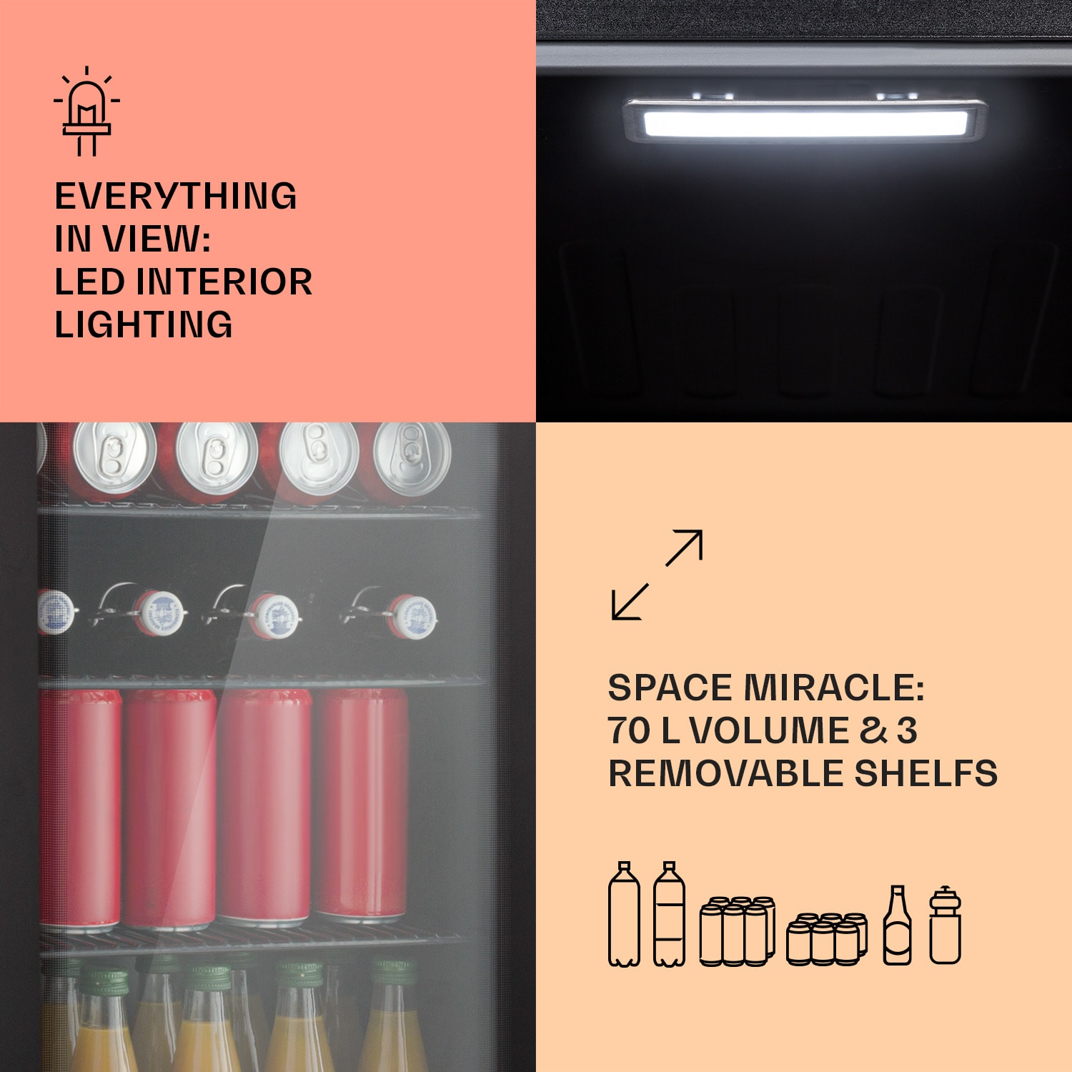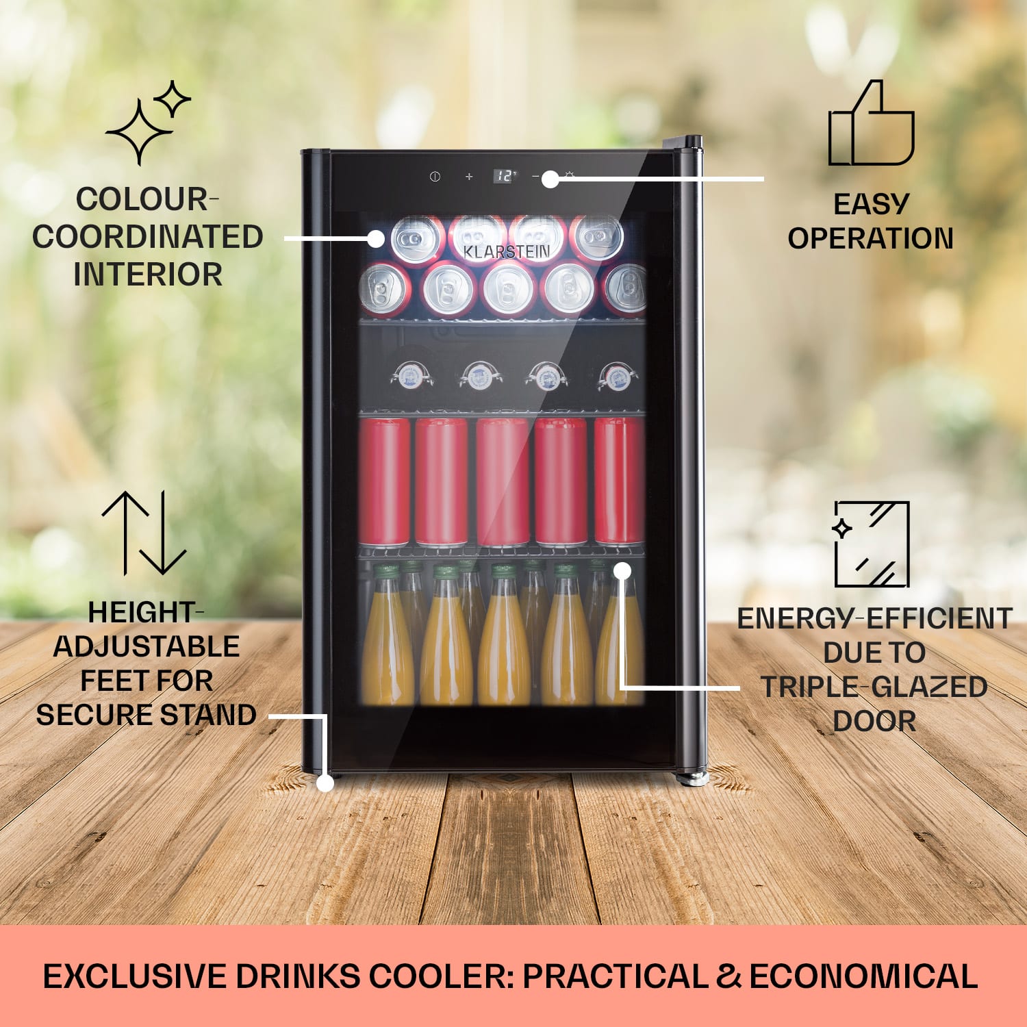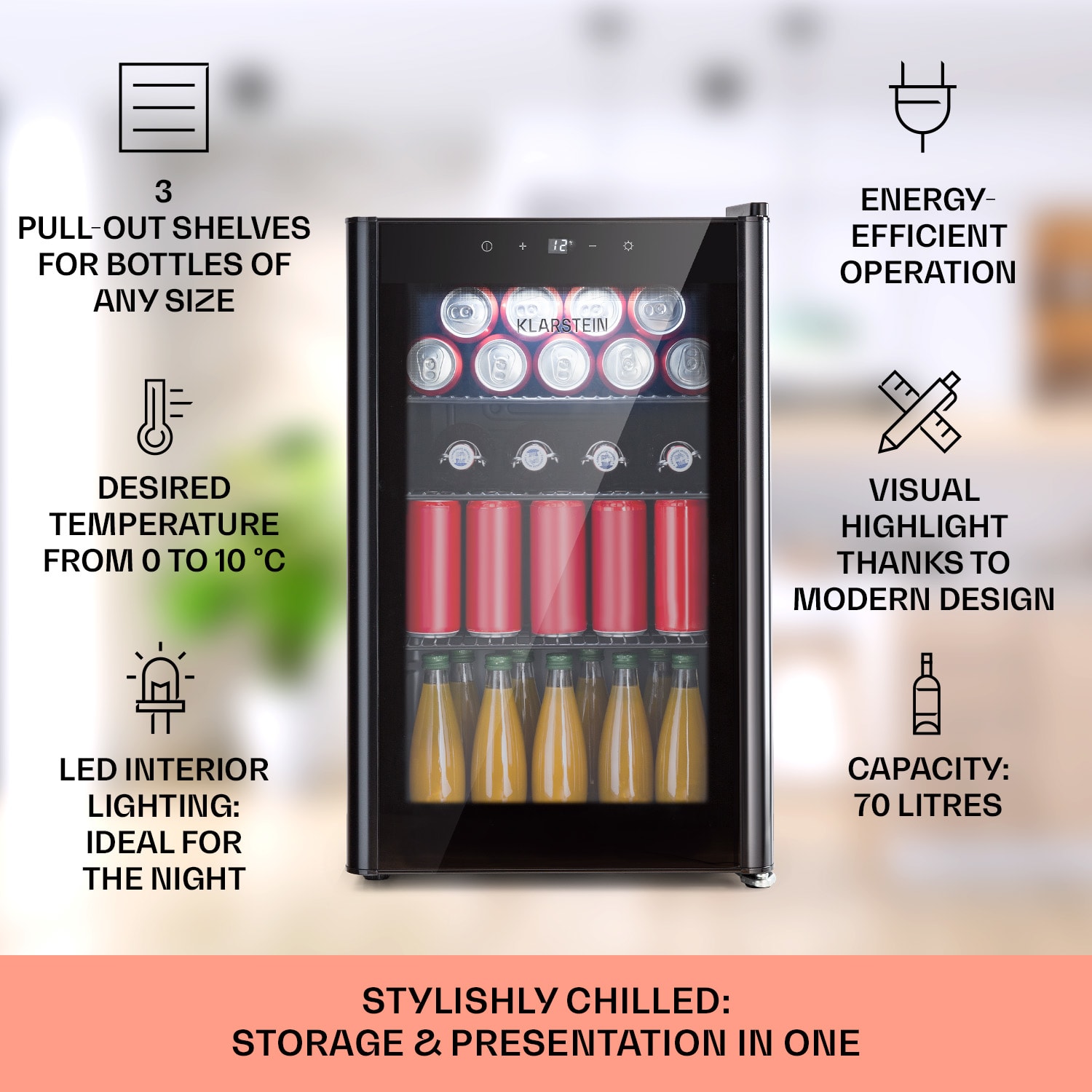 Dobre vychladené osvieženie chutí lepšie: Klarstein Beercafe 70 je kompaktná chladnička na nápoje s objemom 70 litrov.Tri kovové mriežkové police ponúkajú dostatok priestoru na potraviny a nápoje Trojitá izolácia panoramatických sklenených dvierok udržuje chlad vo vnútri a teplo vonku. Sklenená predná strana s čiernym rámom skvele dopĺňa čierny interiér. Ďalšou zaujímavosťou je vnútorné LED osvetlenie, ktoré dodáva Beercafe 70 ten správny šmrnc. Teplotu chladenia možno pohodlne nastaviť na 0 až 10 °C pomocou externého dotykového ovládacieho panela, čo zaistí vždy osviežujúco chladené nápoje. Chladnička Beercafe 70 od Klarstein vychladí nápoje na osviežujúcu teplotu.