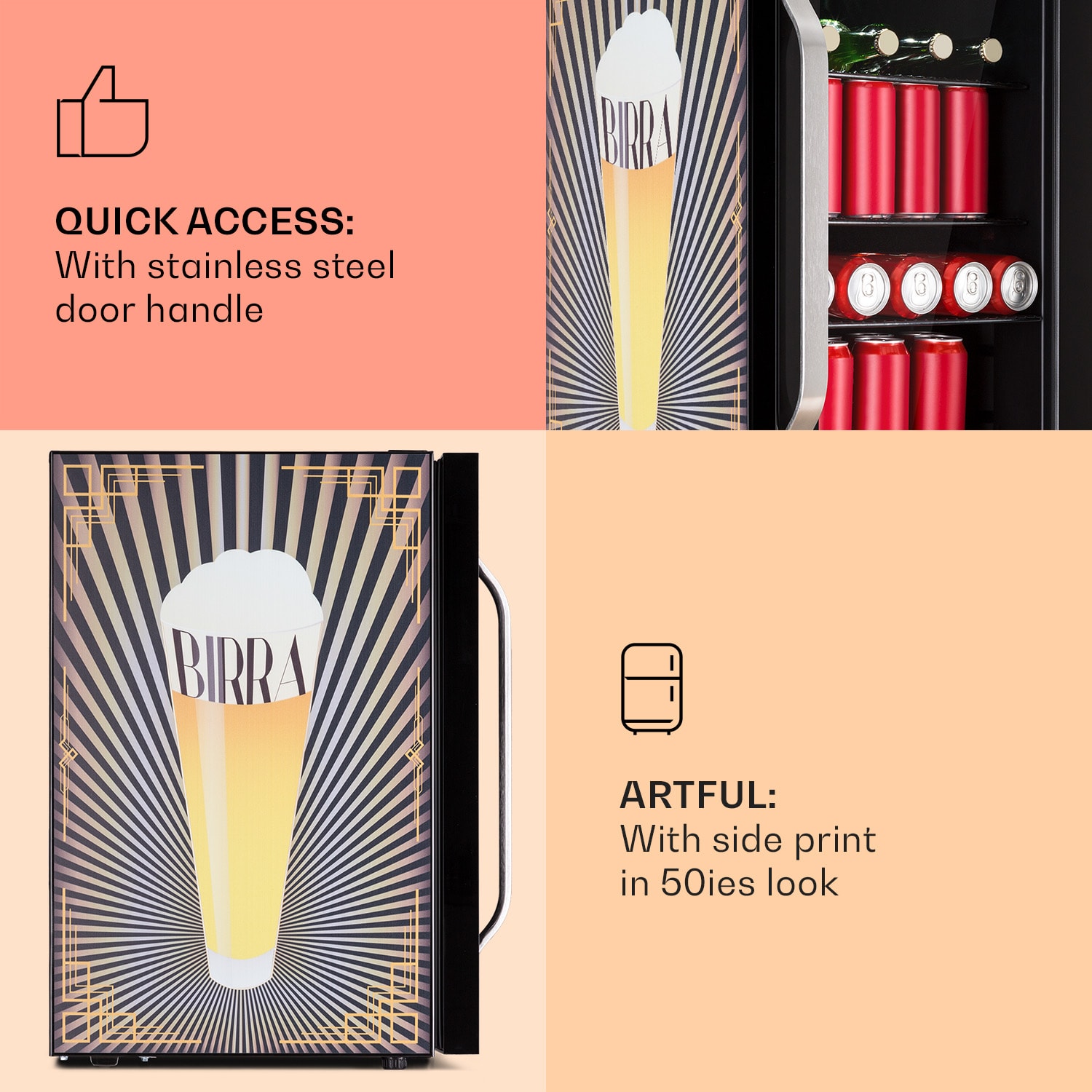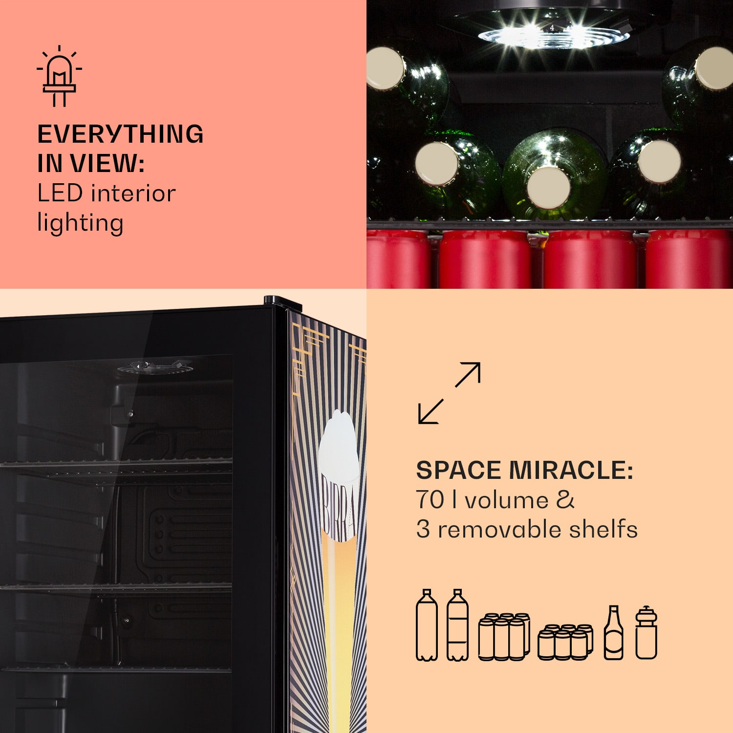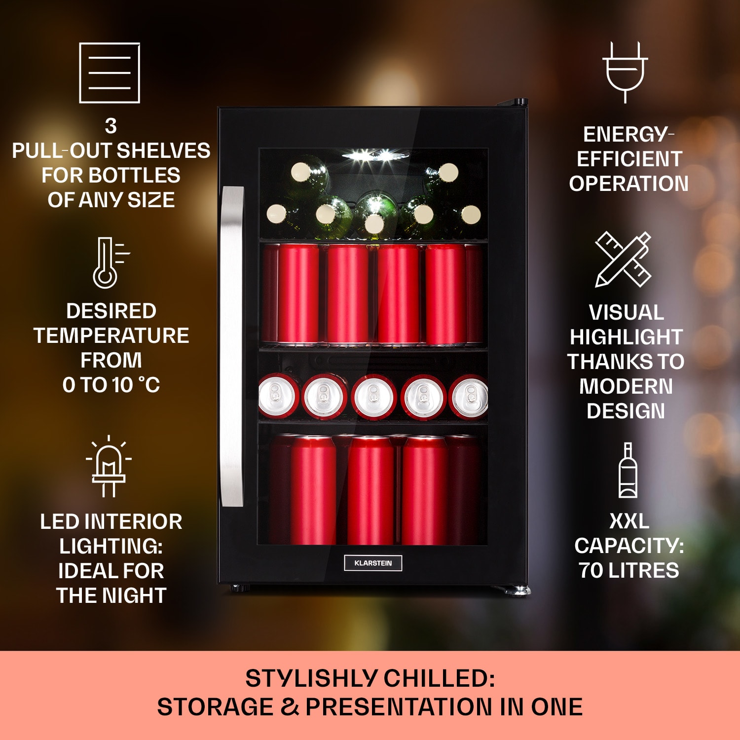 Dobre vychladené osvieženie je lepšie: Klarstein Beersafe 70 je kompaktná chladnička na nápoje s objemom 70 litrov. V trblietavej edícii Birra osvieži svoje okolie štýlovou potlačou s motívom piva a dodá kuchyni alebo hobby miestnosti extra šmrnc. Tri pochrómované kovové police ponúkajú dostatok priestoru na potraviny a nápoje. Dvojitá izolácia panoramatických sklenených dvierok udržuje chlad vo vnútri a teplo vonku. Predná časť z brúsenej nehrdzavejúcej ocele vytvára dobrý kontrast k čiernemu interiéru. Ďalšou zaujímavosťou je vnútorné LED osvetlenie, ktoré dodáva Beersafe 70 ten správny šmrnc. Teplotu chladenia možno pohodlne nastaviť pomocou 5-stupňového otočného ovládača od 0 do 10°C. Chladnička Beersafe 70 od Klarstein schladí nápoje na osviežujúcu teplotu.