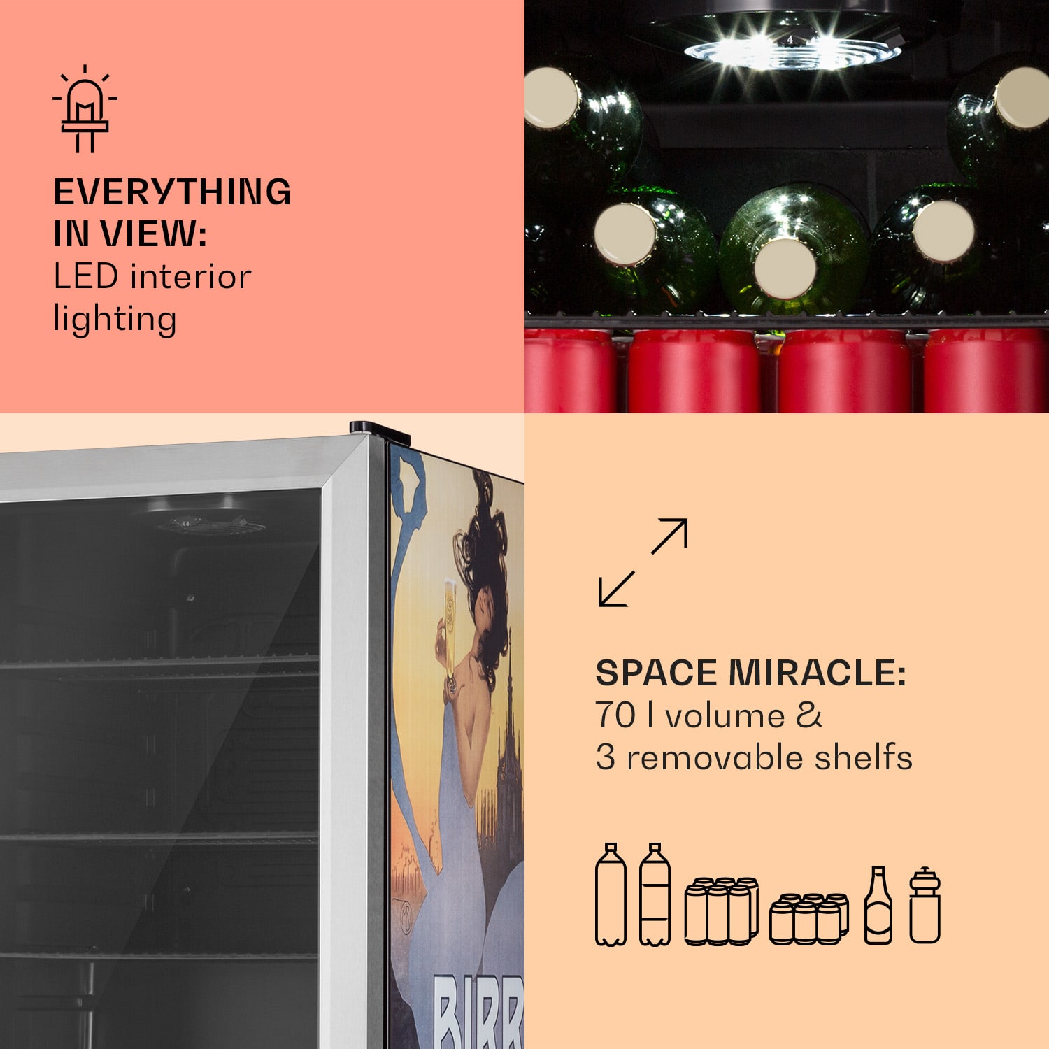 Dobre vychladené osvieženie je lepšie: Klarstein Beersafe 70 je kompaktná chladnička na nápoje s objemom 70 litrov. V trblietavej edícii Birra Milano osvieži svoje okolie štýlovou potlačou s motívom piva a dodá kuchyni alebo hobby miestnosti extra šmrnc.Tri pochrómované kovové police ponúkajú dostatok priestoru na potraviny a nápoje. Dvojitá izolácia panoramatických sklenených dvierok udržuje chlad vo vnútri a teplo vonku. Predná časť z brúsenej nehrdzavejúcej ocele vytvára dobrý kontrast k čiernemu interiéru. Ďalšou zaujímavosťou je vnútorné LED osvetlenie, ktoré dodáva Beersafe 70 ten správny šmrnc. Teplotu chladenia možno pohodlne nastaviť pomocou 5-stupňového otočného ovládača od 0 do 10°C. Chladnička Beersafe 70 od Klarstein schladí nápoje na osviežujúcu teplotu.