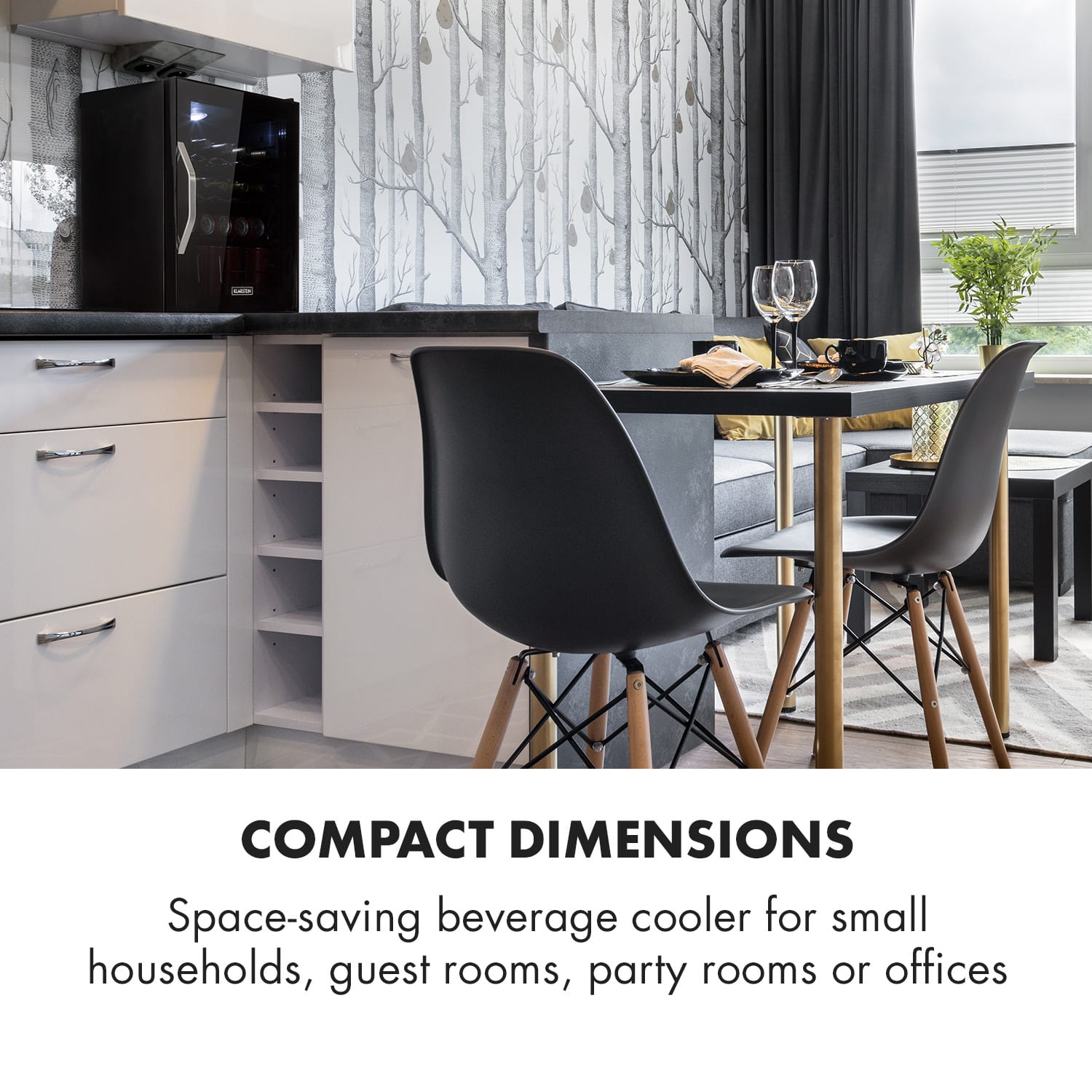 Dokonalé chladenie v luxusnej čiernej farbe. Chladnička na nápoje Klarstein Beersafe XL Onyx je ideálnym miestom na uloženie čerstvých potravín a chladných nápojov v malých domácnostiach, párty miestnostiach, kanceláriách alebo v záhradných domčekoch! So svojimi kompaktnými rozmermi je chladnička na nápoje Klarstein Beersafe XL Onyx veľmi veľká z hľadiska úložného priestoru: 60 litrov úžitkového miesta na dvoch kovových roštoch poskytuje dostatok priestoru pre širokú škálu potravín od jogurtu a syra cez mäso až po zeleninu alebo tiež na chladenie osviežujúcich nápojov. Šesť políc s odstupom po 8 cm poskytuje s konceptom Mixed Cooling Concept rozličné možnosti flexibilného usporiadania vnútorného priestoru zariadenia. Obzvlášť praktické sú štyri rošty: dve police s vlnitým tvarom sú ideálne na ležaté skladovanie fliaš, plochý kovový rošt je vhodný na potraviny alebo plechovky s nápojmi a stojan na šampanské je ideálnym miestom na skladovanie fliaš so šampanským alebo sektom. Na chladenie je k dispozícii podľa voľby 5 úrovní regulácie výkonu. Zariadenie Beersafe XL Onyx vytvára osobitný dojem predovšetkým svojím senzačným dizajnom: sklenené dvere s rámom z ušľachtilej ocele umožňujú neustály pohľad do interiéru matnej čiernej konštrukcie. Samostatne zapínateľné LED svetlo v interiéri zariadenia osvetľuje skladované potraviny chladným bielym svetlom. Vďaka systému EcoExcellence je zariadenie Klarstein Beersafe XL Onyx mimoriadne šetrné k životnému prostrediu: jeho výkonný kompresný chladiaci systém pracuje tak efektívne, že si zaslúžil triedu energetickej účinnosti D. S hladinou hluku len 46 dB je okrem toho zariadenie mimoriadne tiché, čo umožňuje jeho využitie v hotelových alebo hosťovských izbách. Elegantná, energeticky efektívna a výhodná pre každú malú domácnosť: chladnička na nápoje Klarstein Beersafe XL Onyx.