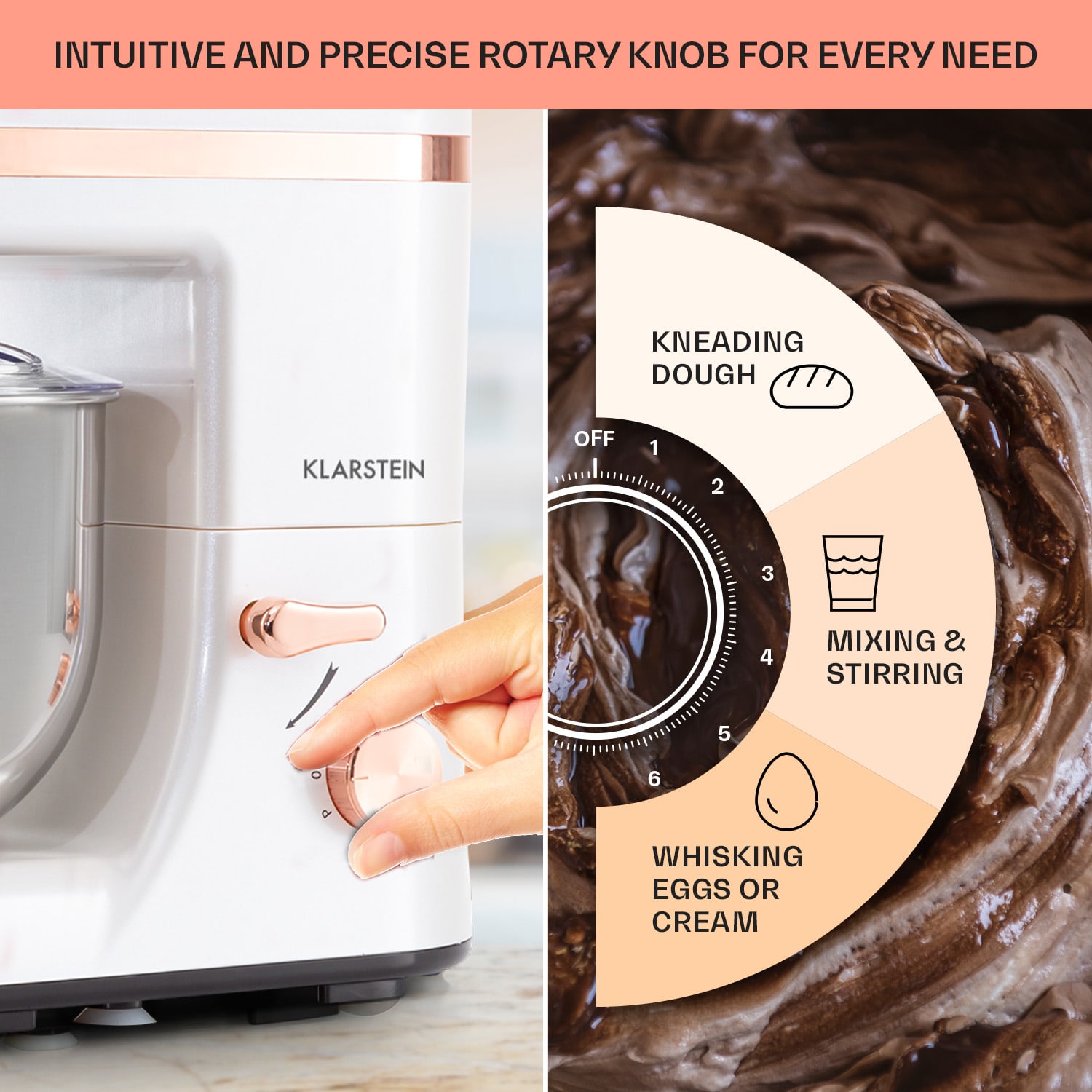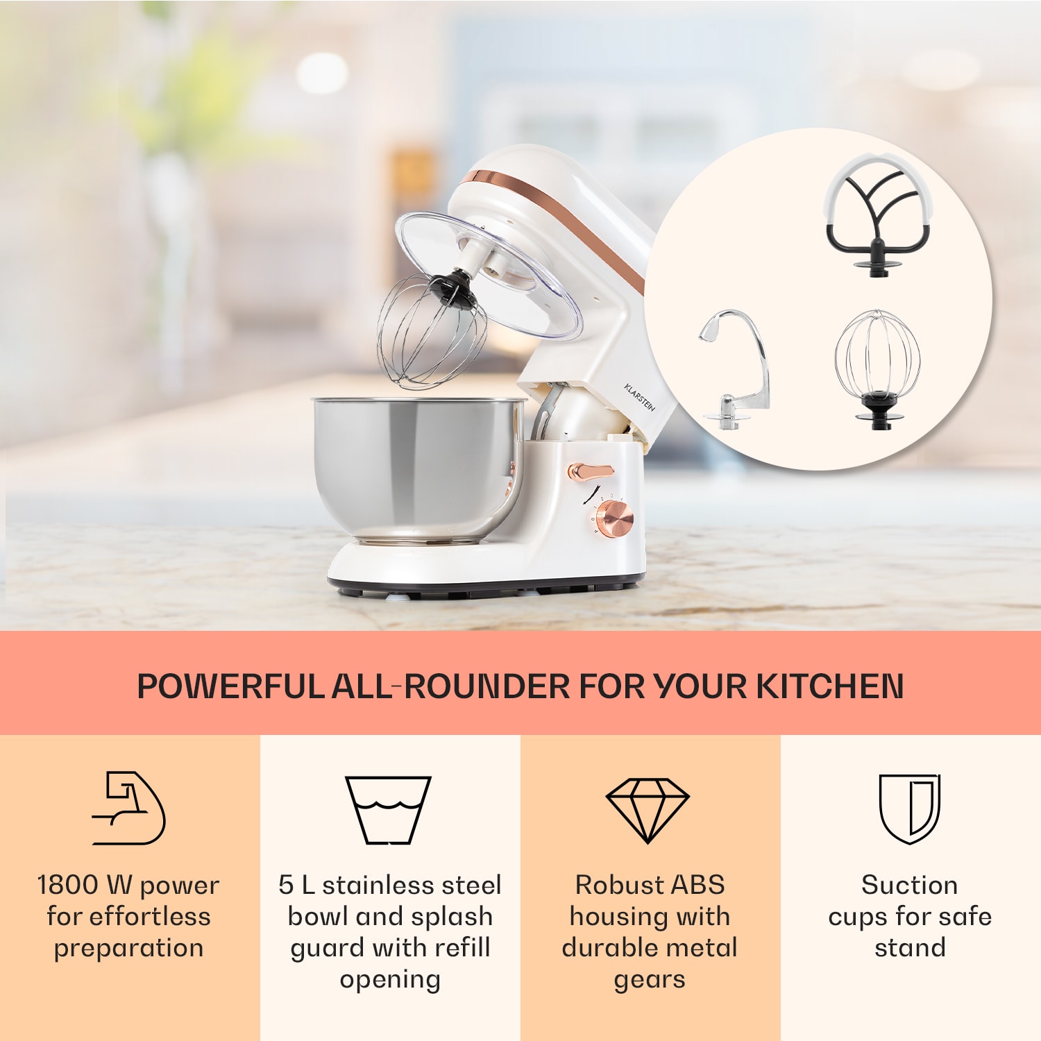 Elegantné zariadenie: kuchynský robot Klarstein Bella Elegance prináša nový výkon s obvykle vysokou kvalitou, jednoduchou obsluhou a elegantným dizajnom.Kuchynský robot Klarstein Bella Elegance je ďalším vývojom našej série kuchynských robotov. Robot je ako obvykle výkonný, kombinovaný s veľkou misou na miešanie s objemom 5 litrov, s mimoriadne výkonným motorom, ktorý vďaka výkonu 1800 W účinne premiesi aj husté kysnuté cestá a s dizajnovou konštrukciou s dotykom elegancie. Bella Elegance tak dokonale a štýlovo pripraví aj veľké množstvo potravín. Osvedčený planetárny miešací systém od spoločnosti Klarstein zabezpečí najlepšie výsledky miešania tým, že miešacie prvky sa netočia len samé okolo seba, ale v miešacej mise krúžia tiež orbitálne. Vďaka tomu sa dostanú prísady od okraja do stredu misky a dosiahne sa optimálne premiešanie. Flexibilný okraj na miešacom háku sa postará o ešte väčšiu dôkladnosť. Vďaka 6 rýchlostiam a pulznej funkcii je Bella Elegance dokonale prispôsobená všetkým požiadavkám moderných kuchýň – od rýchleho šľahania smotany až po jemné miesenie ťažkého chlebového cesta.Súčasťou dodávky je hák na cesto a miešací hák a metlička. Budete mať teda vždy ten správny nadstavec: hnetací hák na chlebové cesto, miešací hák na suroviny so strednou hustotou a metlička na šľahanie smotany alebo masla. Vďaka kompaktnej a peknej konštrukcii z ABS plastu zapôsobí kuchynský robot Klarstein Bella Elegance aj vizuálne – vzhľad podčiarkujú aplikácie v medenej farbe, ktoré zariadeniu dodávajú špeciálny lesk.Preukázaná kvalita a výkon pre najlepšie výsledky miešania v elegantnom prevedení: kuchynský robot Bella Elegance od spoločnosti Klarstein.