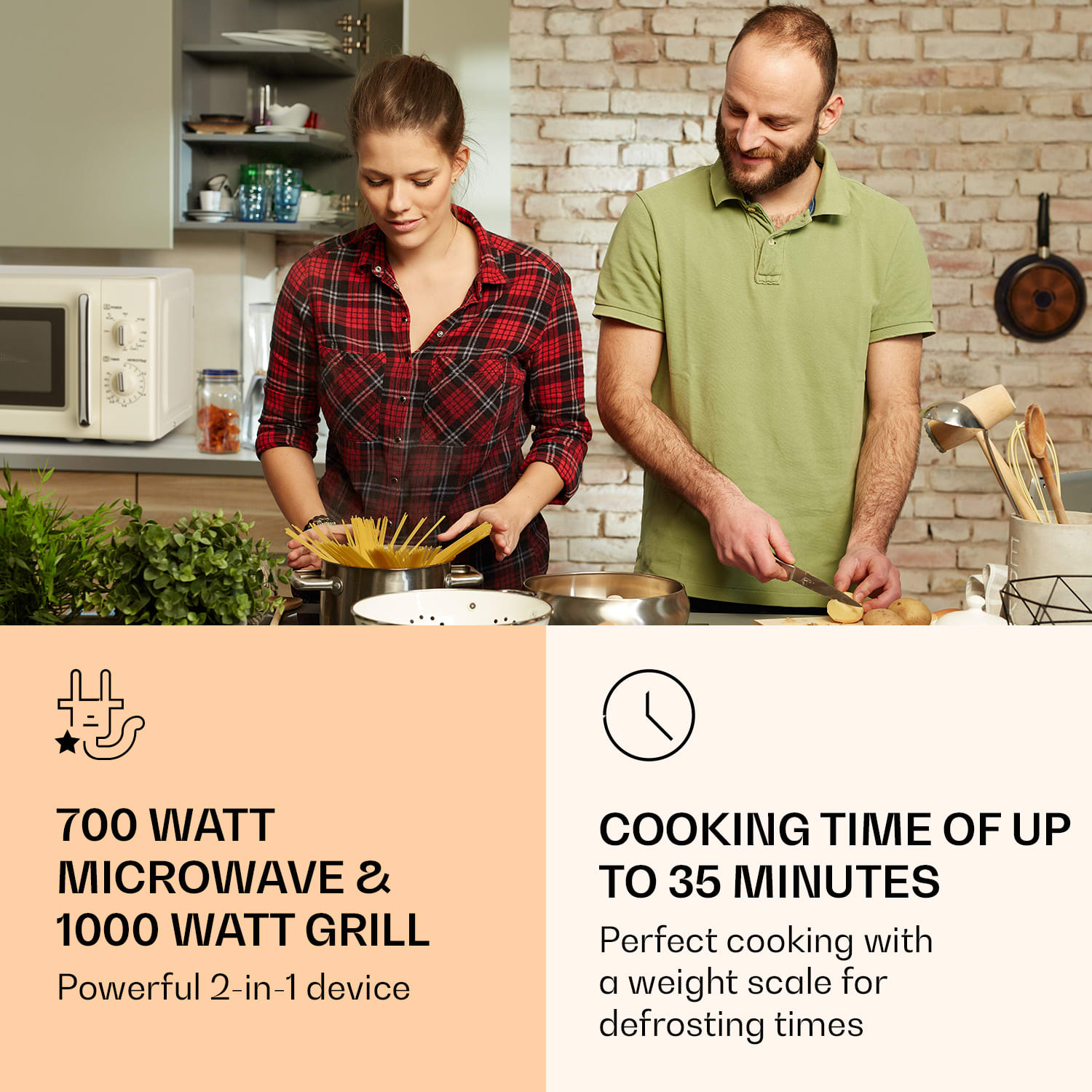 Nesmie chýbať v žiadnej kuchyni: v okamihu uvarte, zohrejte alebo rozmrazte horúce pochúťky a jedlá v mikrovlnnej rúre Klarstein Caroline – a vďaka integrovanému grilu ich pripravíte aj s chrumkavou kôrkou. Mikrovlnná rúra Klarstein Caroline je priestorovo úsporné, všestranné zariadenie pre jednočlenné aj viacčlenné domácnosti, ktoré zjednocuje mikrovlnnú rúru a gril do jedného multifunkčného zariadenia a so svojím retro dizajnom predstavuje ozdobu každej kuchyne. Výkon mikrovlnnej rúry 700 W a kapacita 20 litrov s otočným tanierom s priemerom 25,5 cm sú ideálne pre rýchlu prípravu jedál a občerstvenia alebo na rozmrazovanie a zohrievanie. Integrovaný gril s výkonom 1000 W upečie do chrumkava mäso, klobásy, pizzu alebo lasagne. Technológia Quick Select od spoločnosti Klarstein umožňuje veľmi jednoduché ovládanie. Na zapnutie zariadenia Caroline sú potrebné len dva regulátory. Na regulátore napájania zvoľte jednu z 5 výkonnostných úrovní mikrovlnnej rúry, jeden z 3 kombinovaných programov alebo jednoducho len funkciu grilovania. Potom nastavte časovač na určitý čas pečenia až do 35 minút a spustí sa kombinácia mikrovlnnej rúry a grilu. Obzvlášť praktické: funkcia rozmrazovania má váhovú stupnicu zodpovedajúcu časovému regulátoru na nastavenie potrebného pracovného času. Exteriér a interiér mikrovlnnej rúry Klarstein Caroline je z ušľachtilej ocele, zariadenie má oblé tvary a chrómované prvky v retro vzhľade 50-tych rokov. Skutočná ozdoba každej kuchyne.