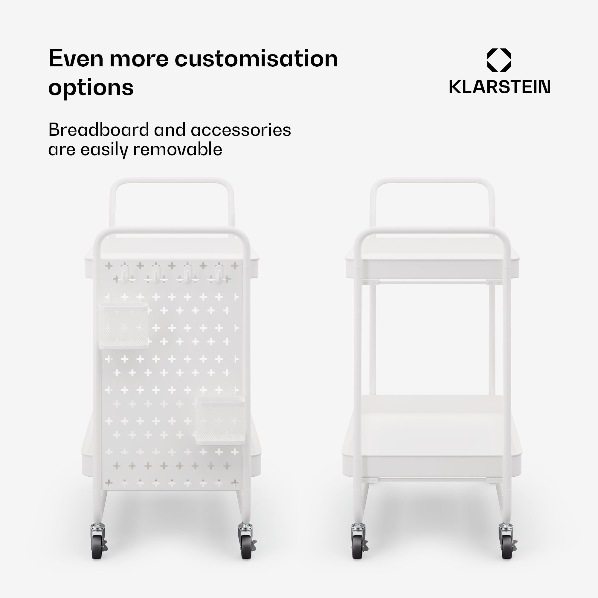 Luxus pre kuchyňu, jedáleň a obývaciu izbu: kuchynský vozík Klarstein Chibije tu vždy, keď potrebujete viac miesta a je pastvou pre oči medzi kuchynskými komorníkmi. Vozík Chibi je celý vyrobený z kovu a zameriava sa na stabilitu a štýl.Miesto na všetko: servírovací vozík Klarstein Chibi disponuje 2 policami na prehľadné uloženie riadu, zásob, uterákov, kozmetiky kúpeľňového náčinia . To zaisťujú police, 2 košíky a 4 priložené háčiky, ktoré je možné jednotlivo pripevniť na dosku. Vďaka kolieskam z tvrdej gumy sa servírovací vozík hladko pohybuje aj po kobercoch. Kuchynský komorník s radosťou vykonáva svoju prácu ako príborník alebo príručný stolík.Ušľachtilý a kvalitný: Vozík Klarstein Chibi je vaša elegantná kovová organizačná pomôcka pre jednoduchú obsluhu.