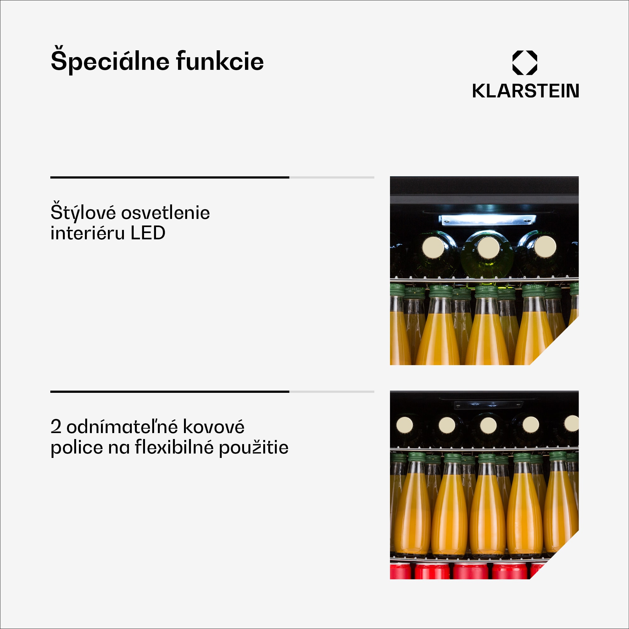 Najlepšie osvieženie za každých okolností: Kompaktná chladnička na nápoje Coachella 50 Onyx od Klarstein s objemom 47 litrov. Vďaka integrovanej funkcii WiFi môžete pohodlne regulovať teplotu v rozsahu 3-18 °C aj na diaľku, kedykoľvek pomocou aplikácie Klarstein. Inteligentná chladnička má vďaka Balanced Light Concept aj podsvietenie, ktoré vytvára príjemnú atmosféru a ktoré rozžiari jej okolie až v 7 rôznych odtieňoch. Dve kovové police poskytujú dostatok priestoru na potraviny a nápoje, zatiaľ čo vnútorné LED osvetlenie poskytuje ten najlepší prehľad. Dotykový ovládací panel umožňuje pohodlnú a prehľadnú obsluhu priamo na zariadení.Chladnička Coachella 50 Onyx od Klarsteinzaujme inteligentnými funkciami a spoľahlivo udrží vaše nápoje pri osviežujúcej teplote.