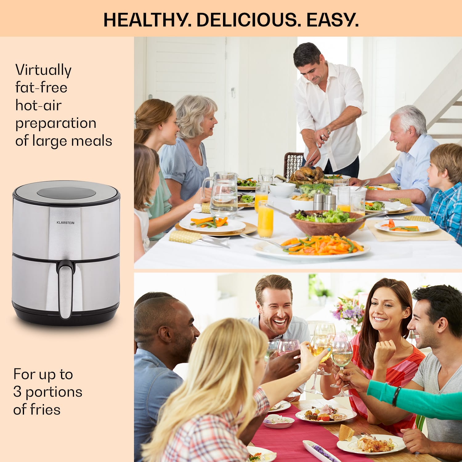 Raz, dva, tri, a je to chrumkavé! Teplovzdušná fritéza Pro-Crisp od Klarstein vám rýchlo a jednoducho pripraví fritované pochúťky, ako sú hranolky, kuracie krídla, krokety a mnoho ďalších, všetko s nízkym obsahom tuku, a teda zdravým spôsobom.Vďaka cirkulujúcemu horúcemu vzduchu fritéza Pro-Crisp frituje, pečie, griluje alebo opeká s výkonom 1500 W a jedlo pripravý šetrne a rýchlo zo všetkých strán. Rozmrazovanie nie je potrebné. Air Fryer s objemom 4,3 litra ponúka extra veľa priestoru na hranolky, kuracie stehná, ryby alebo zeleninu. Teplotu a čas prípravy môžete naprogramovať samostatne alebo použiť jeden z 8 prednastavených programov. Aby ste po jedle všetko rýchlo a jednoducho všetko zvládli, fritovacia nádoba je potiahnutá nepriľnavou vrstvou a dá sa vyčistiť za okamih. AJ nádoba a grilovací rošt sú vhodné do umývačky riadu. Objavte zdravý a chrumkavý spôsob fritovania s teplovzdušnou fritézou Pro-Crisp od Klarstein.